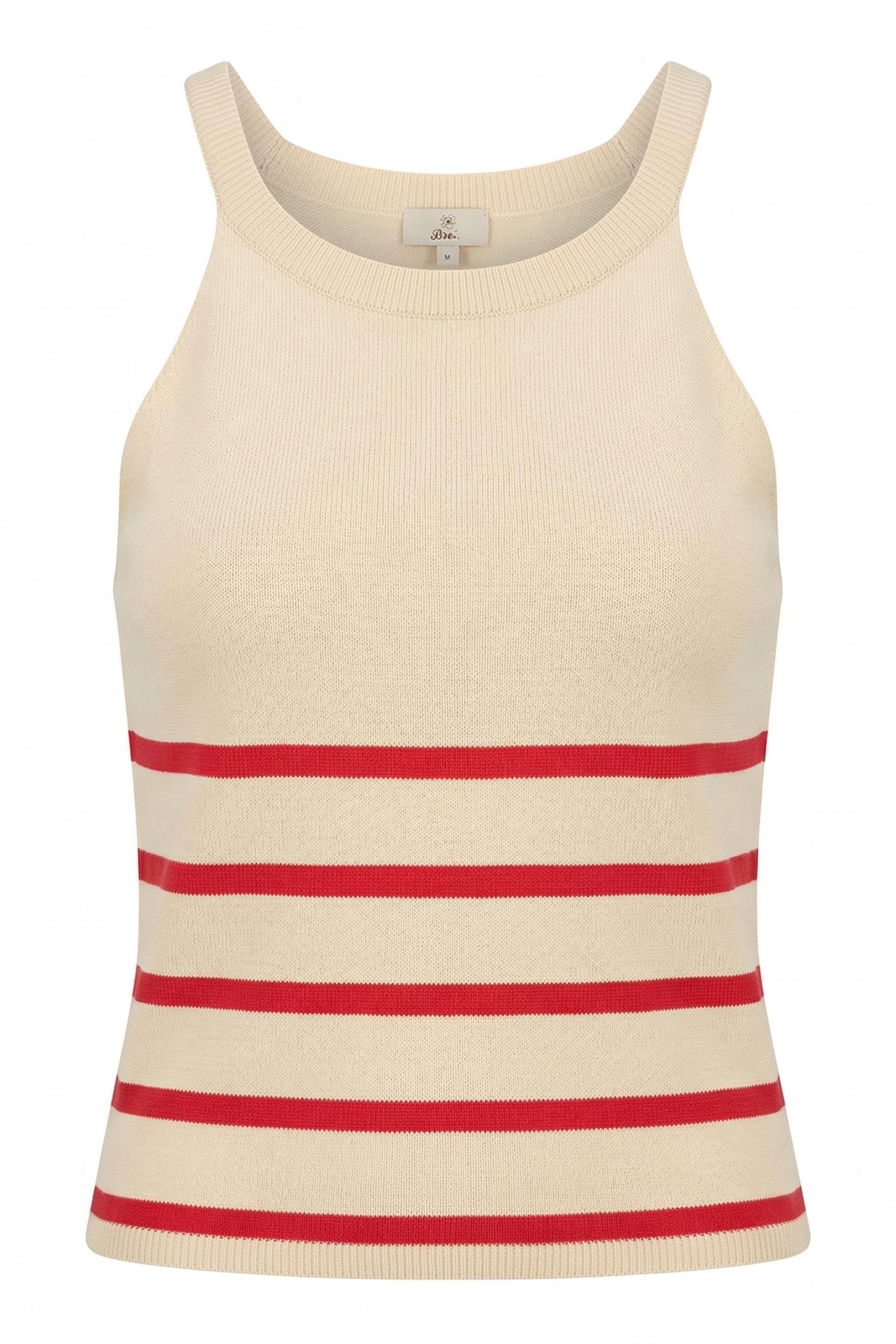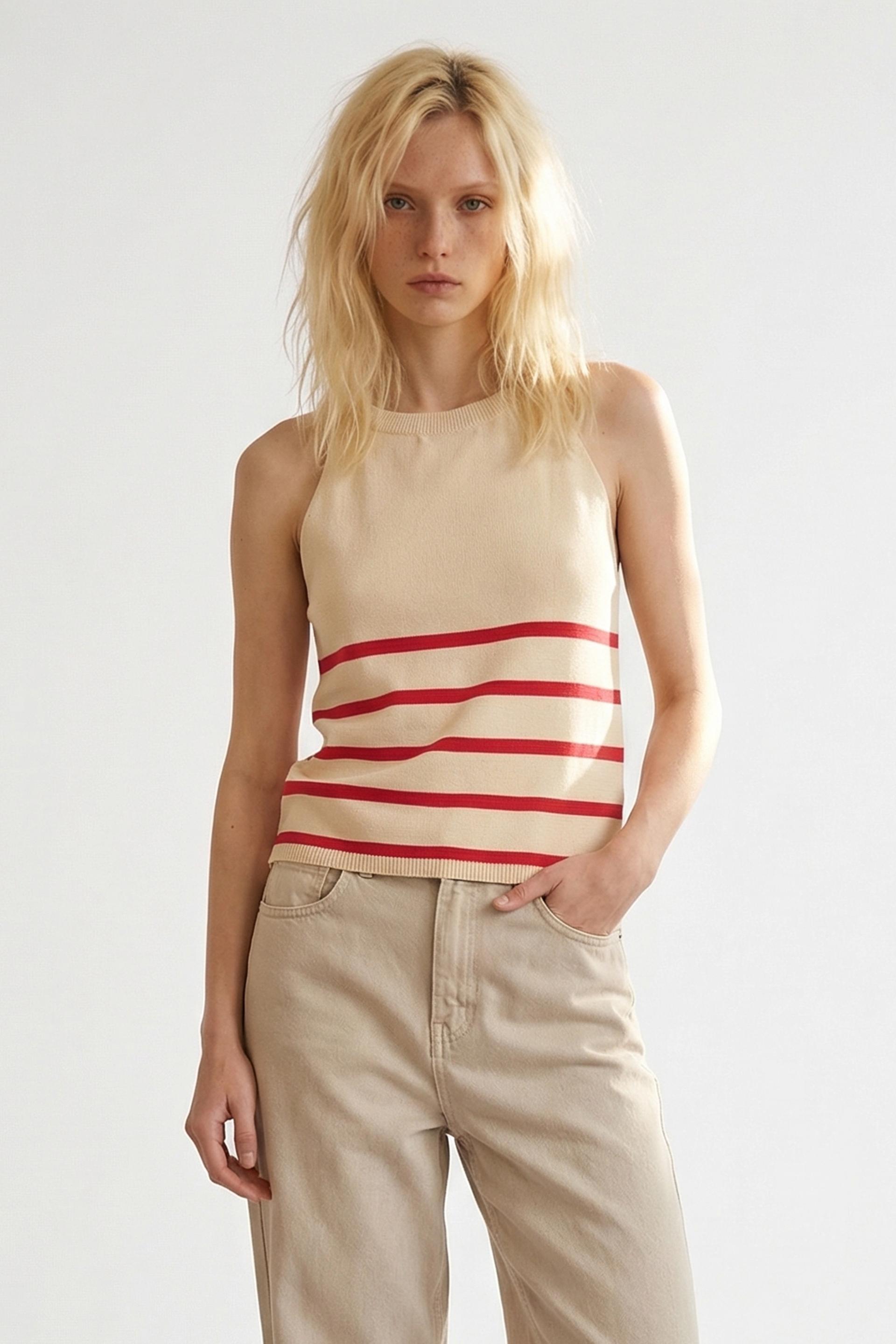 | Top in maglia di viscosa con dettaglio di righe a contrasto frontali. | ||