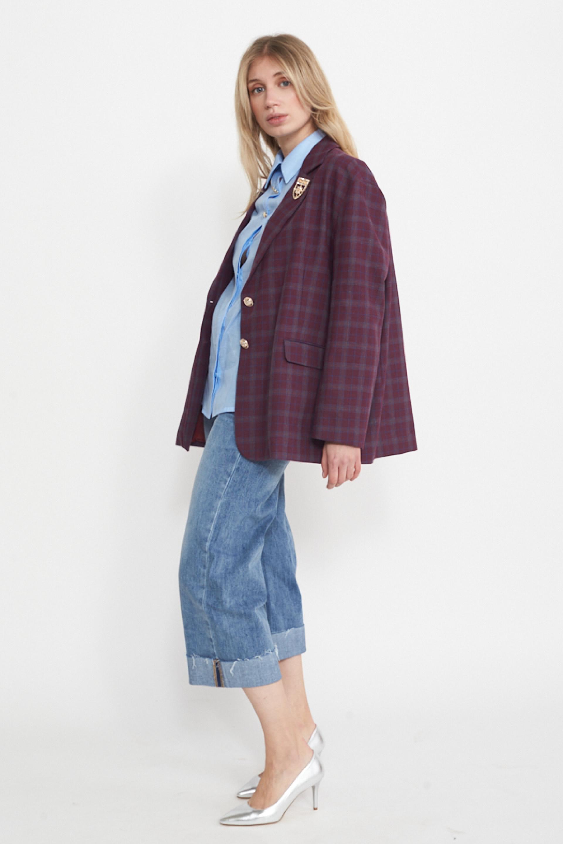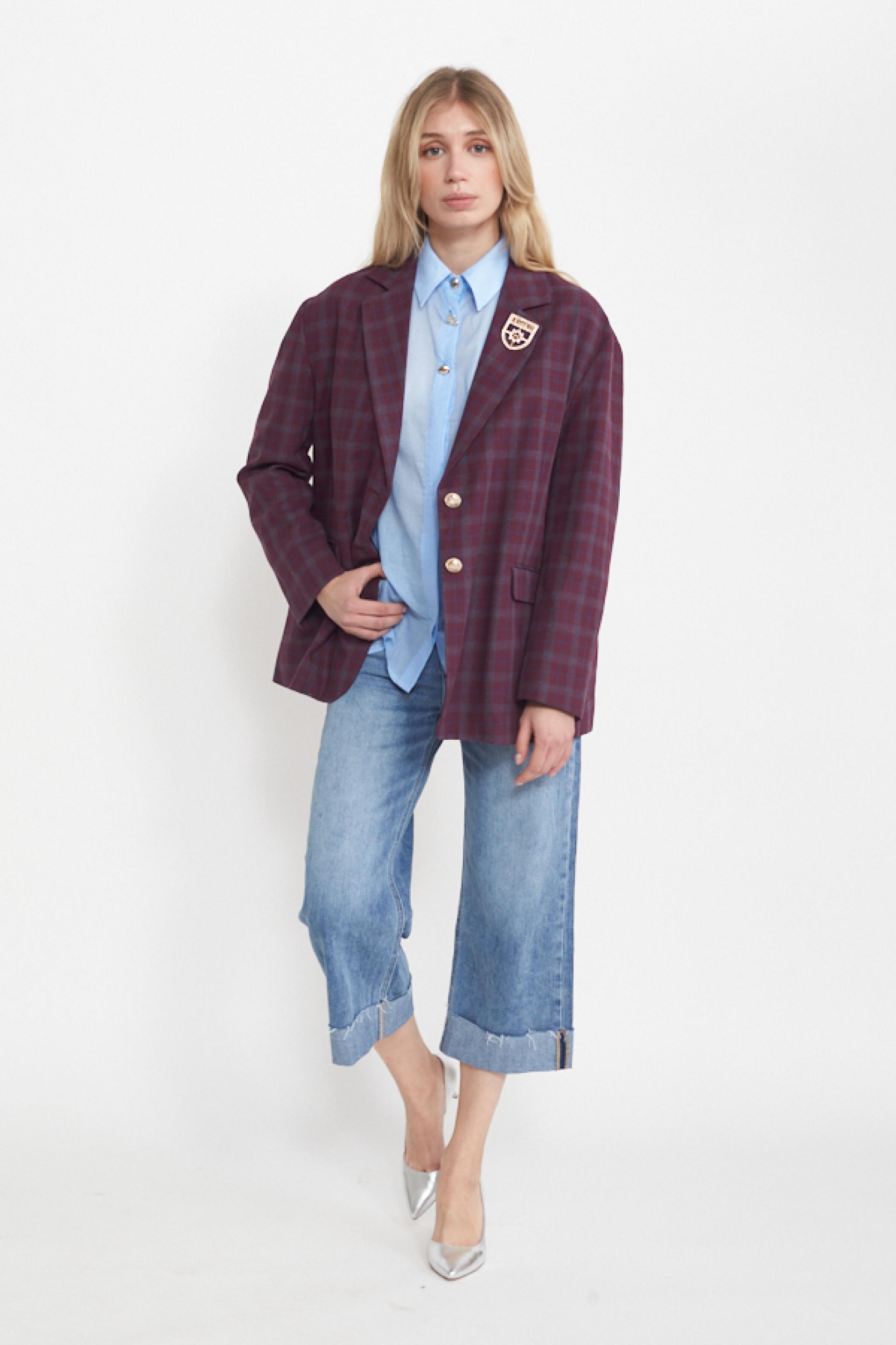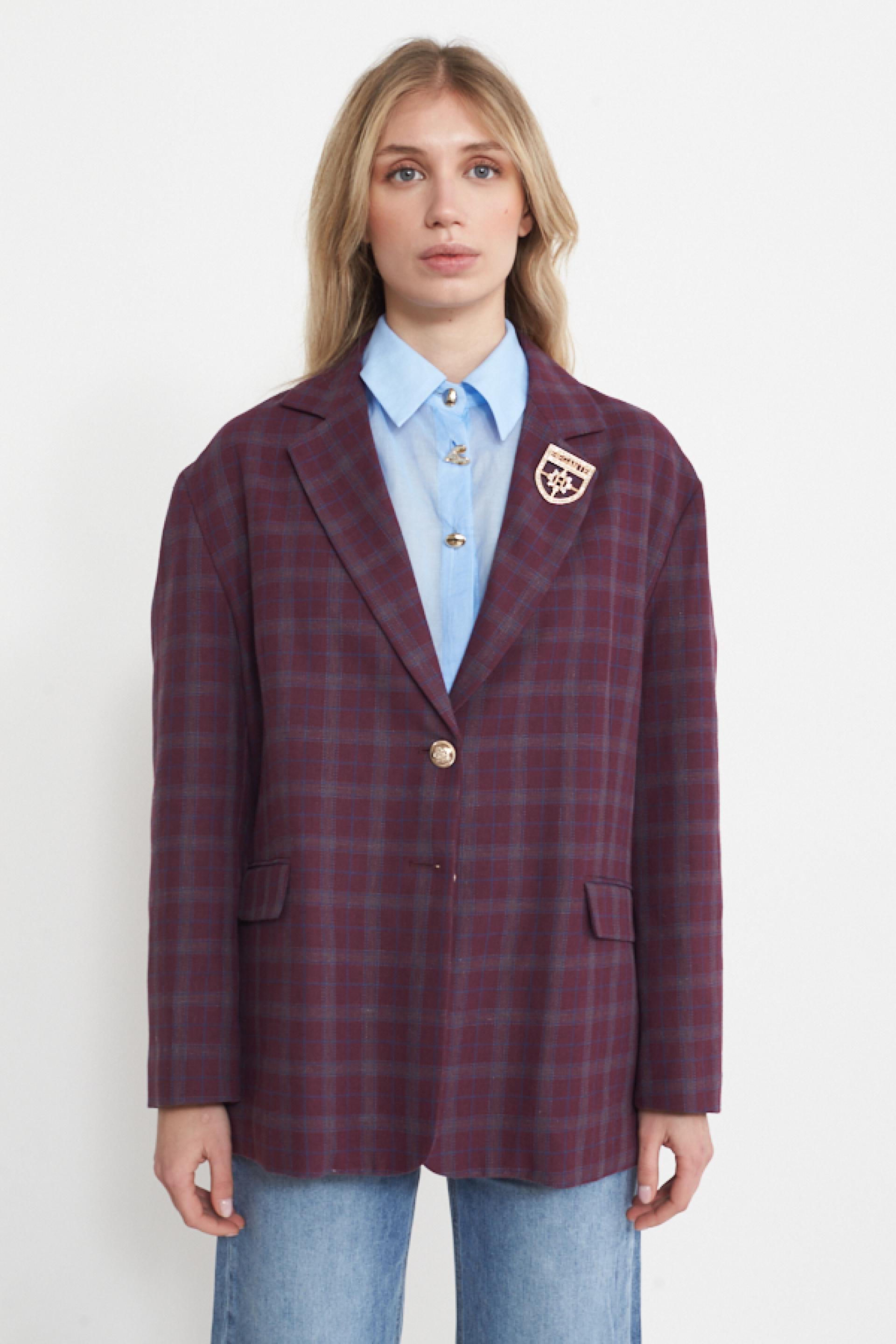 Giacca modello over in misto lino-cotone a fantasia check con collo revers. Dettaglio di spilla e finte tasche con pattina. Fodera interna e chiusura tramite 2 bottoni decoro. | ||