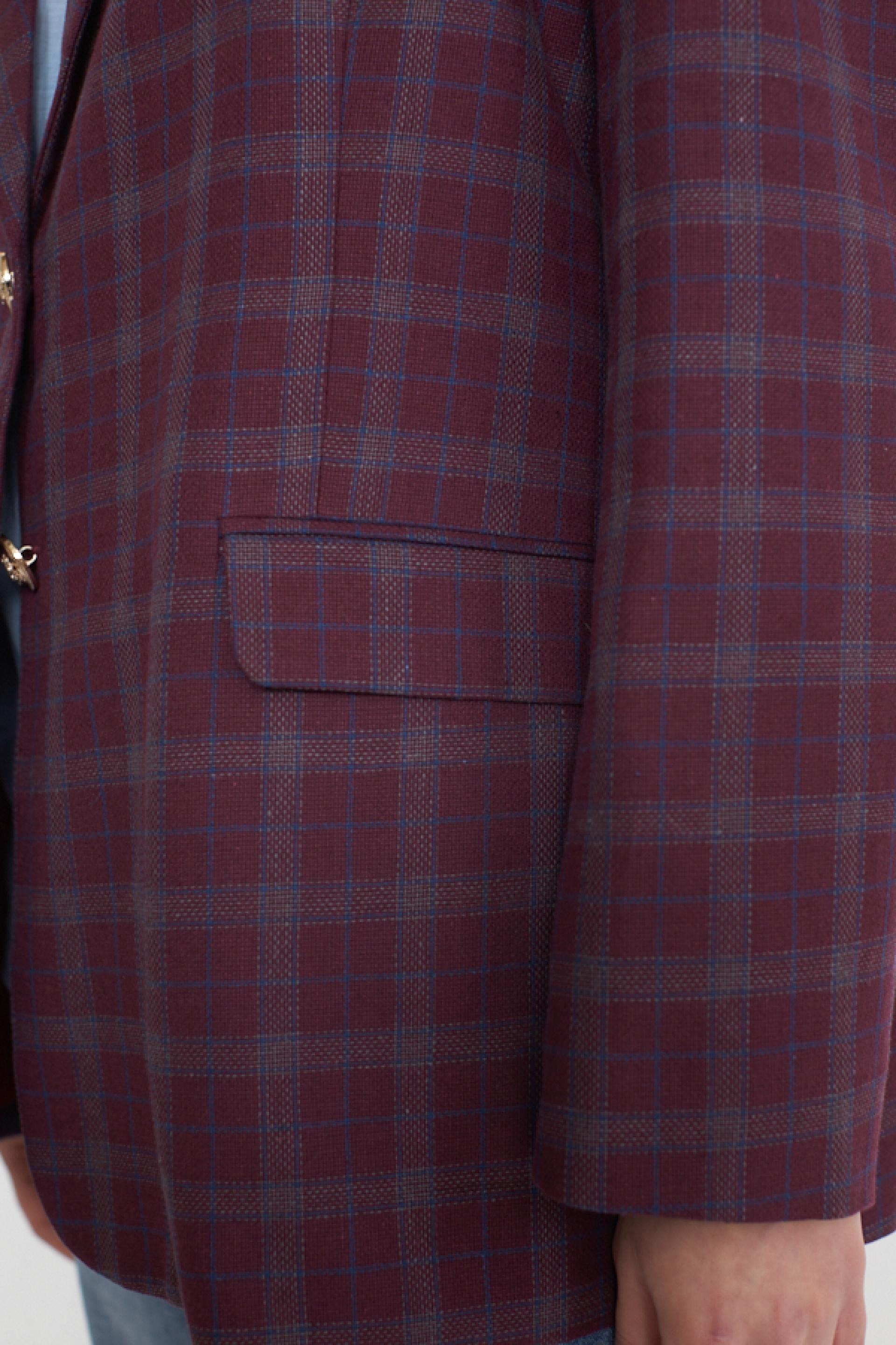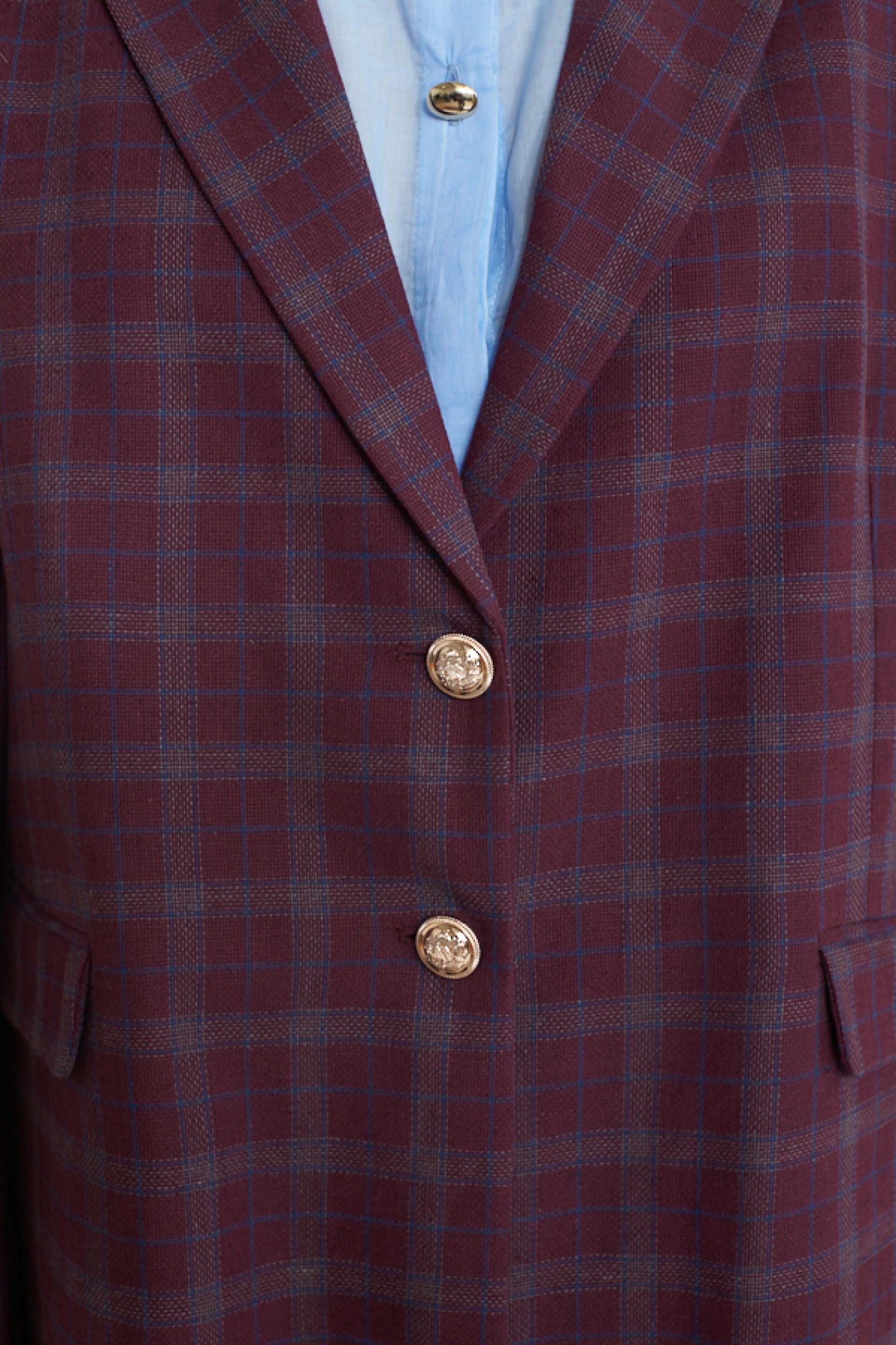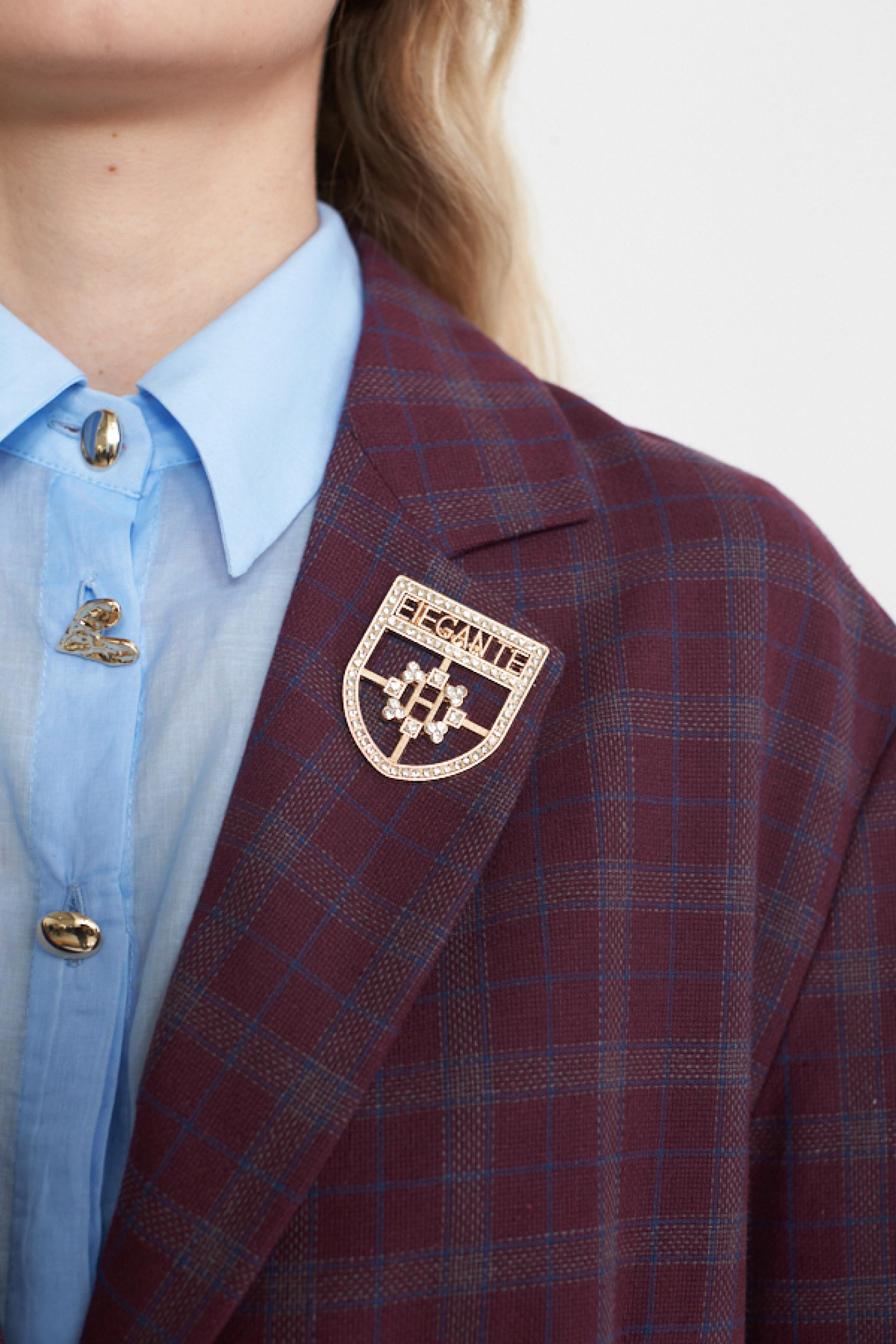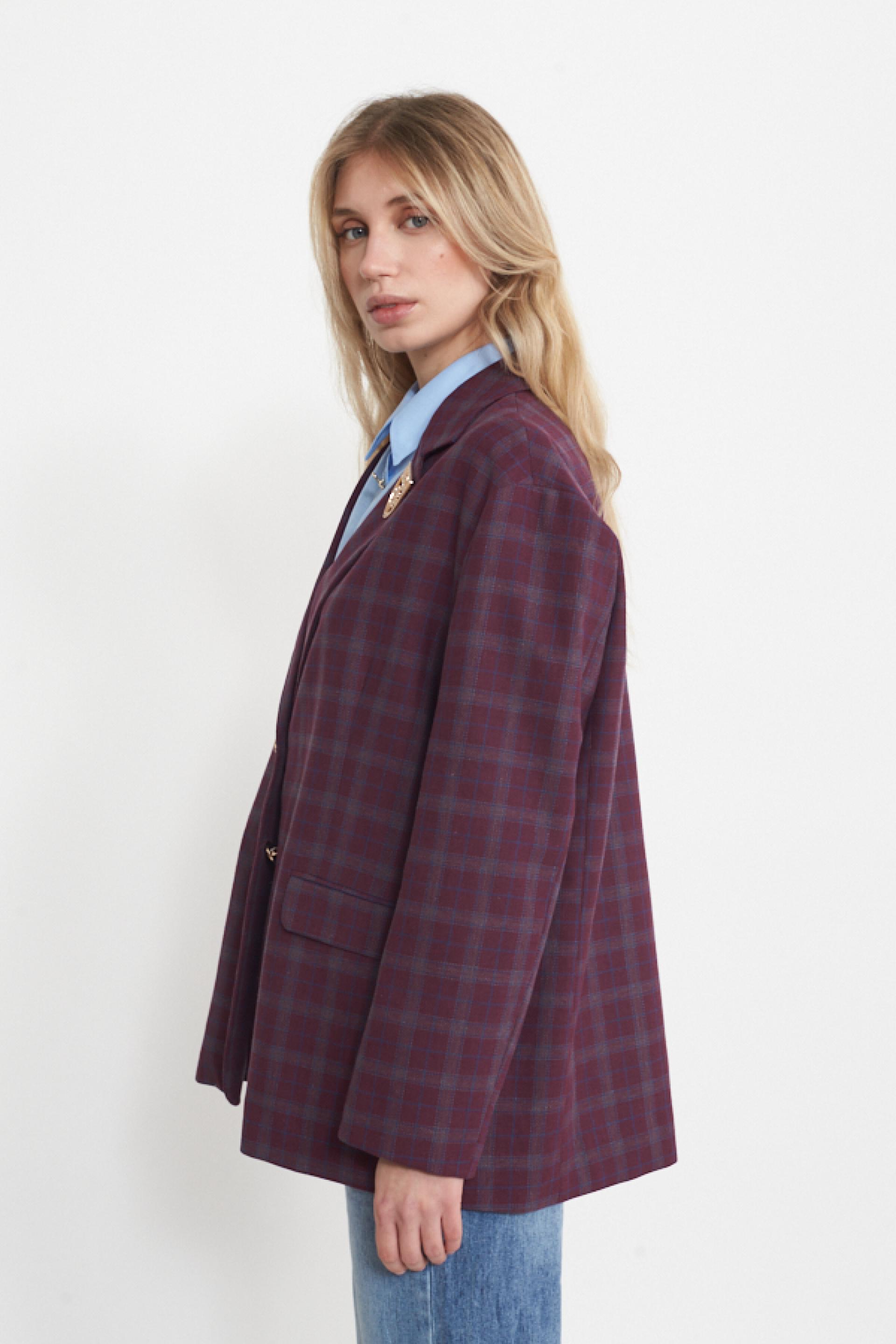 Giacca modello over in misto lino-cotone a fantasia check con collo revers. Dettaglio di spilla e finte tasche con pattina. Fodera interna e chiusura tramite 2 bottoni decoro. | ||