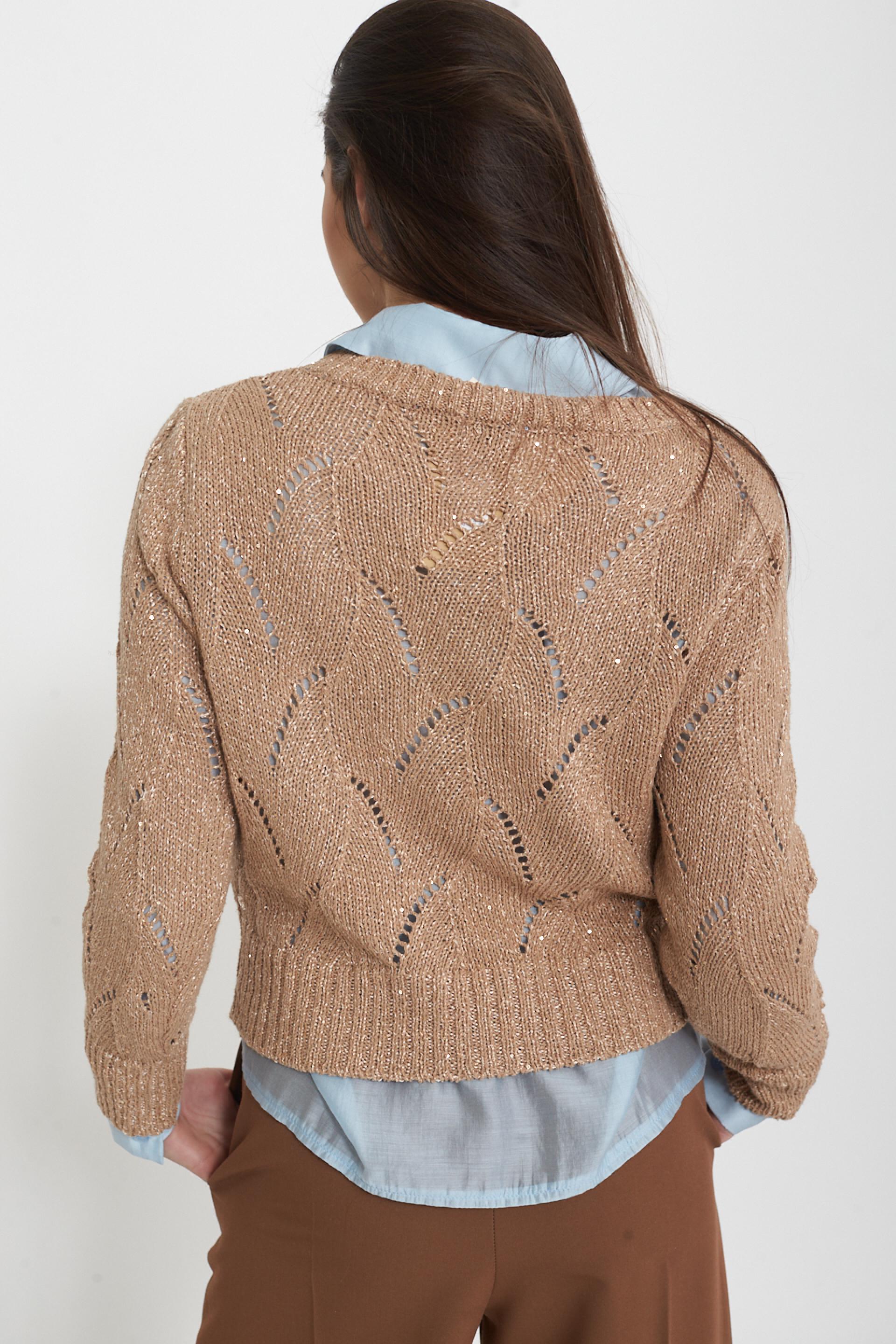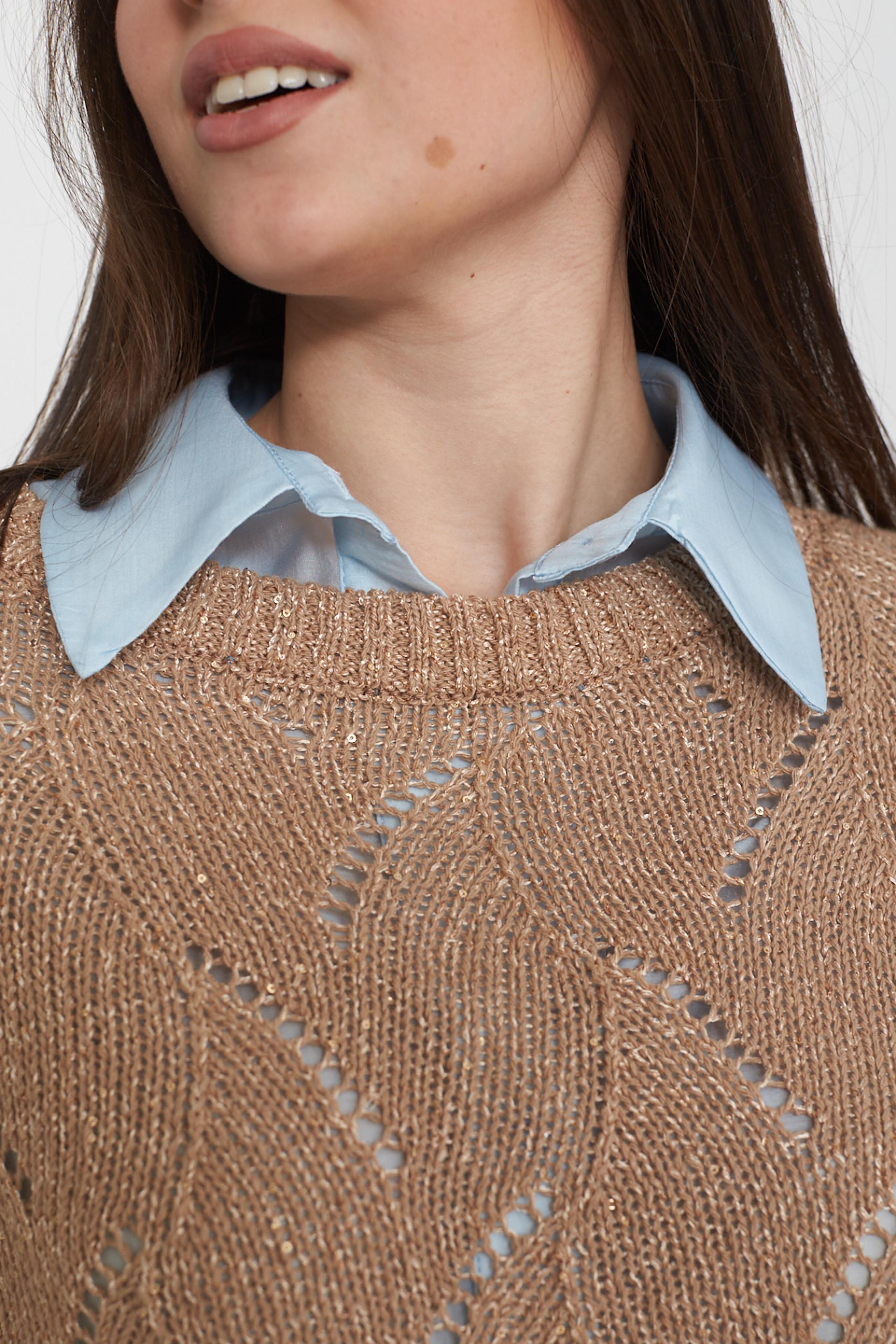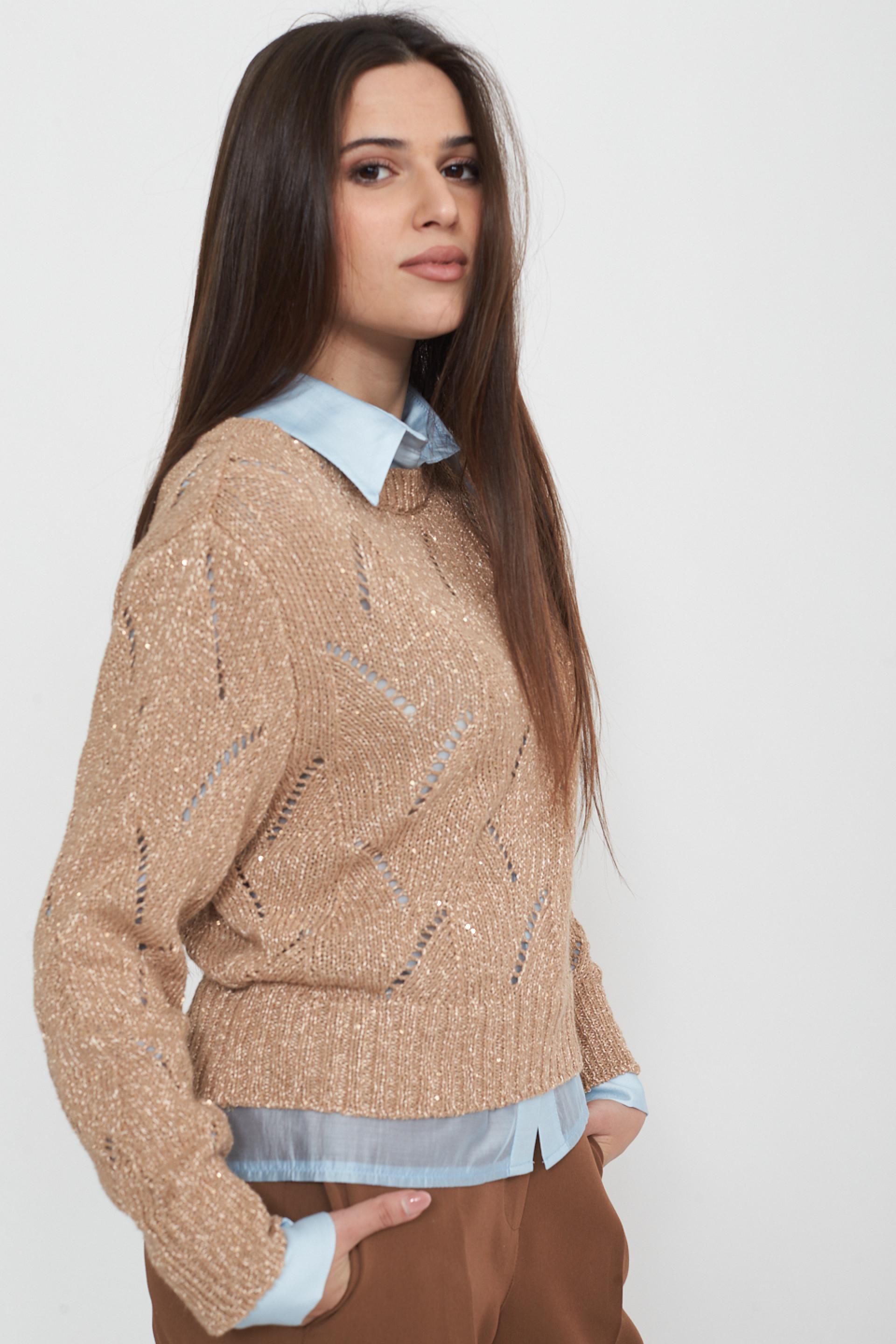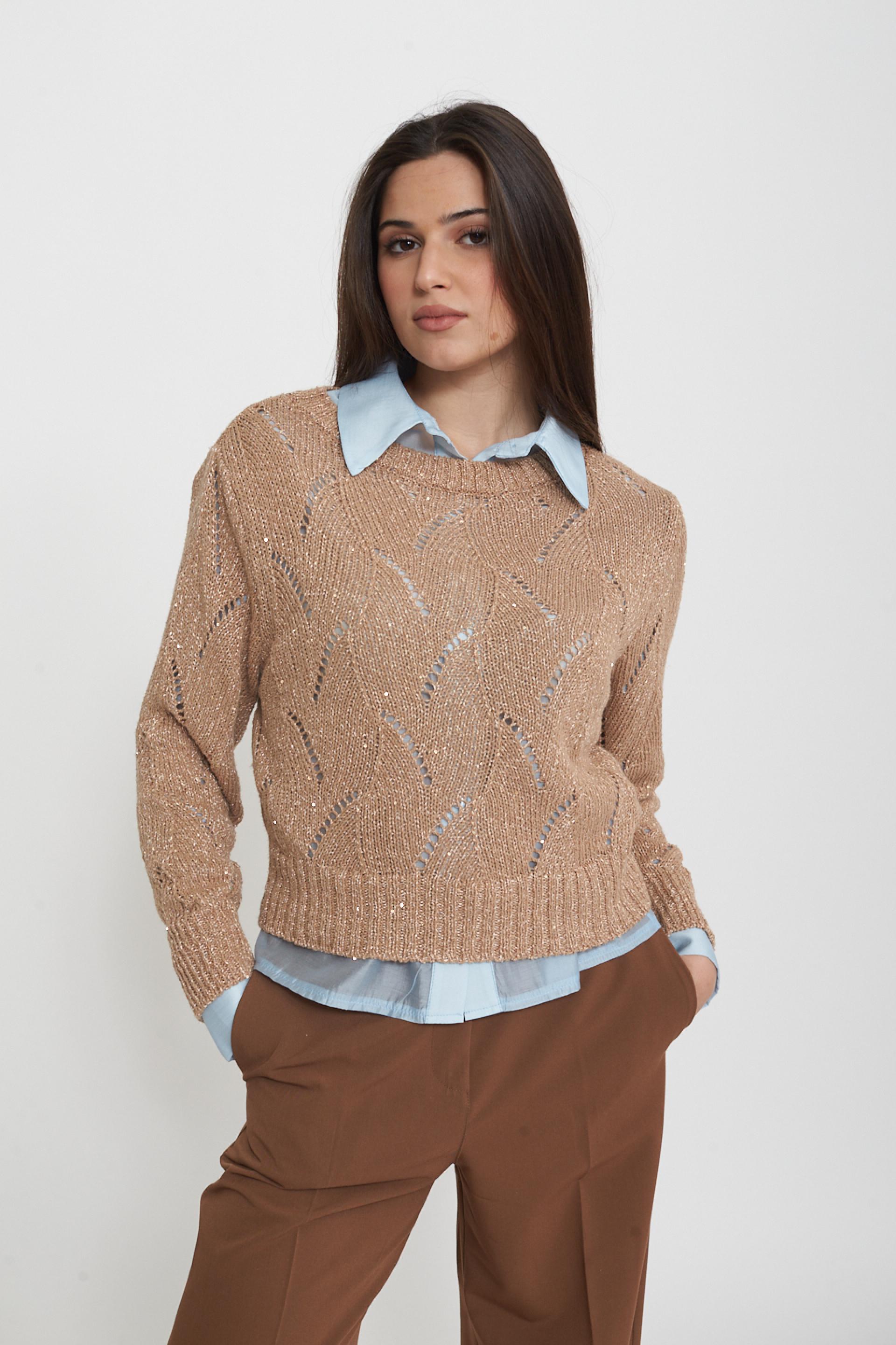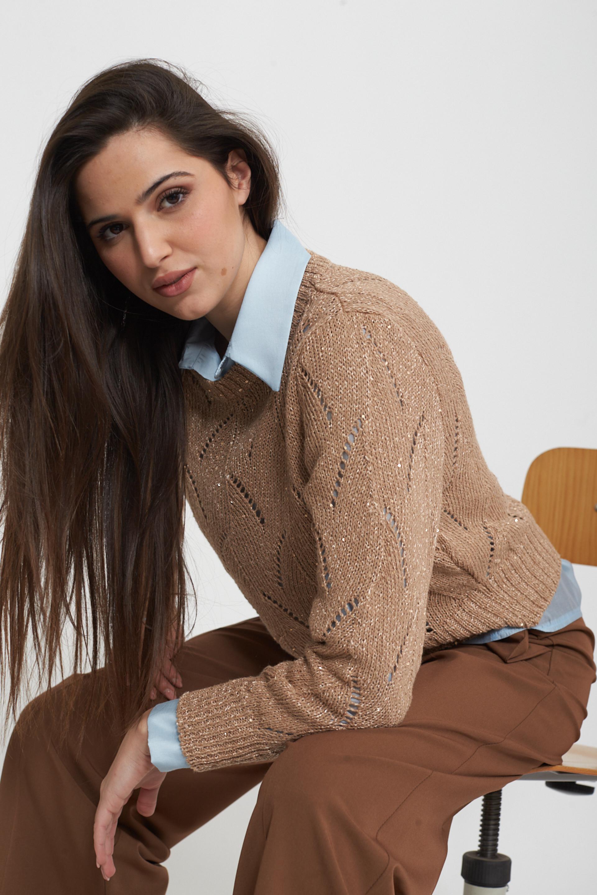 | Maglia paricollo laminata con dettaglio di piccoli trafori. Lavorazione a coste su scollo, orlo e polsini. | ||