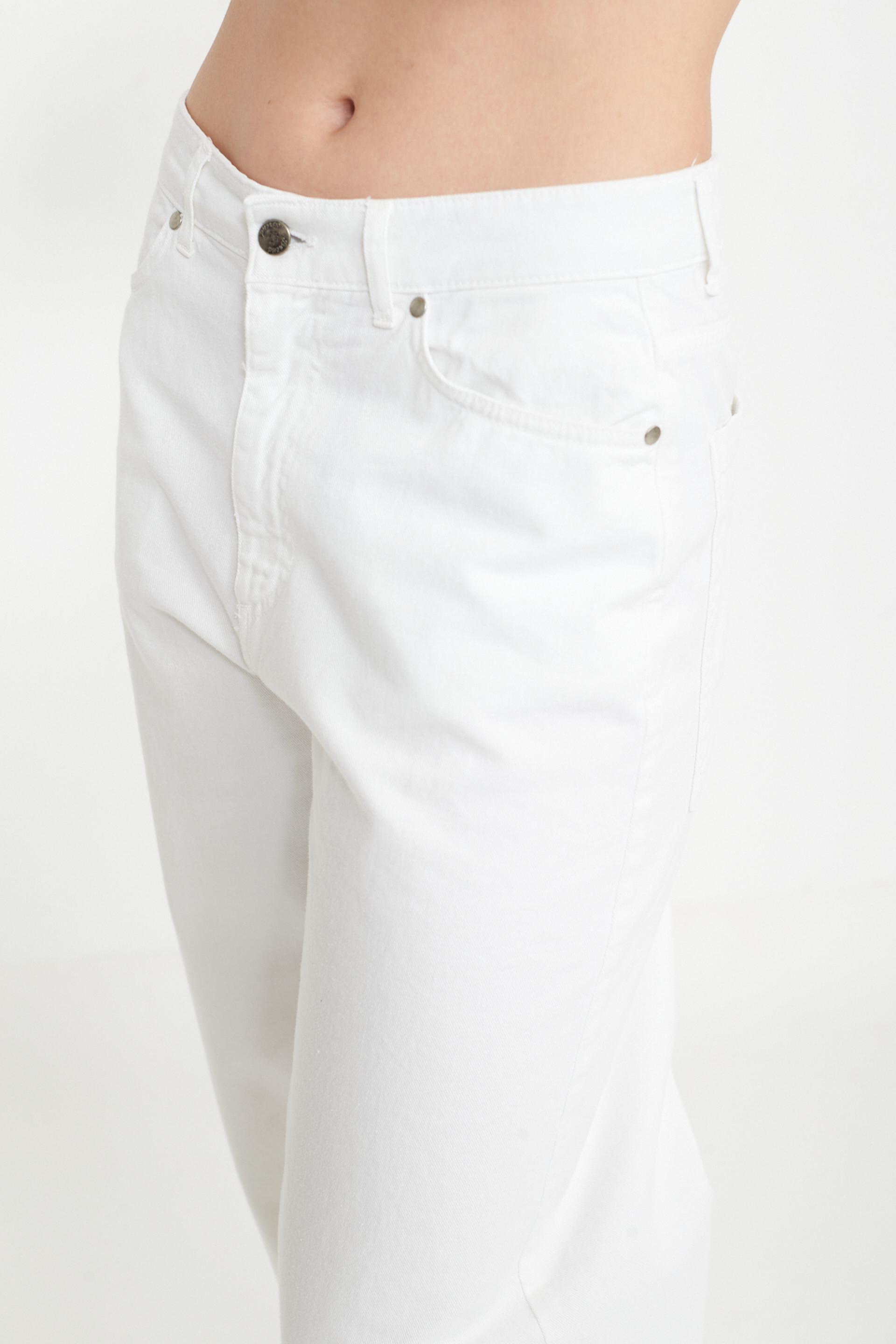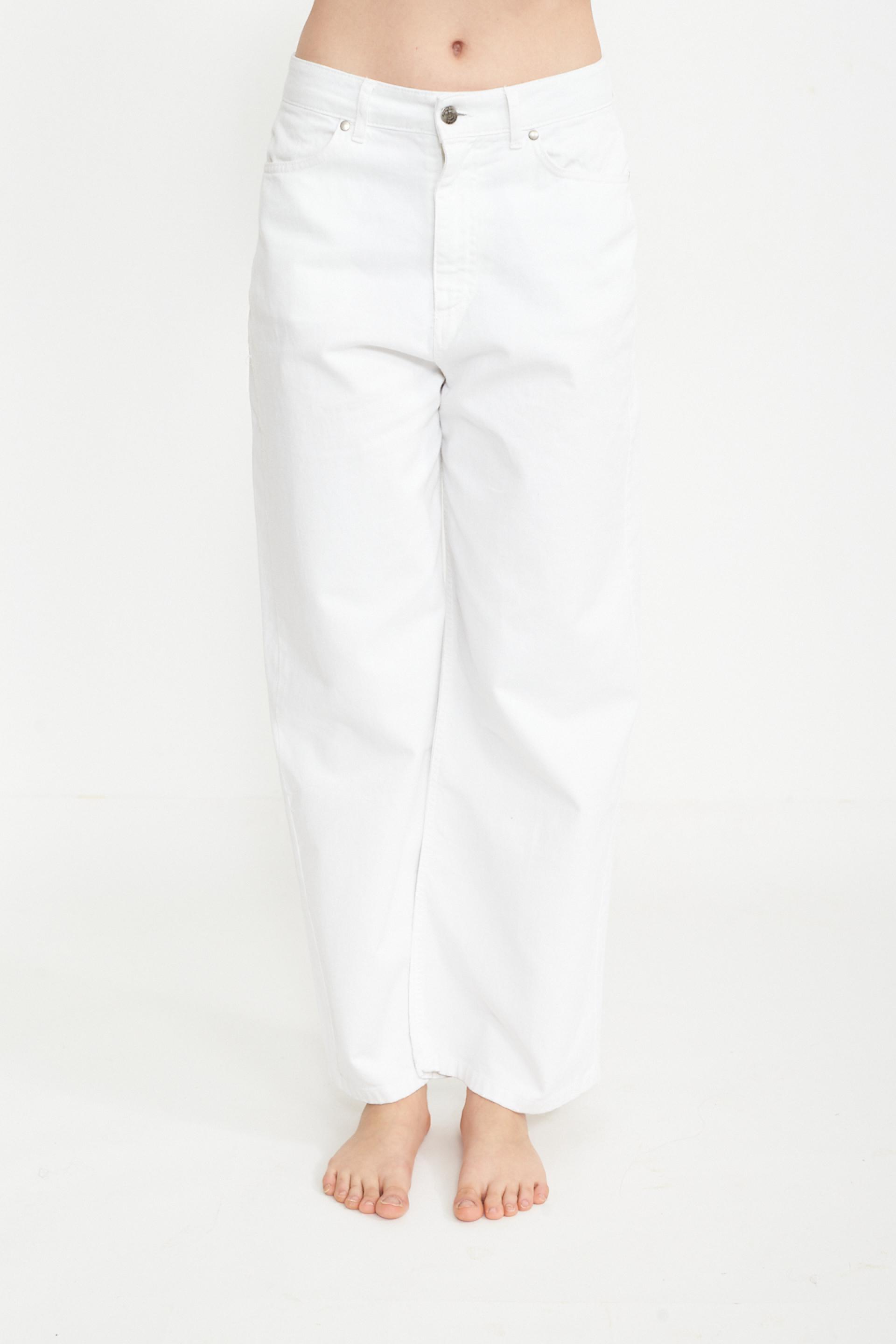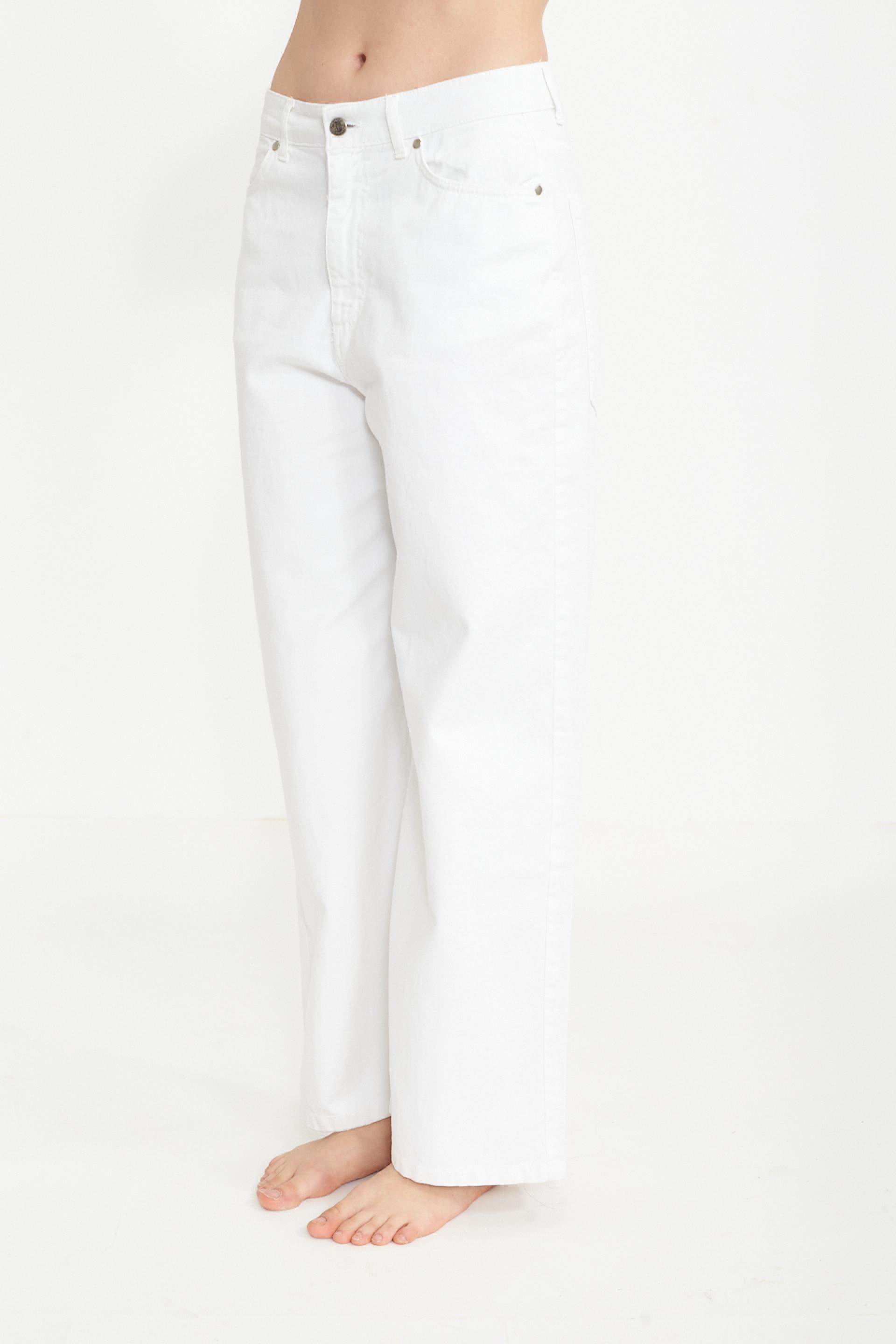 | Pantalone palazzo in cotone tinto con tasconi posteriori. Targhetta posteriore di cuoio loggata. Chiusura tramite bottone metallico loggato e cerniera. | ||