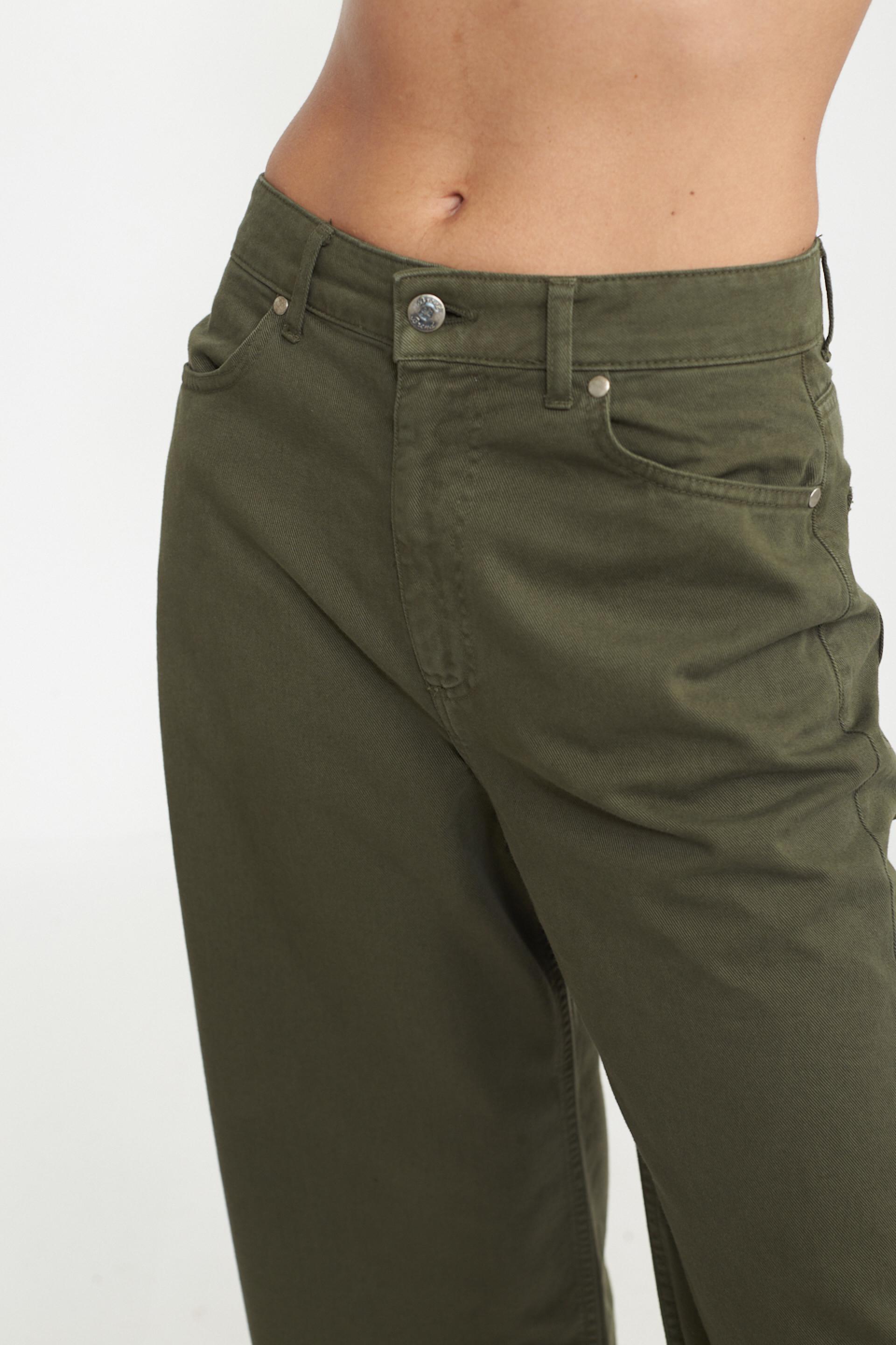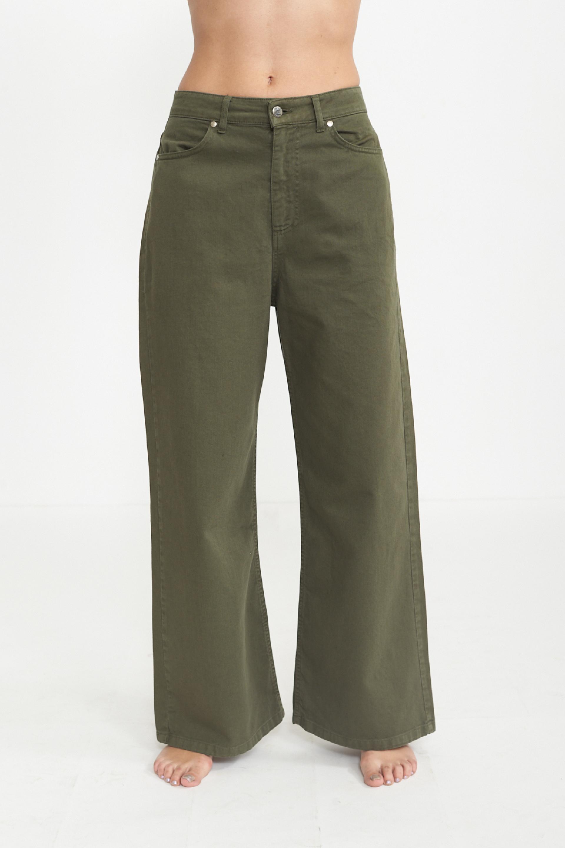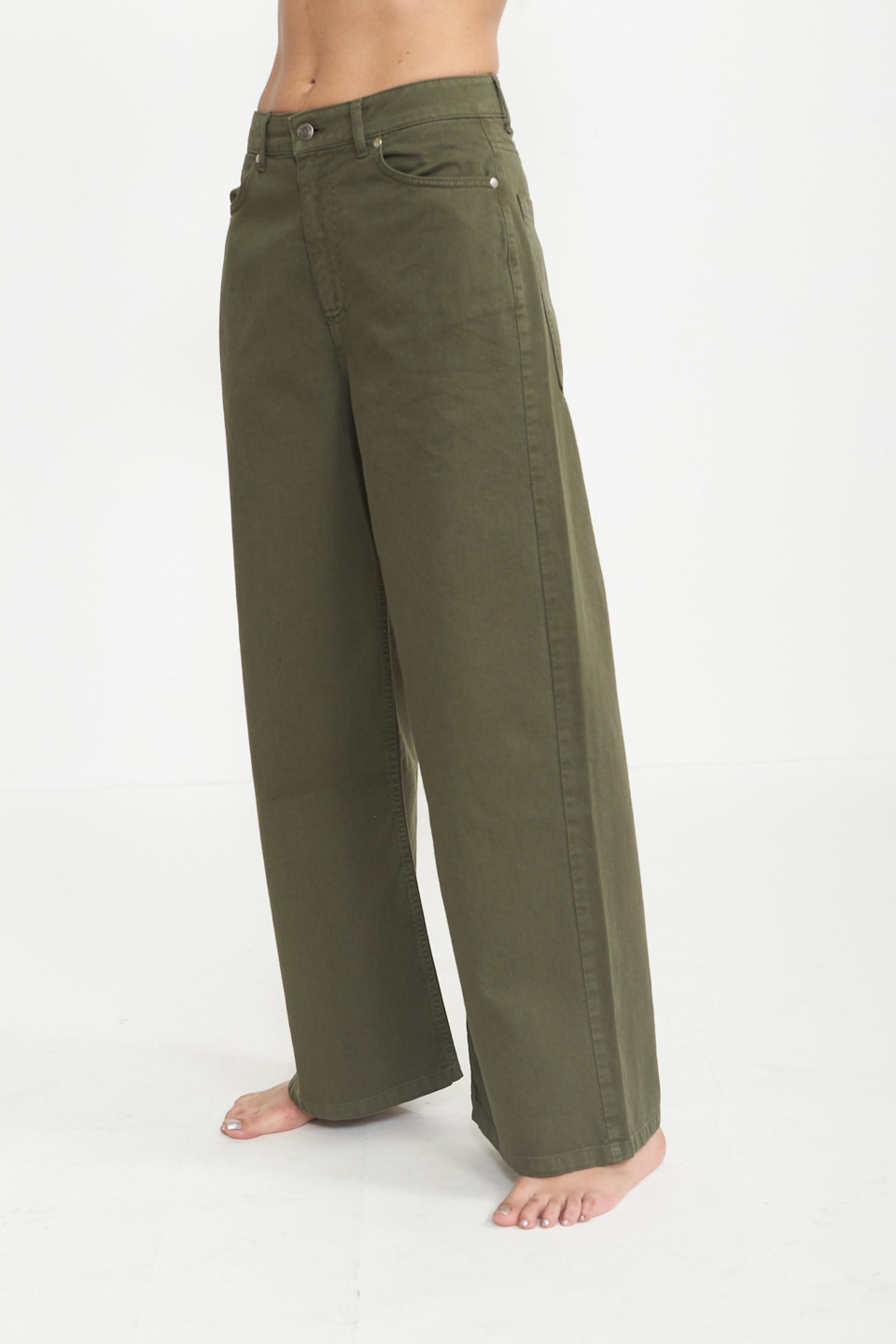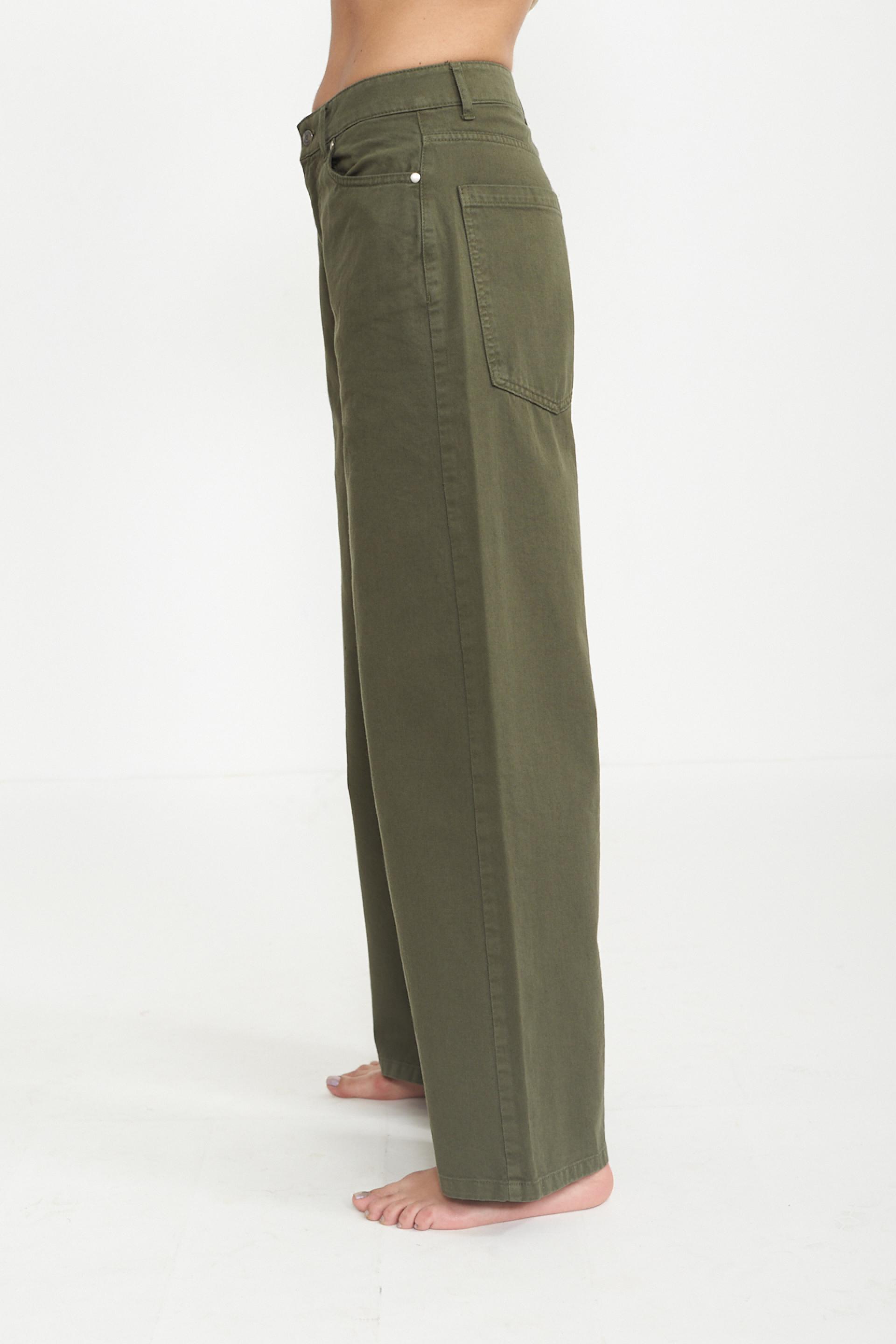 | Pantalone palazzo in cotone tinto con tasconi posteriori. Targhetta posteriore di cuoio loggata. Chiusura tramite bottone metallico loggato e cerniera. | ||