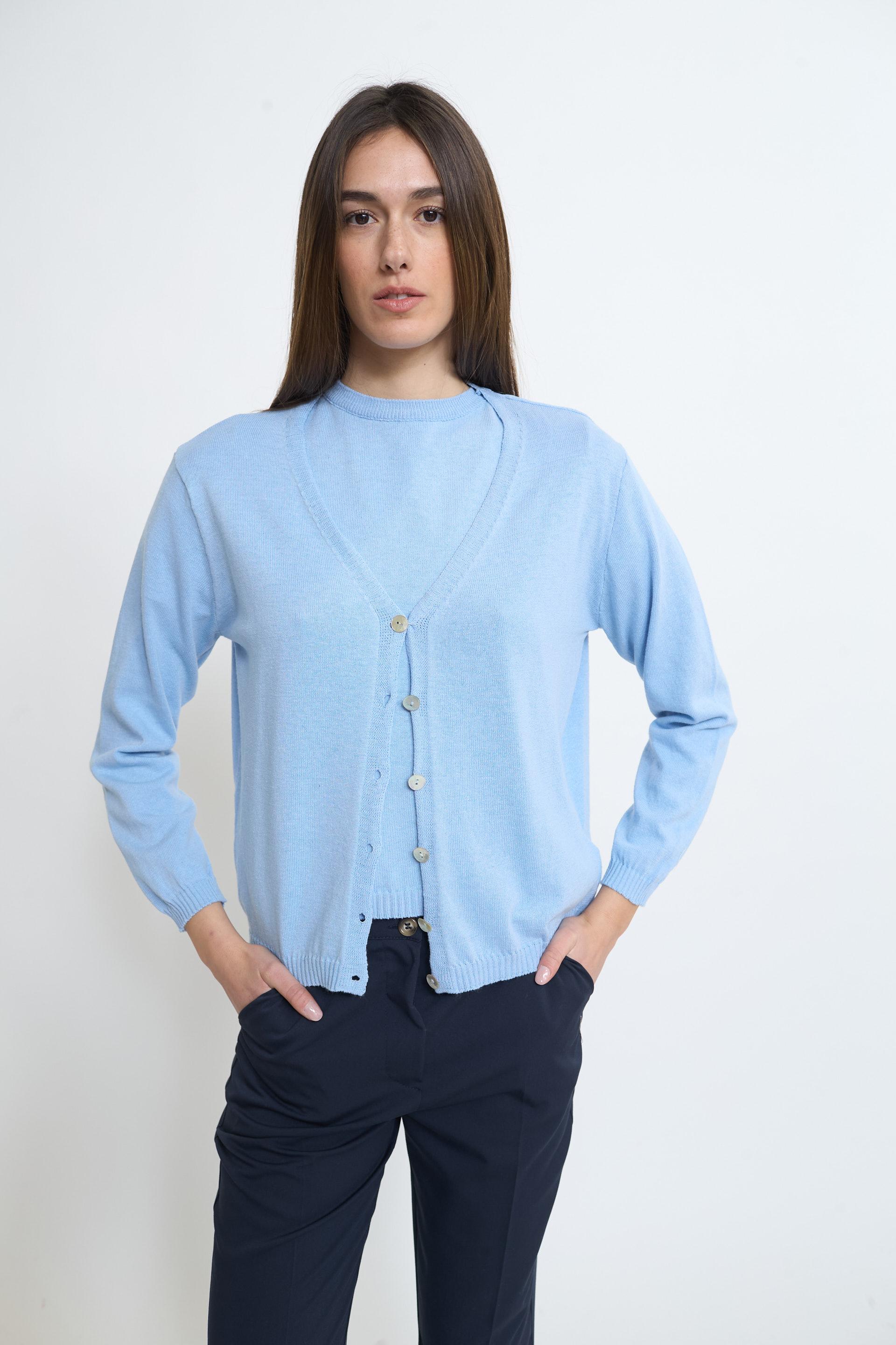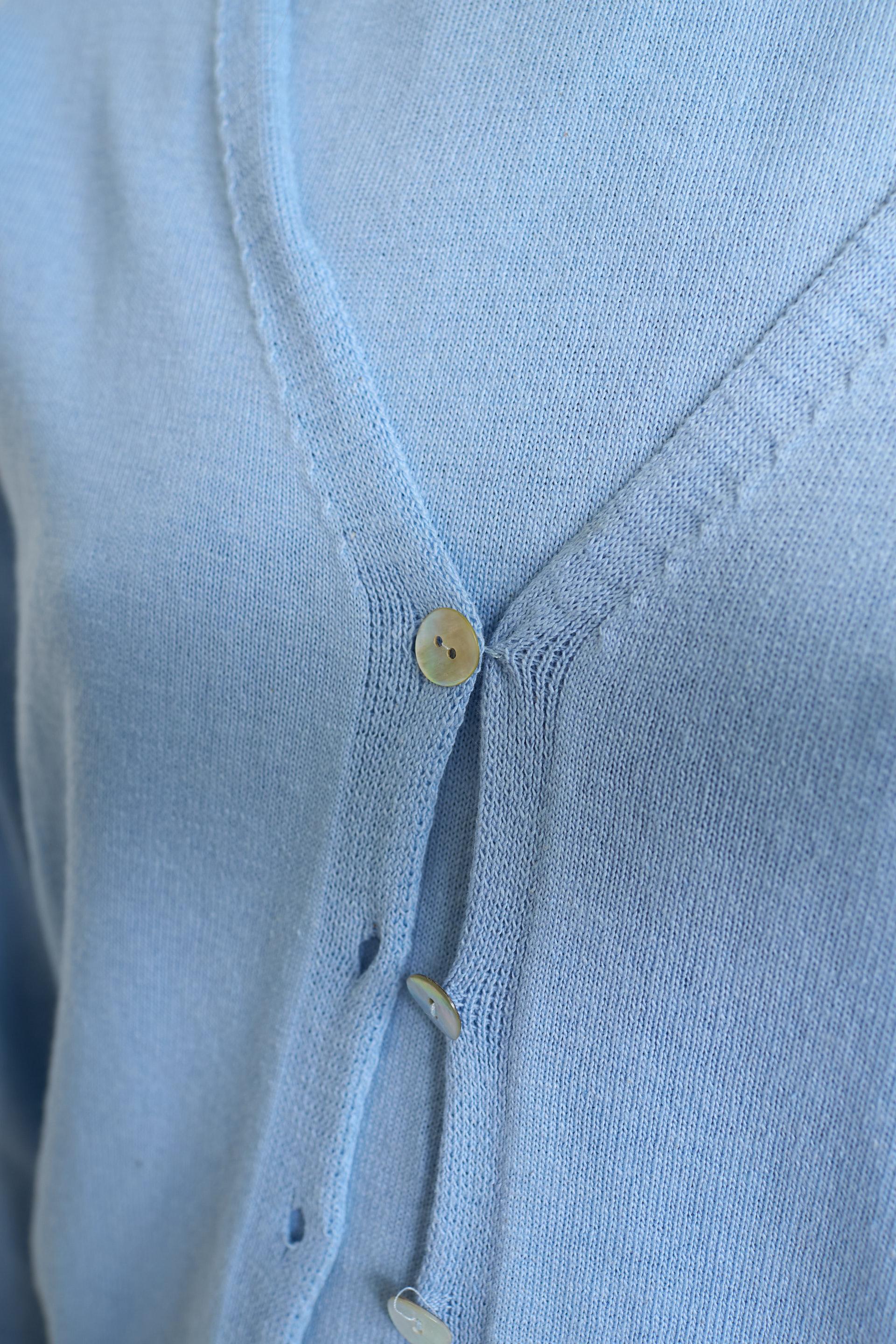 | Cardigan scollo a V con bottoni in madreperla. Lavorazione a coste su polsini e orlo. | ||