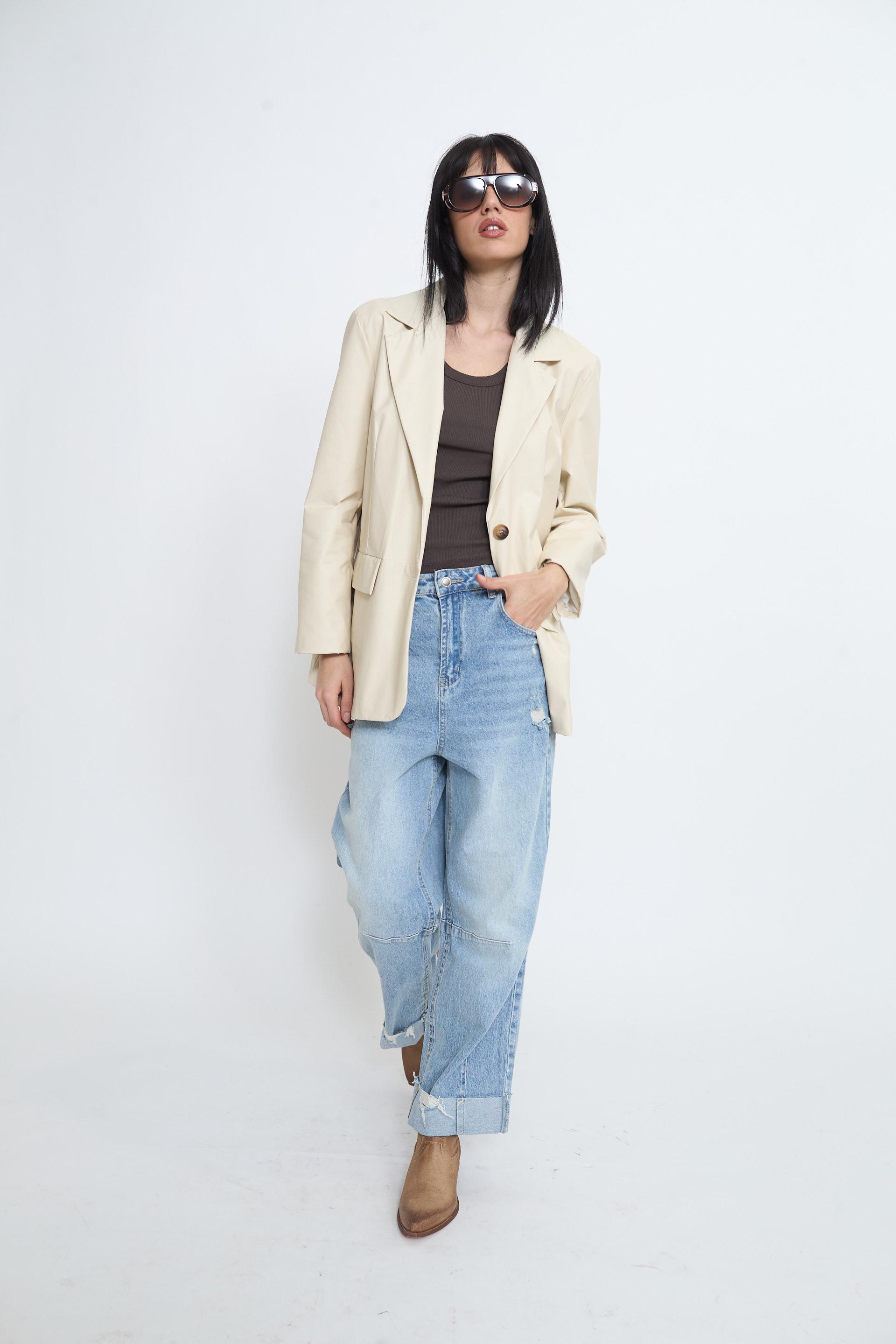 | Giacca over effetto pelle con tasche con pattina e fodera interna tono su tono. Chiusura tramite 2 bottoni. | ||