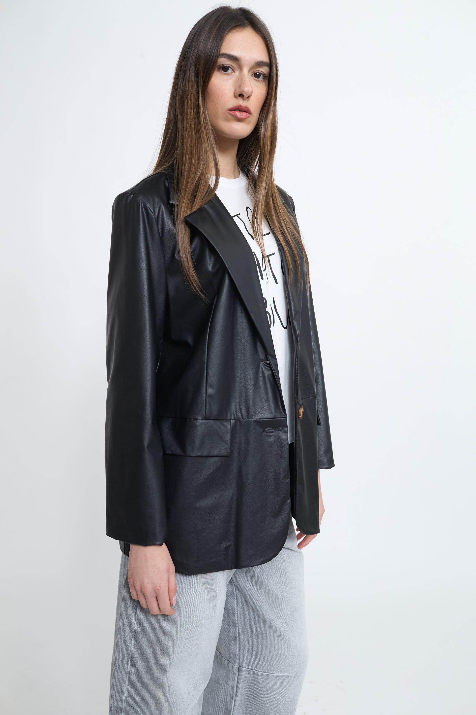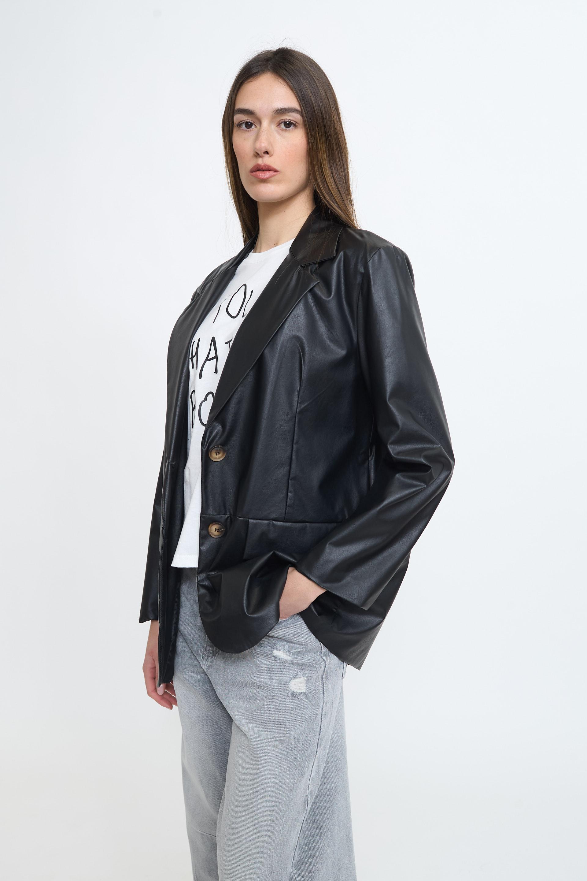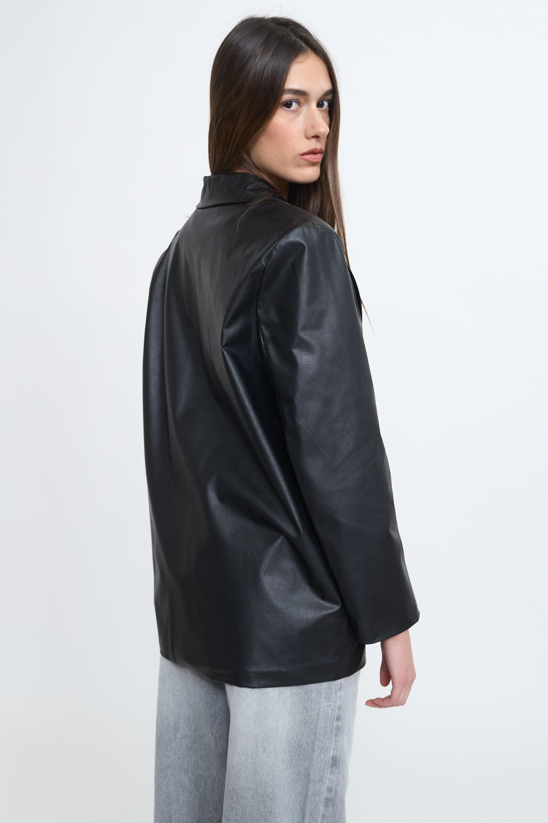 | Giacca over effetto pelle con tasche con pattina e fodera interna tono su tono. Chiusura tramite 2 bottoni. | ||