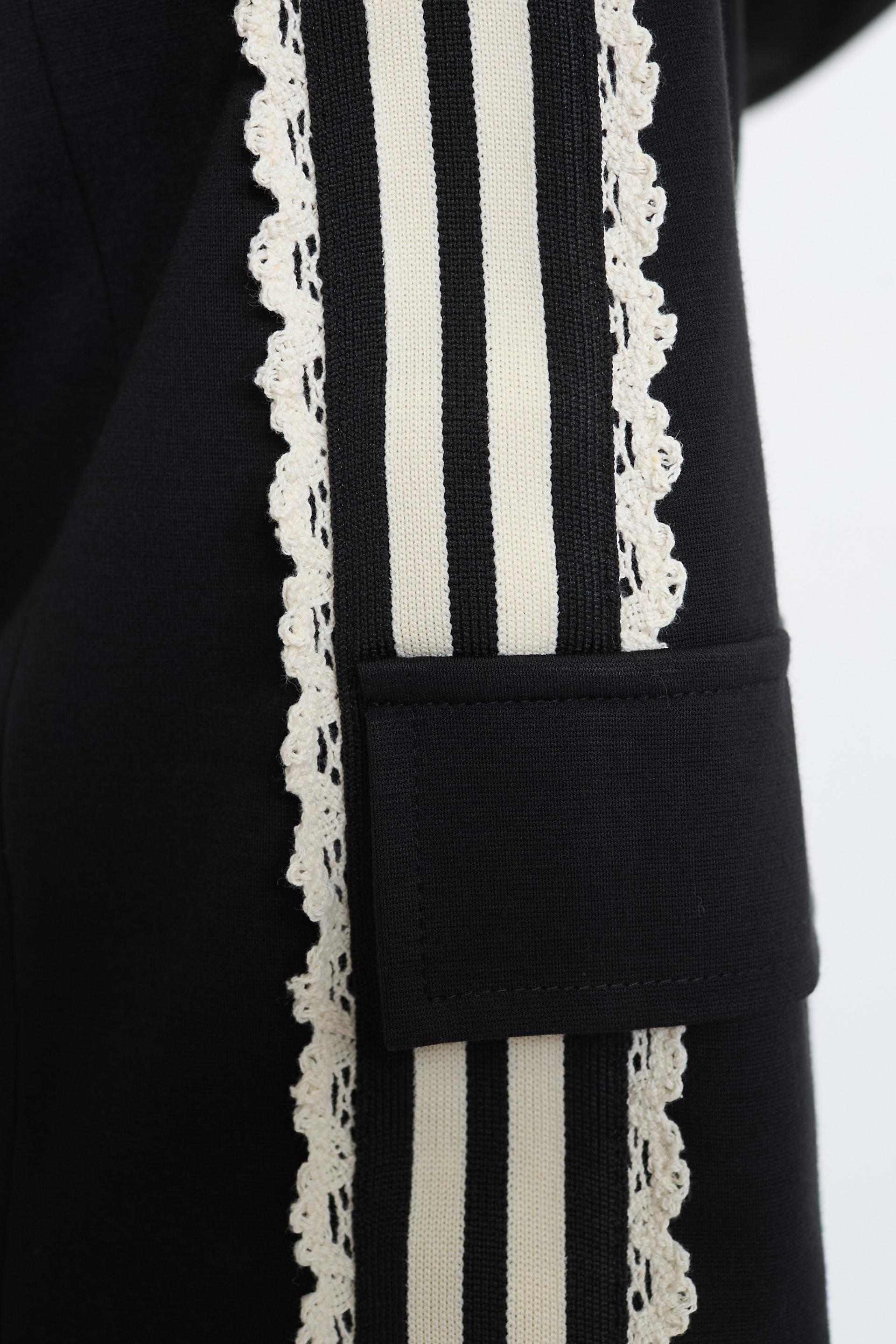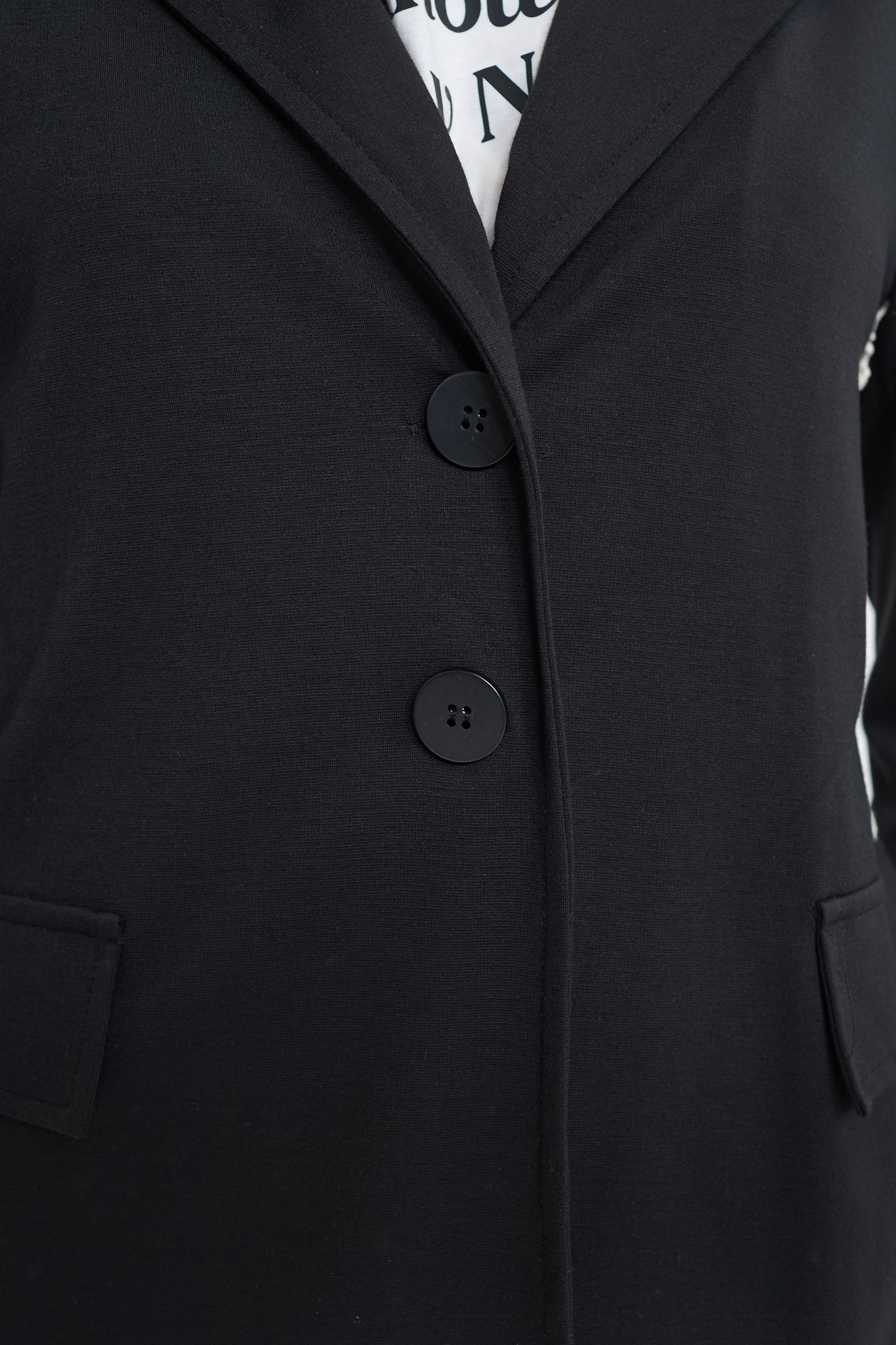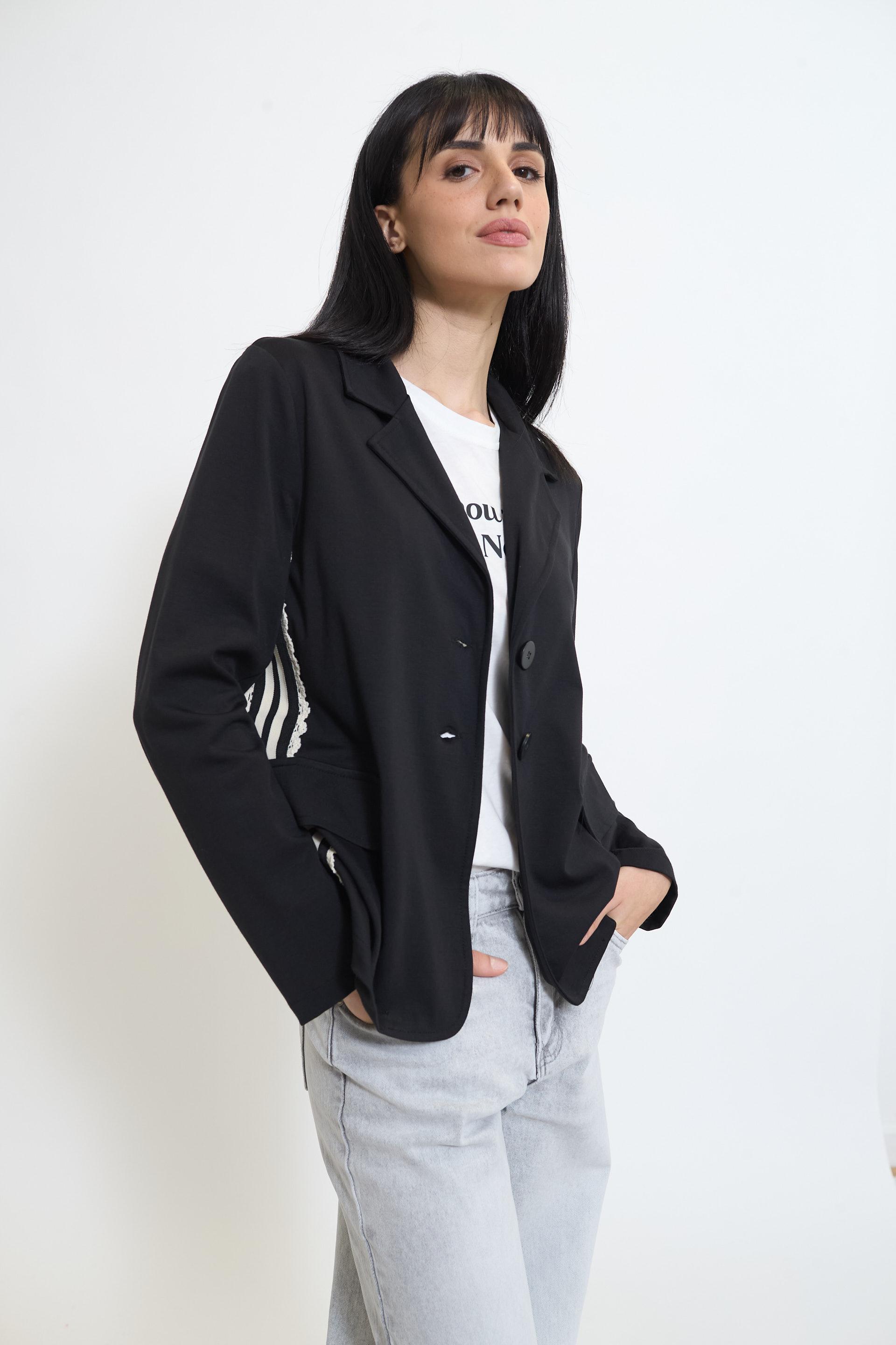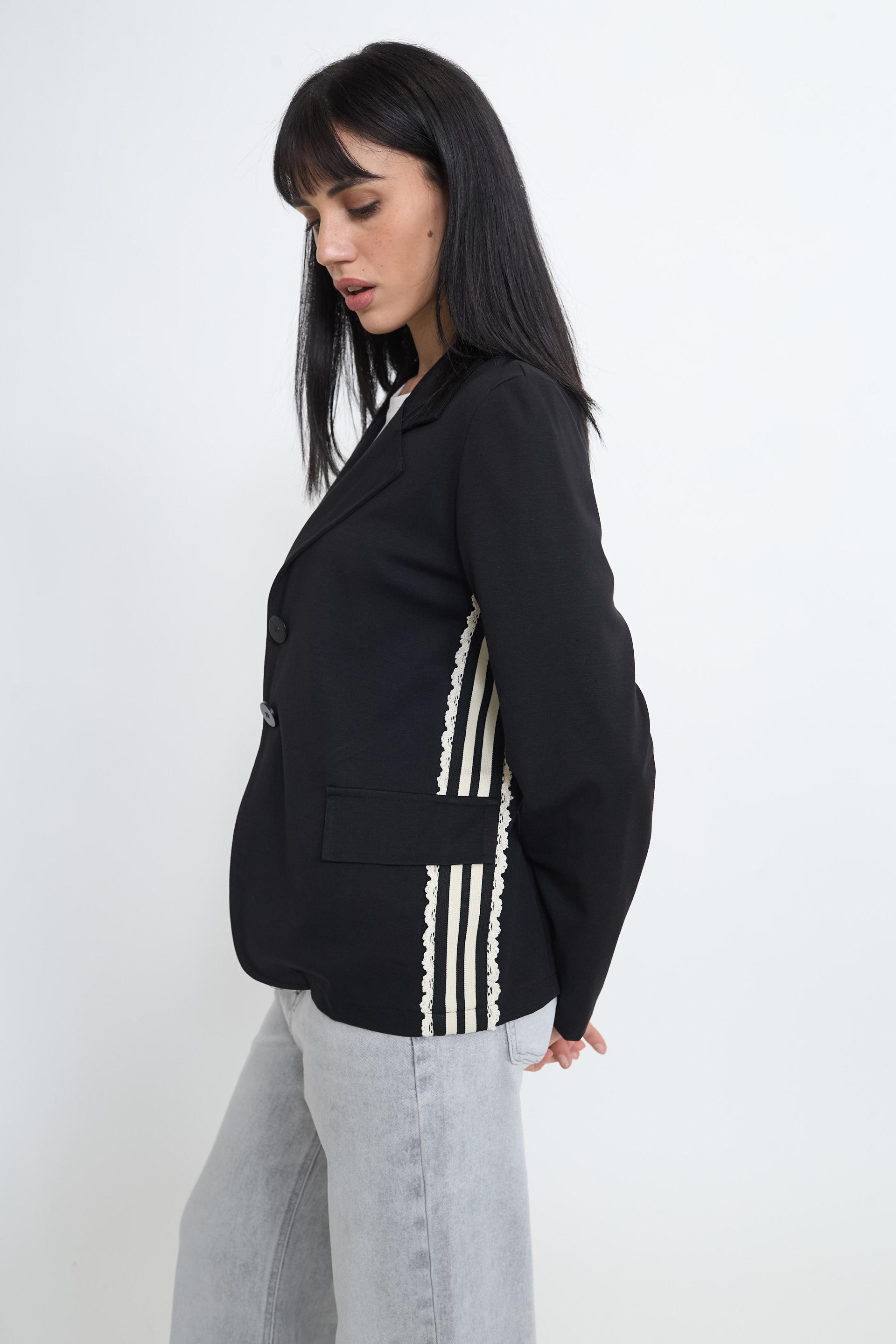 | Giacca in visco viscosa con finte tasche con pattine e dettaglio di bande laterali. Chiusura tramite 2 bottoni. | ||
