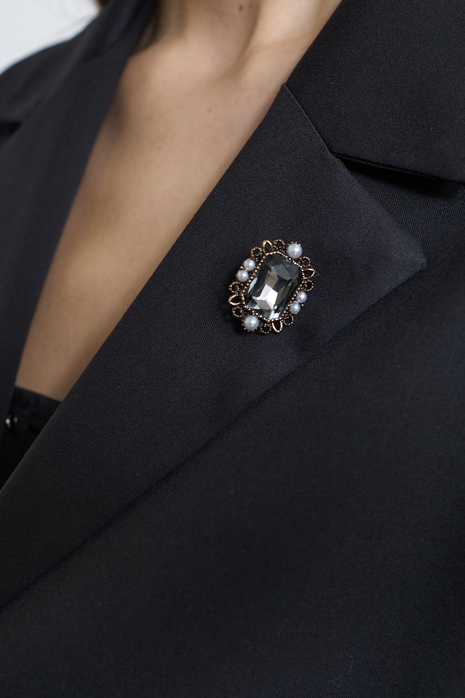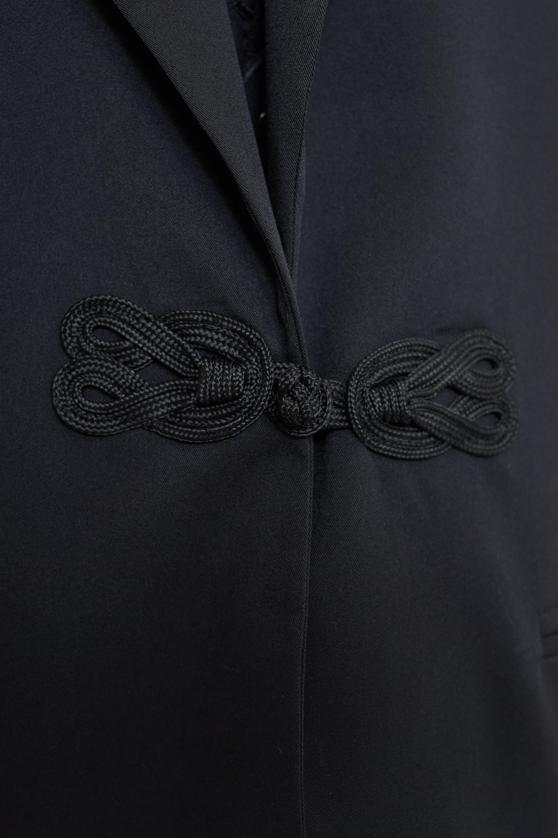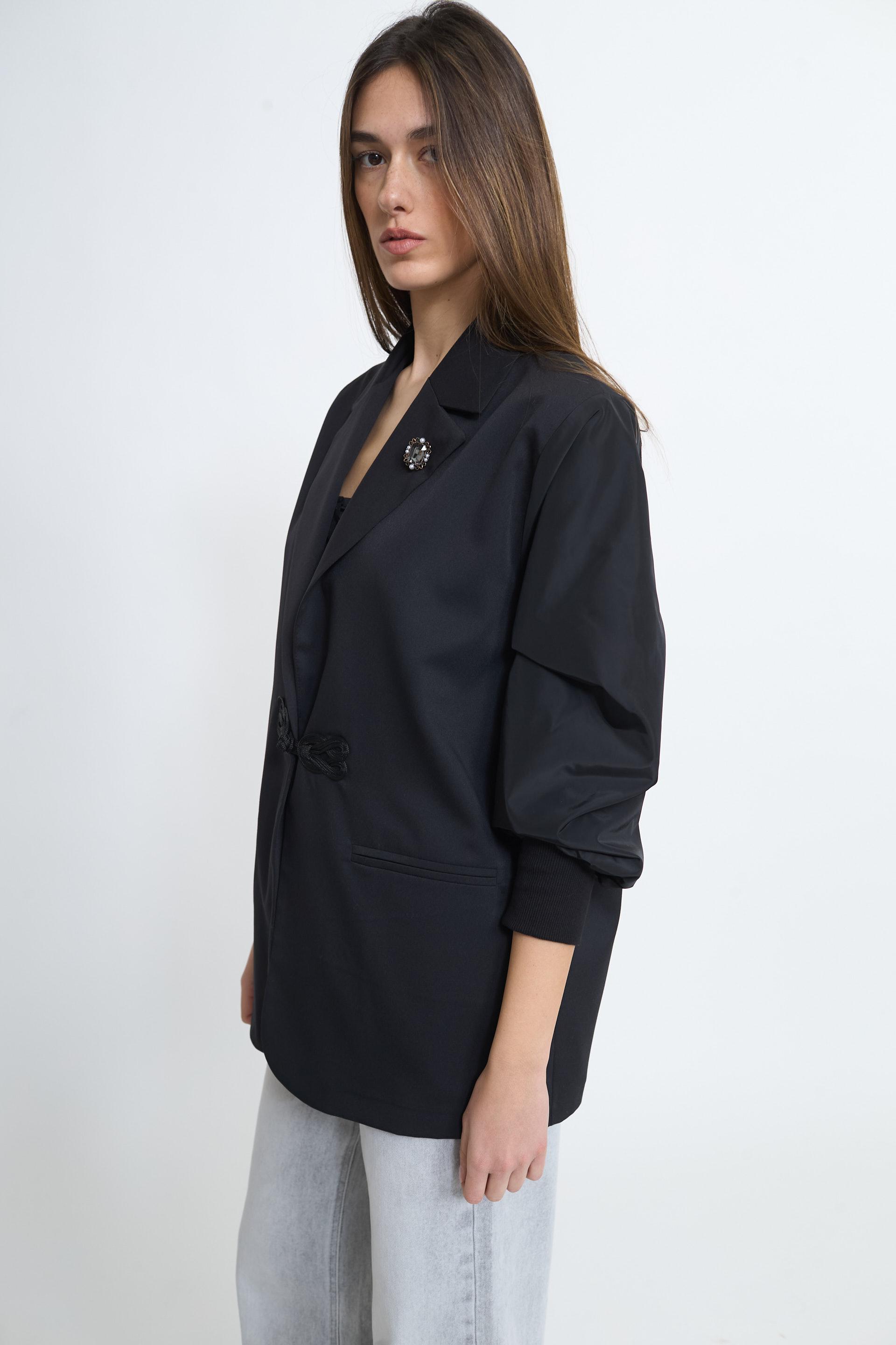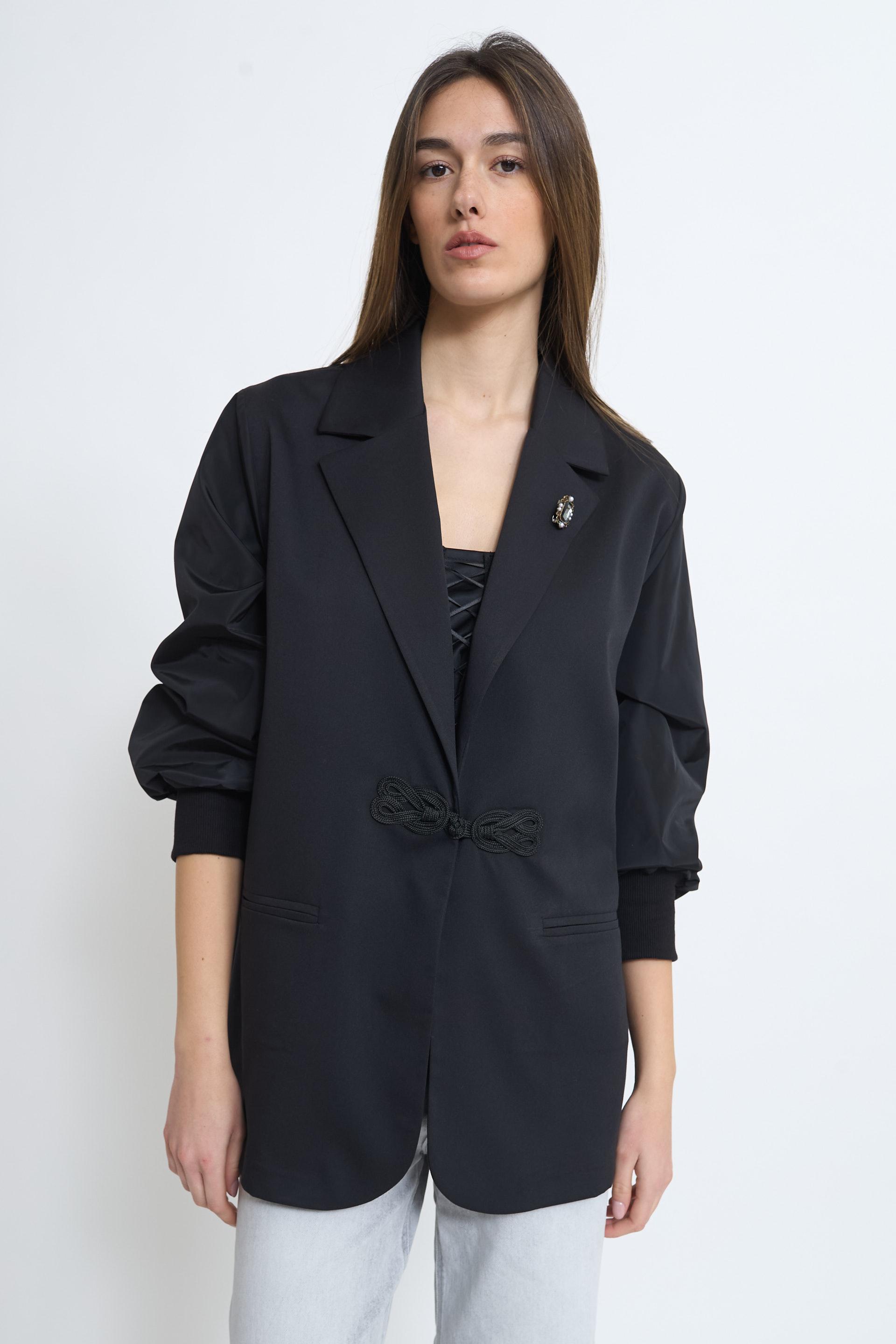 | Giacca over collo revers con spilla. Finte tasche a filetto e fodera interna tono su tono. Maniche in tessuto a contrasto con polsino a coste. Chiusura tramite alamaro. | ||