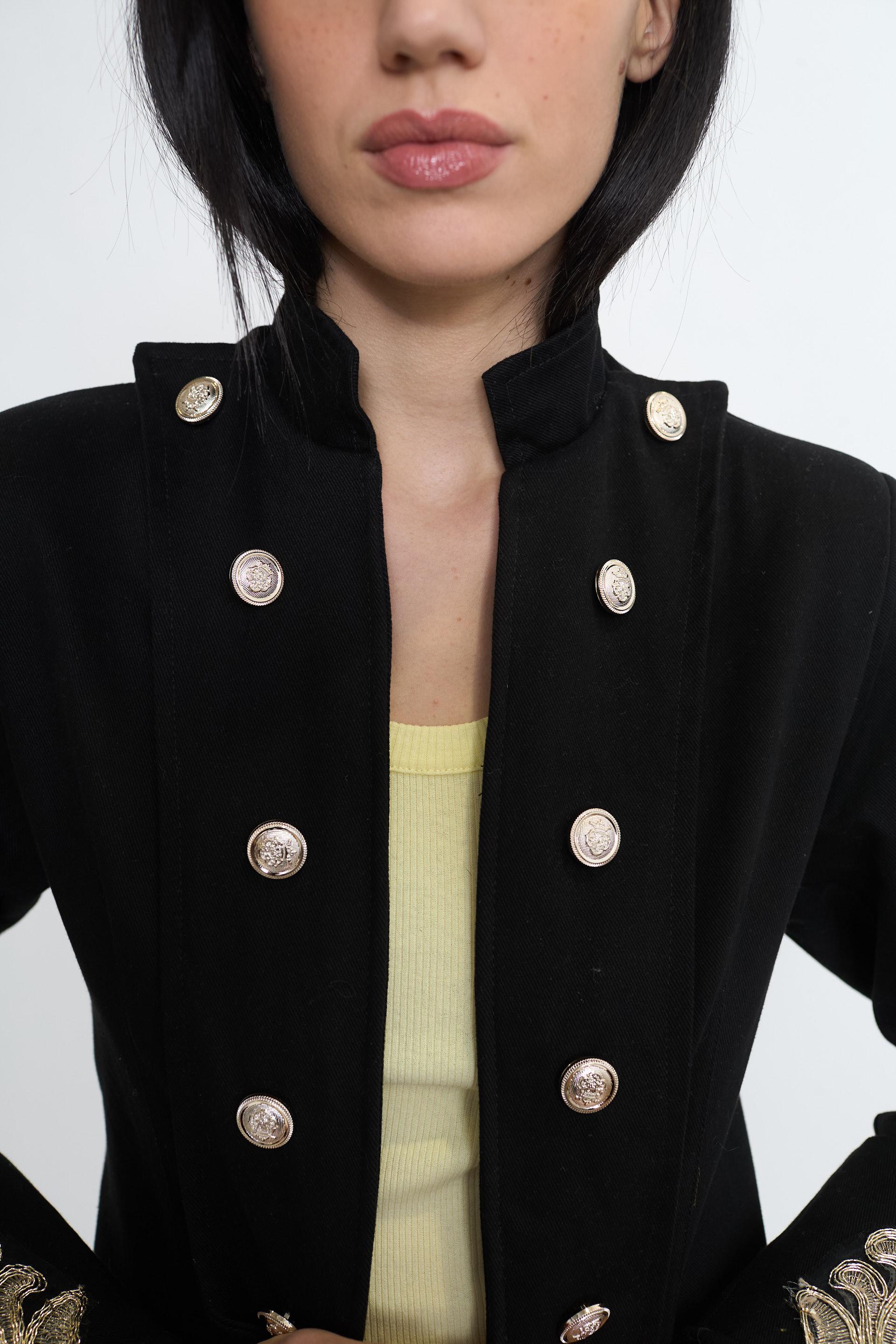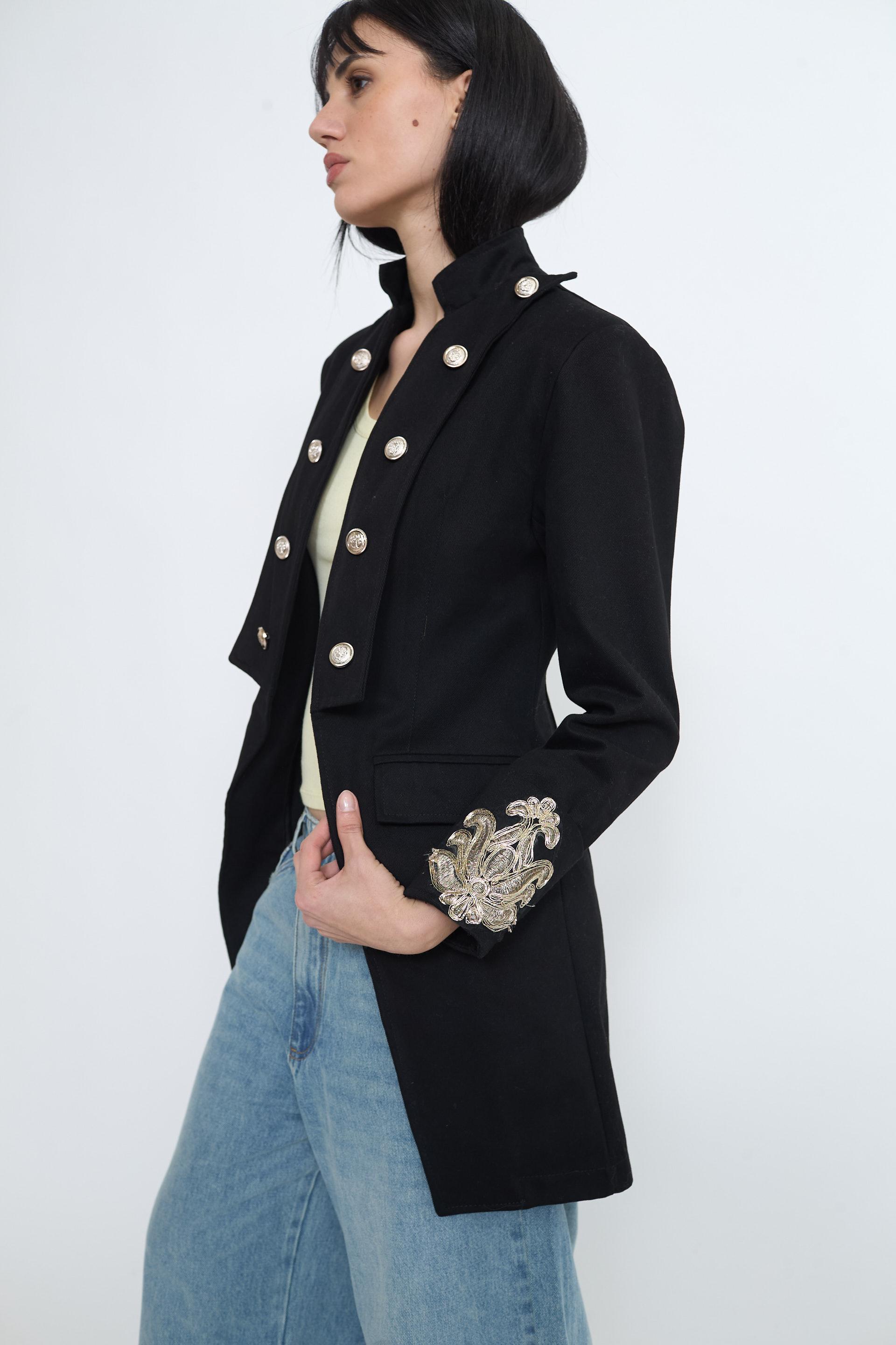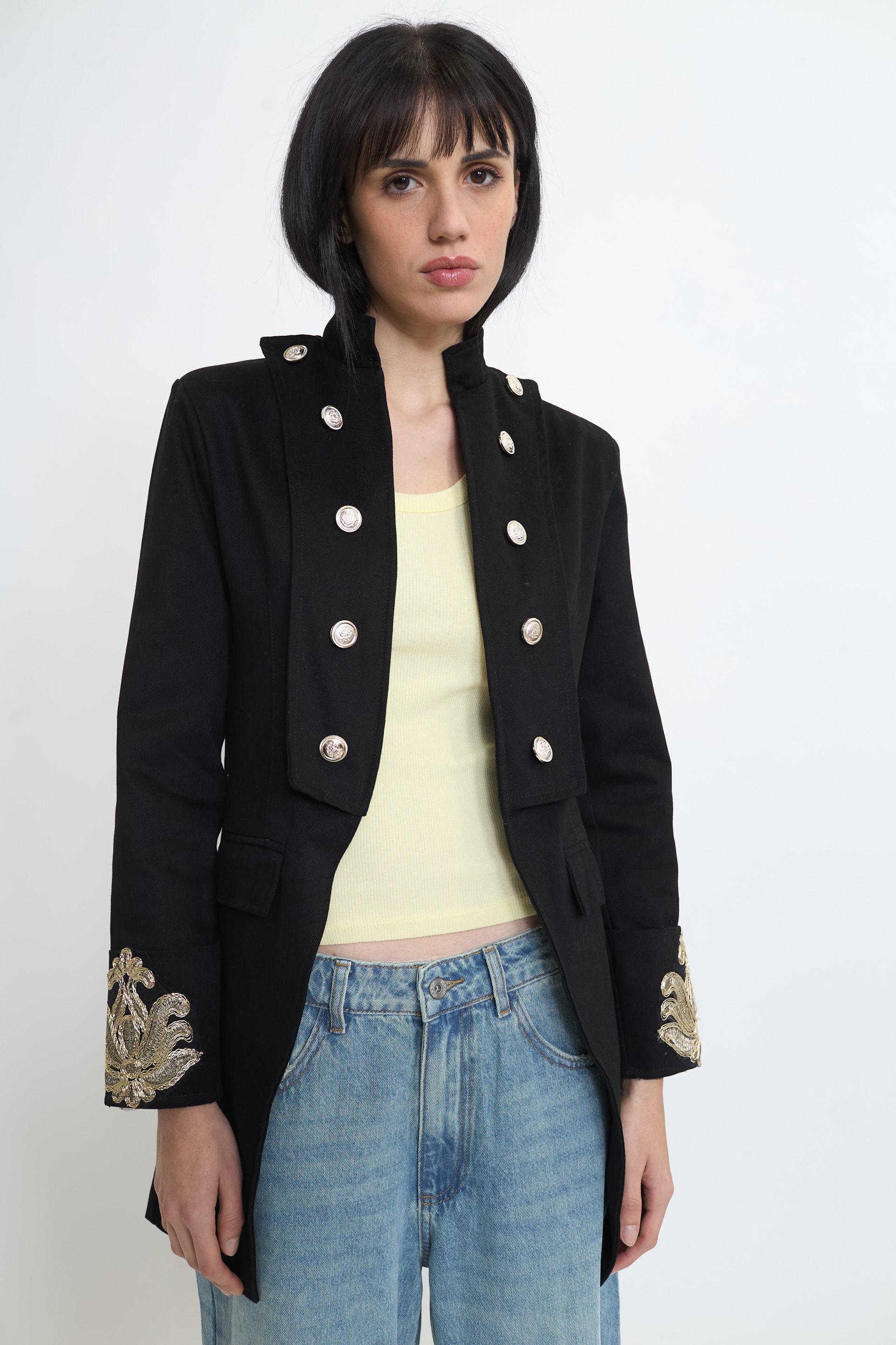 | Giacca 3/4 aperta modello Napoleon in cotone con finte tasche a pattina e bottoni a rilievo. Dettaglio di patch su risvolto dei polsini e spacco posteriore. | ||