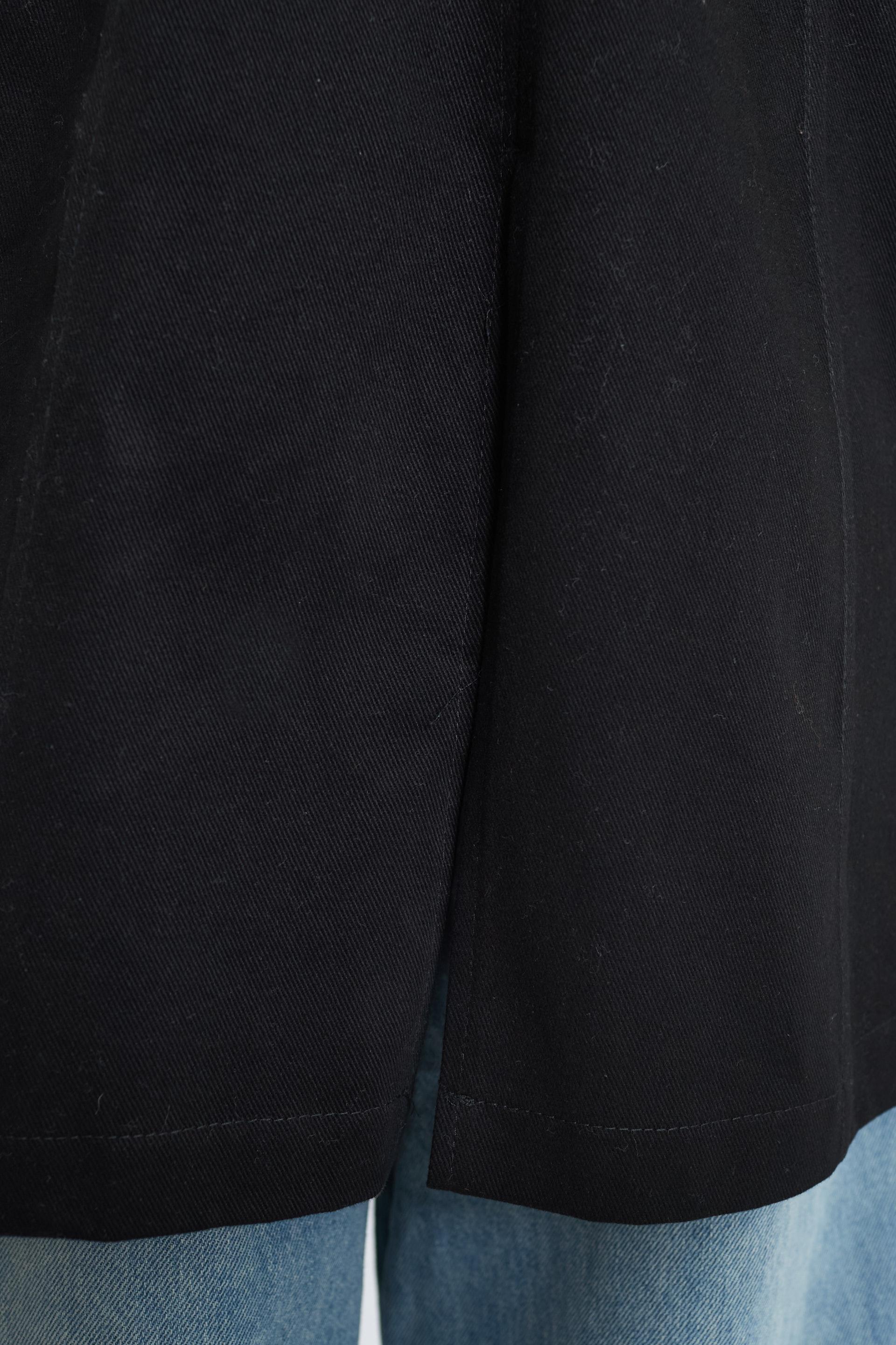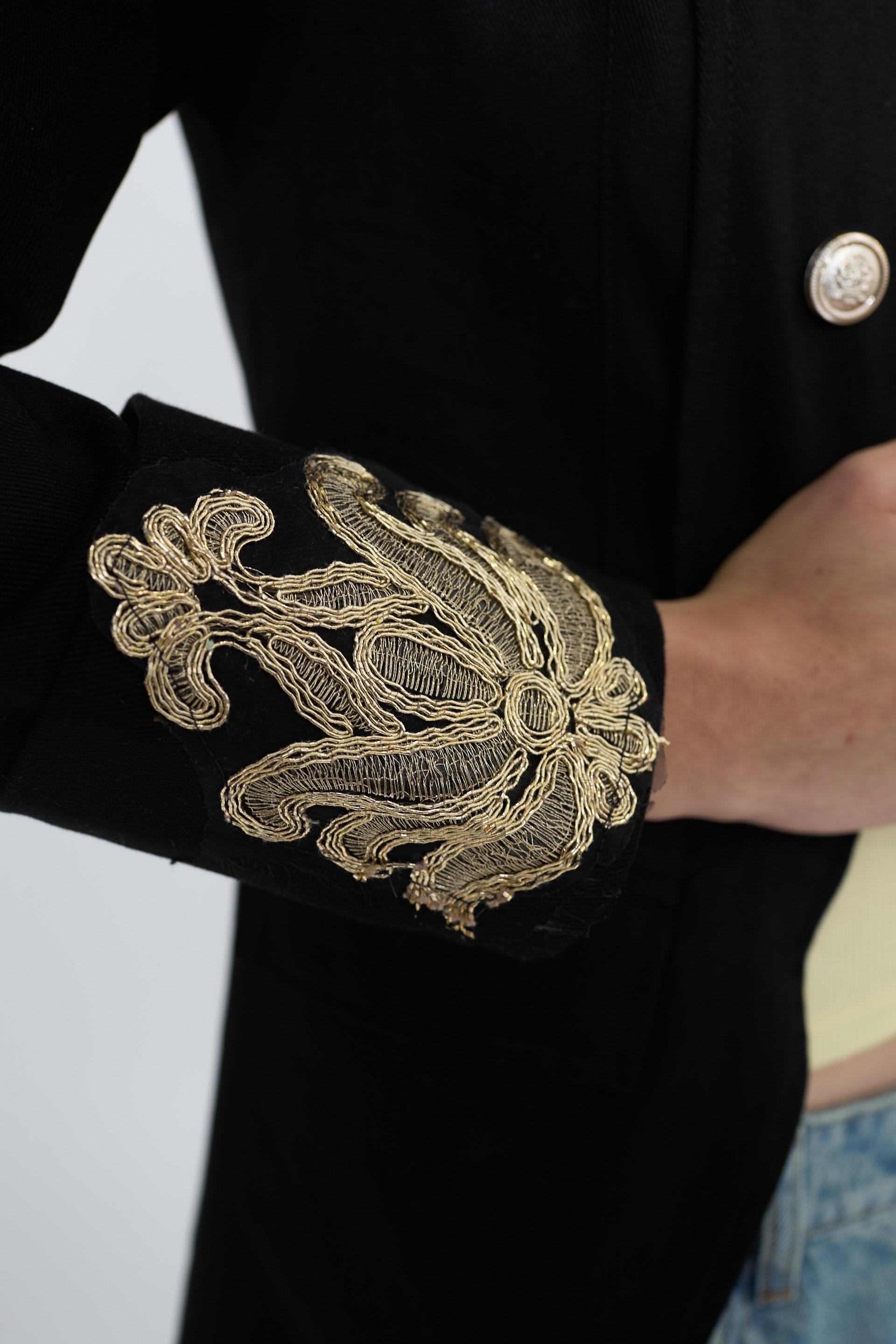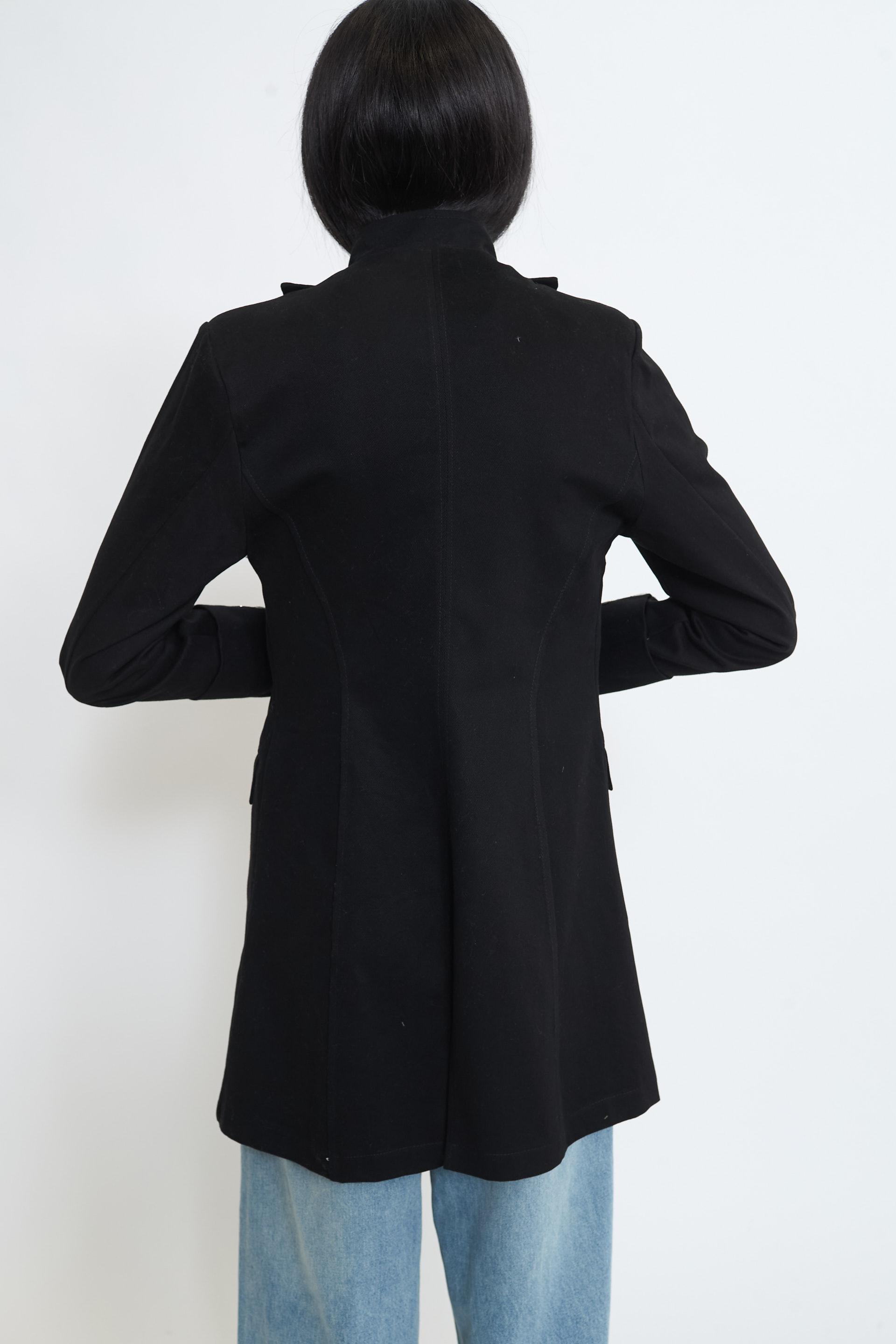 | Giacca 3/4 aperta modello Napoleon in cotone con finte tasche a pattina e bottoni a rilievo. Dettaglio di patch su risvolto dei polsini e spacco posteriore. | ||