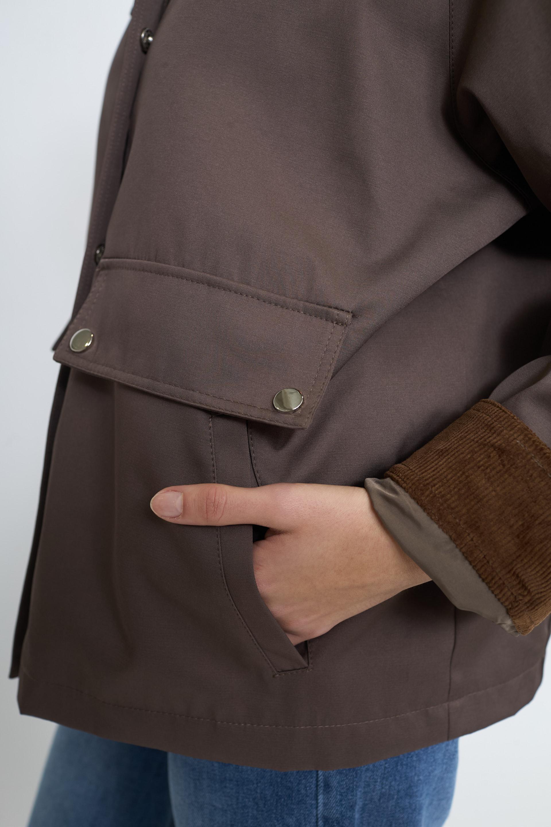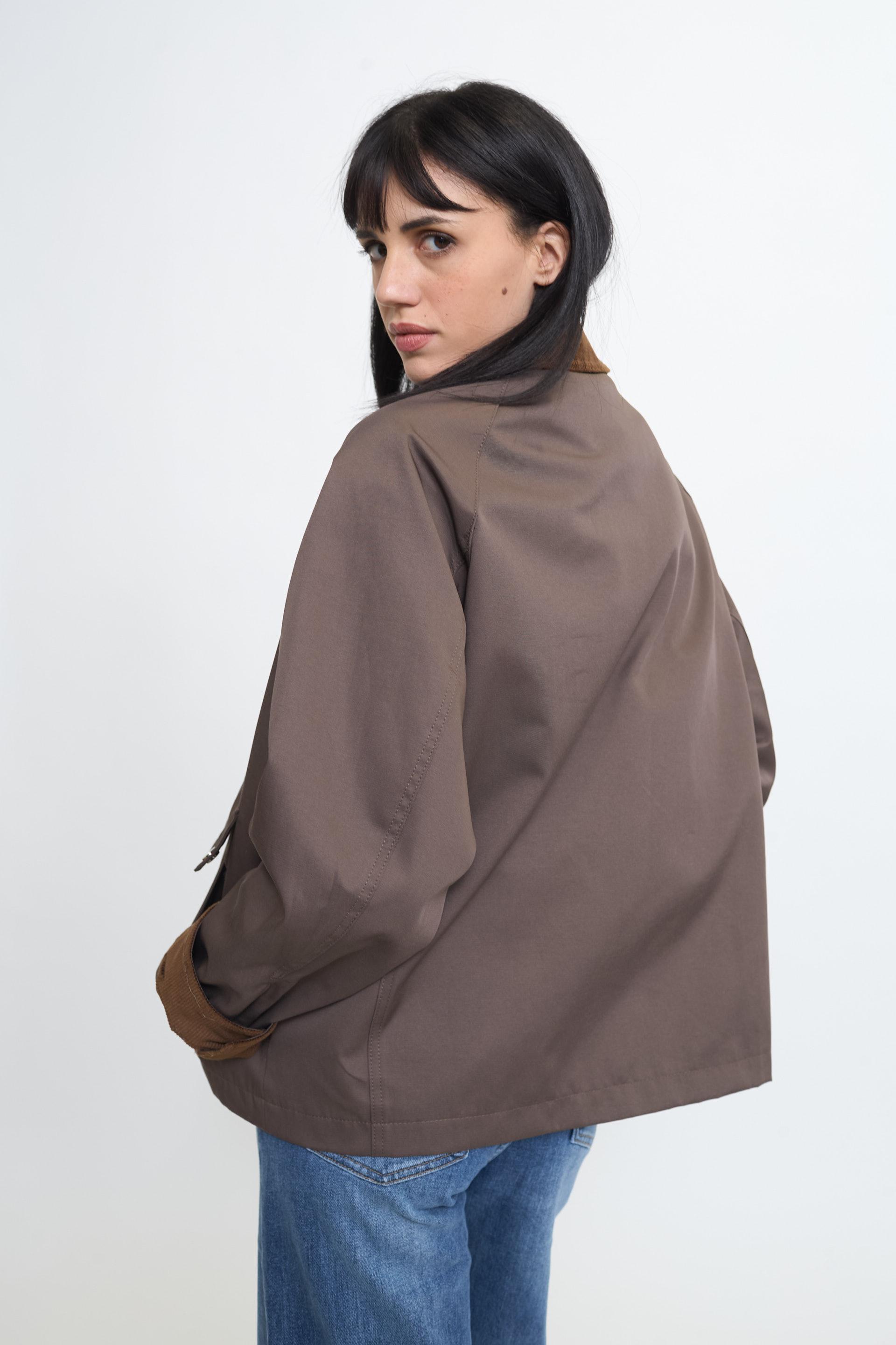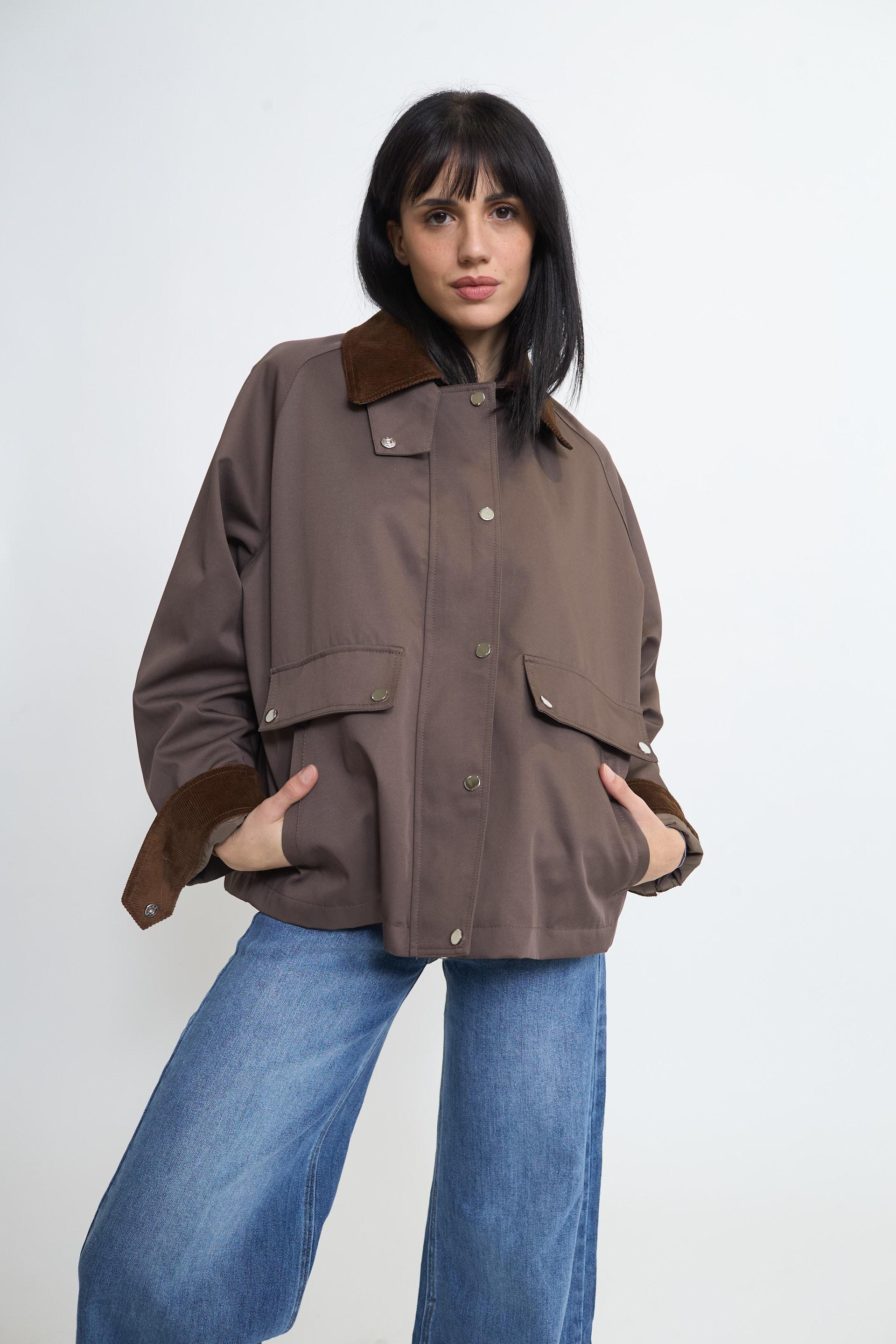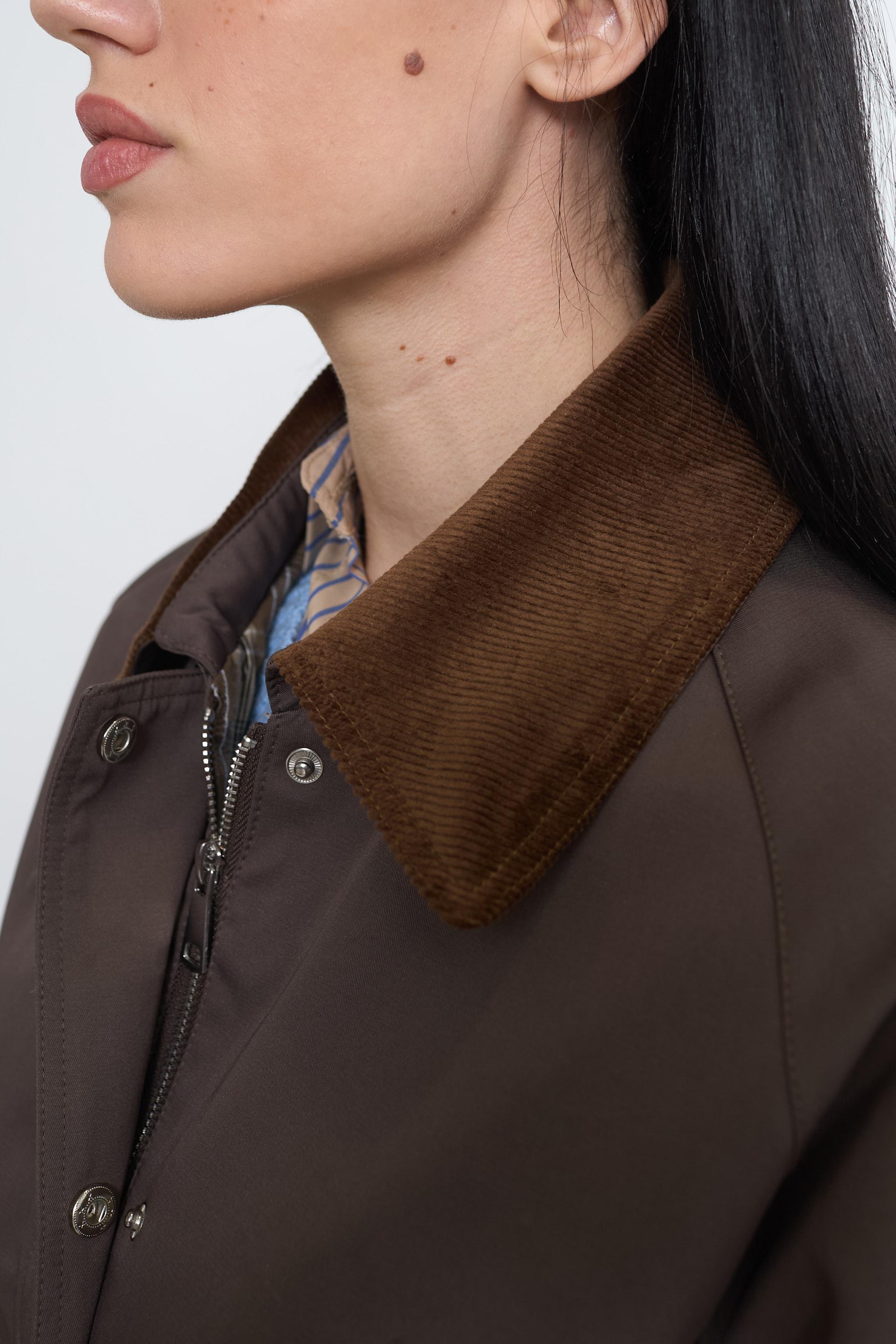 | Giaccone tessuto tecnico con tasche laterali e finte tasche con pattine. Dettaglio di colletto risvolto polsini in velluto a costine. Fodera interna tono su tono. Chiusura con zip nascosta da abbottonatura con bottoni automatici in metallo. | ||