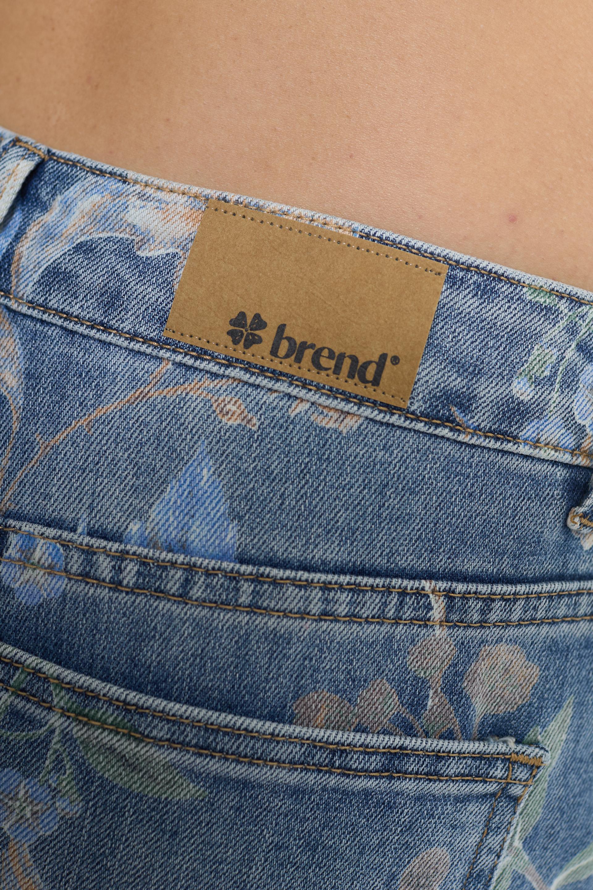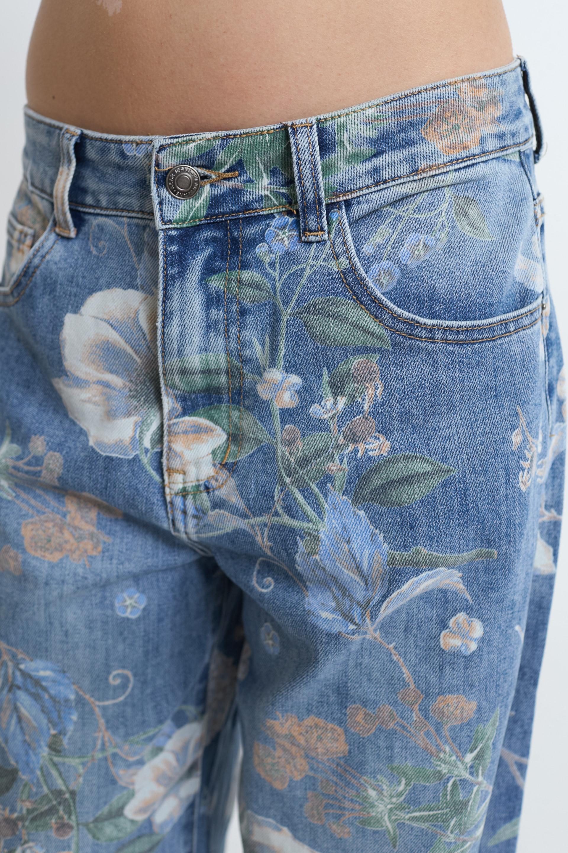 | Jeans wide-leg in denim con stampa floreale. Targhetta posteriore loggata in cuoio. Chiusura tramite bottone metallico e cerniera. | ||