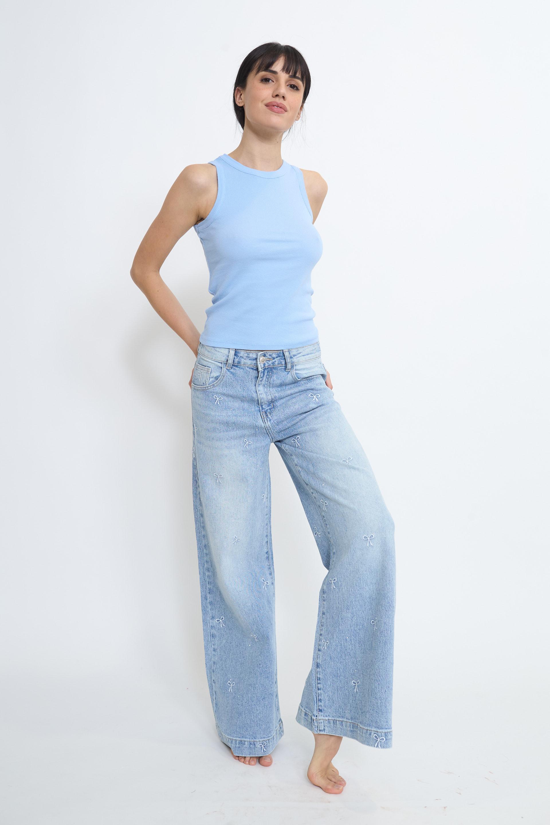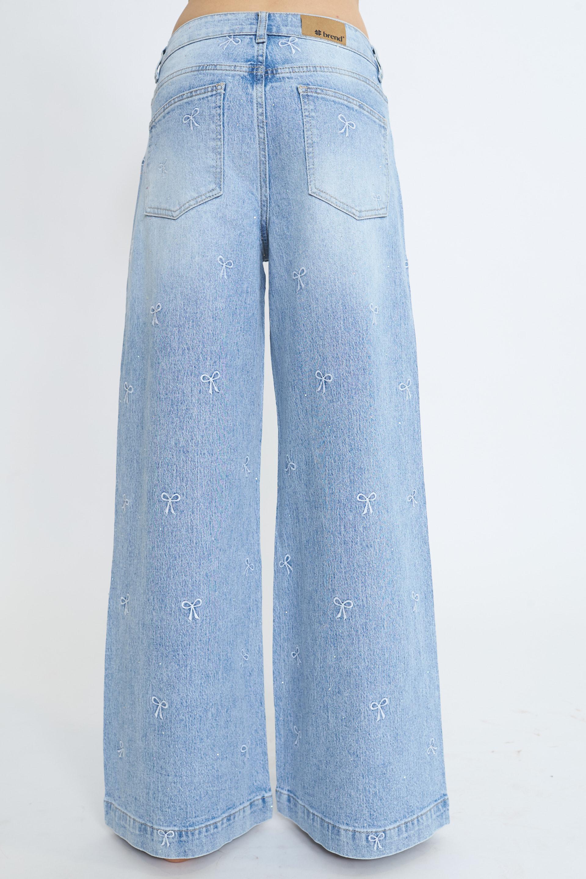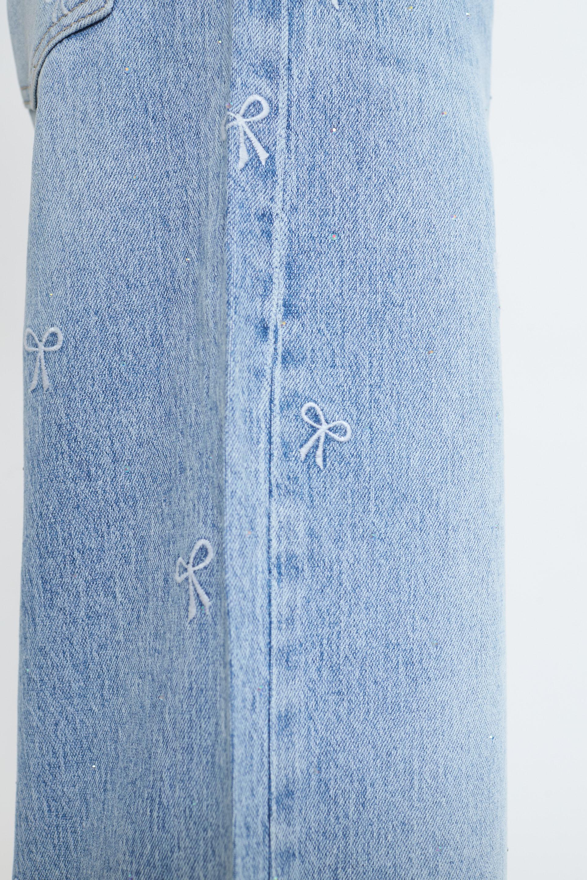 | Jeans straight leg con dettaglio di fiocchetti ricamati e strass. Targhetta posteriore loggata in cuoio. Chiusura tramite cerniera e bottone metallico. | ||