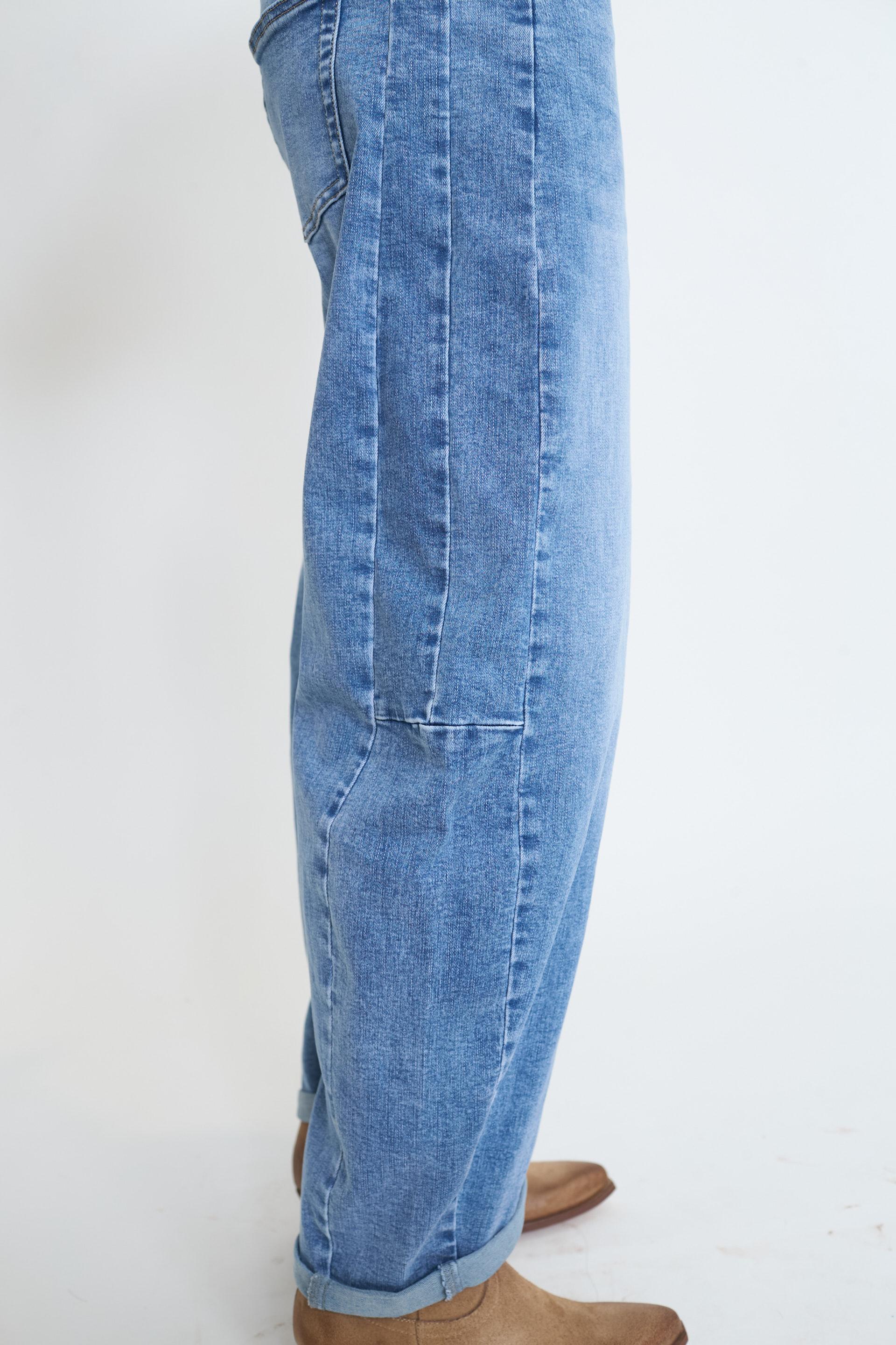 | Jeans barrel in denim delavato con piccolo risvolto. Targhetta posteriore loggata in cuoio. Chiusura tramite cerniera e bottone metallico. | ||