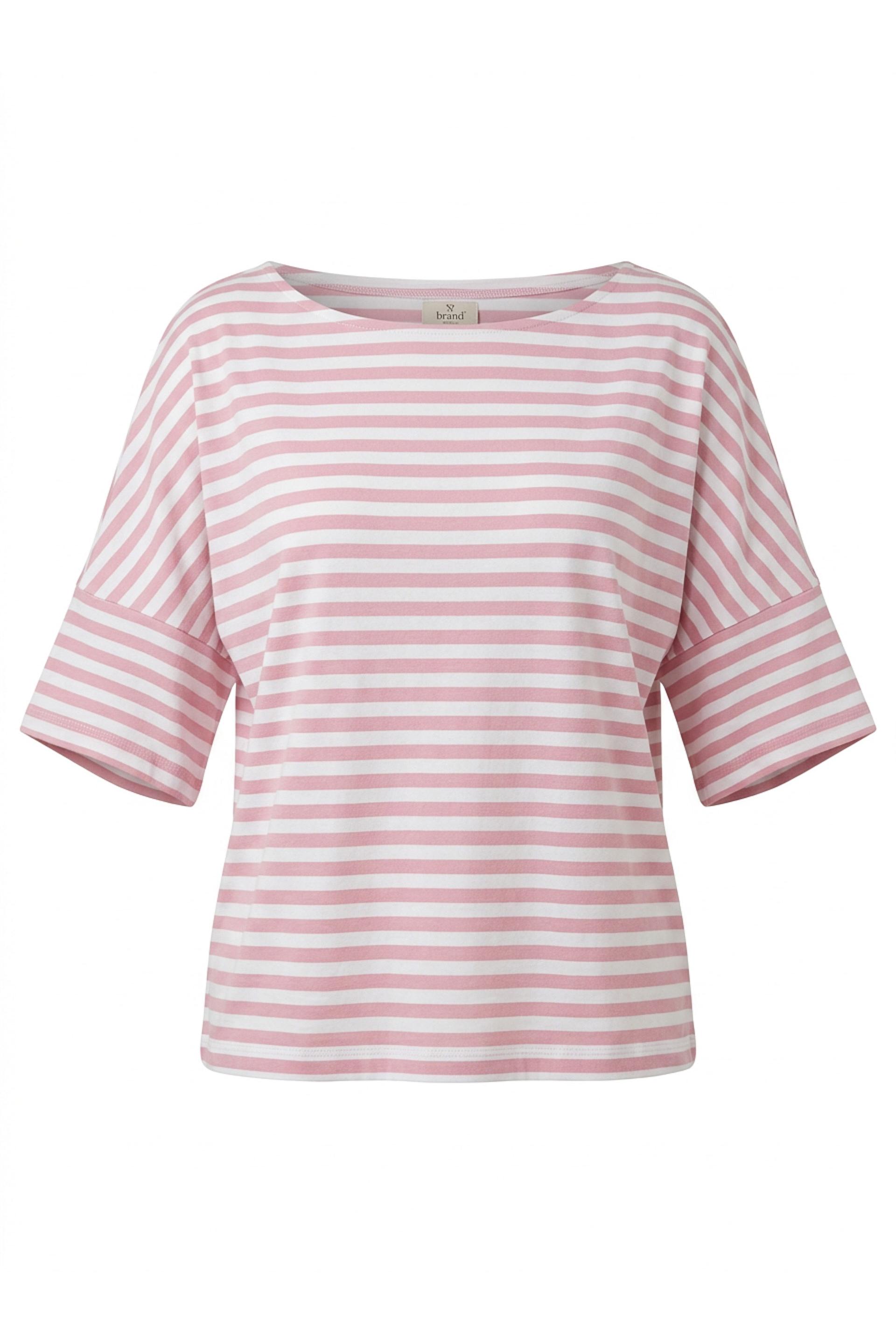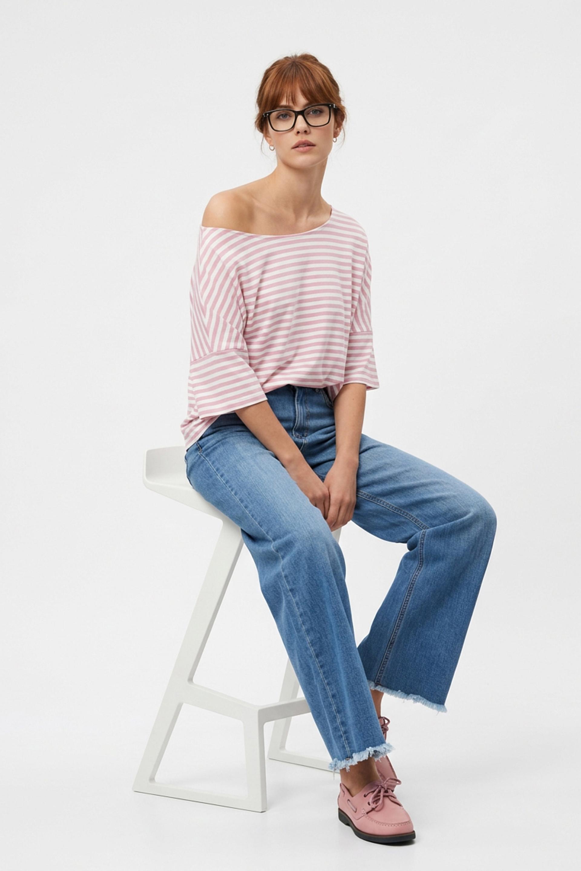 | Maglia in tessuto felpa leggera a righe con scollo a barca. Maniche 3/4, scollo e orlo a taglio vivo. | ||