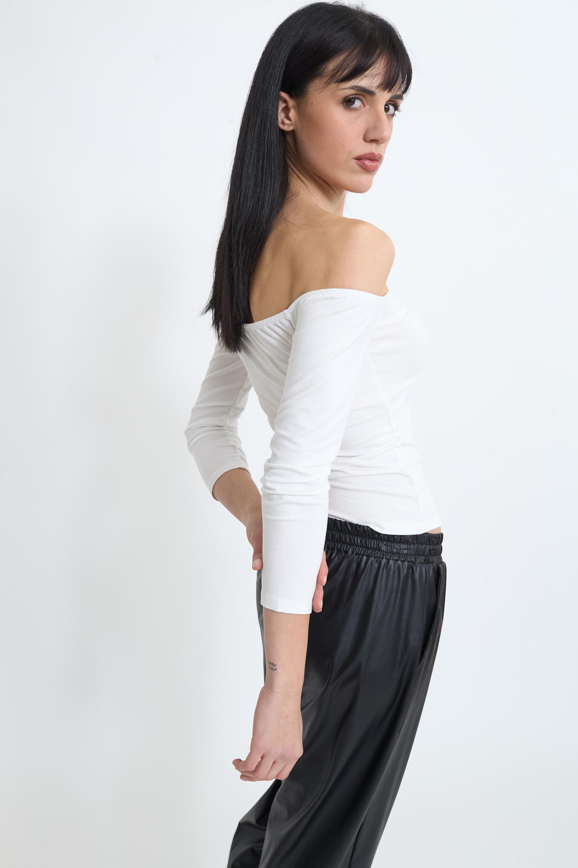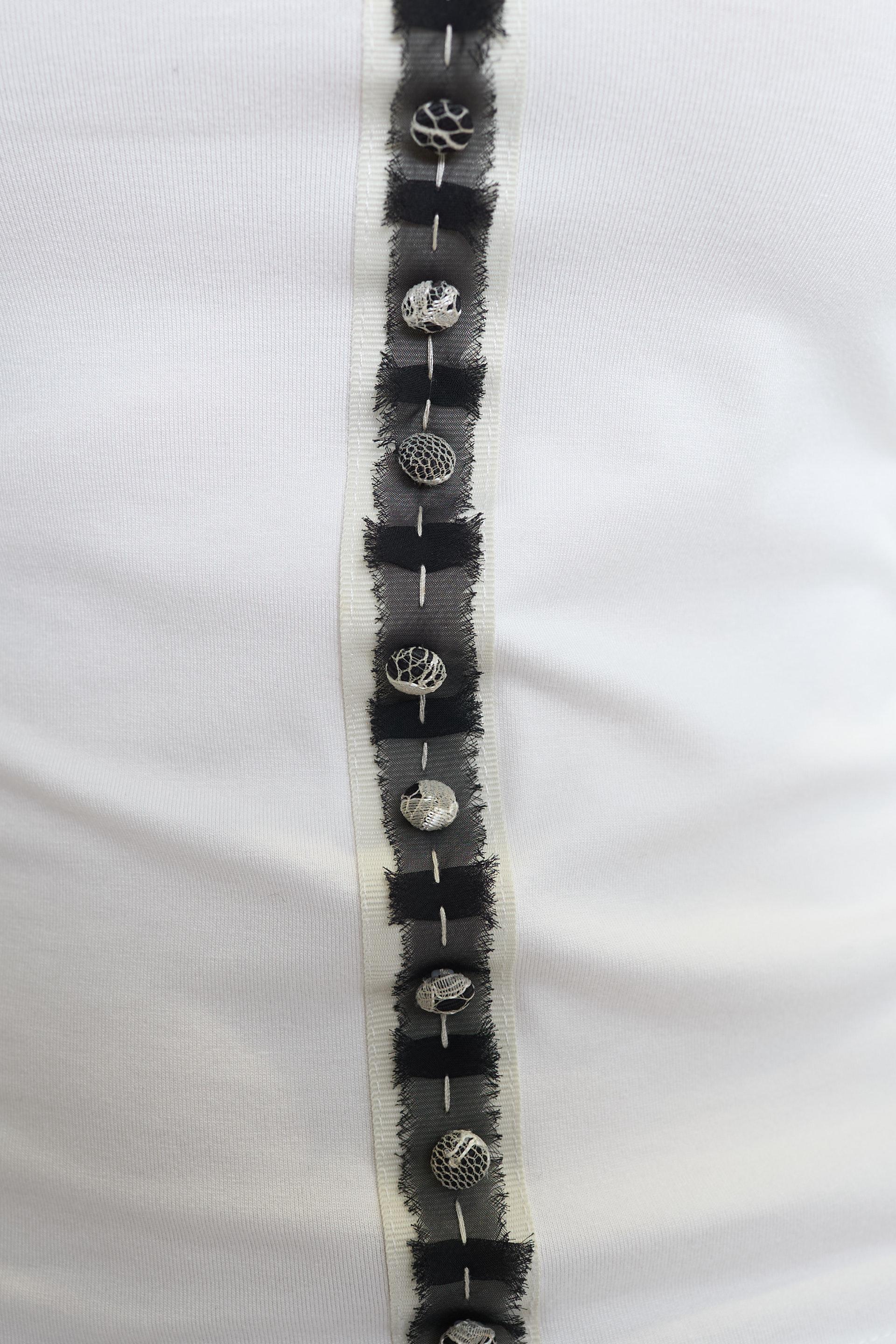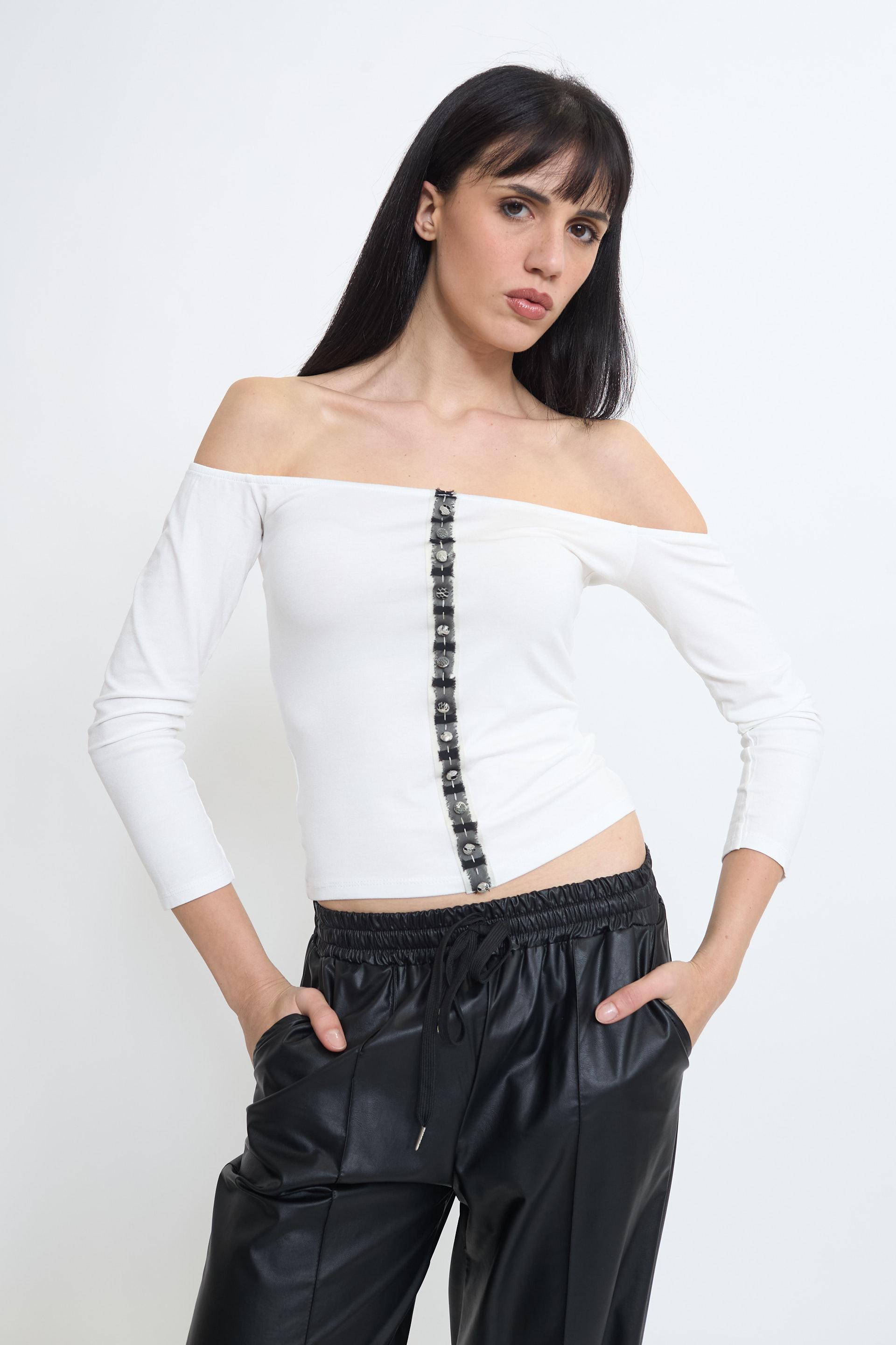 | Maglia scollo barca in viscosa con dettaglio di passamaneria centrale con bottoncini. | ||