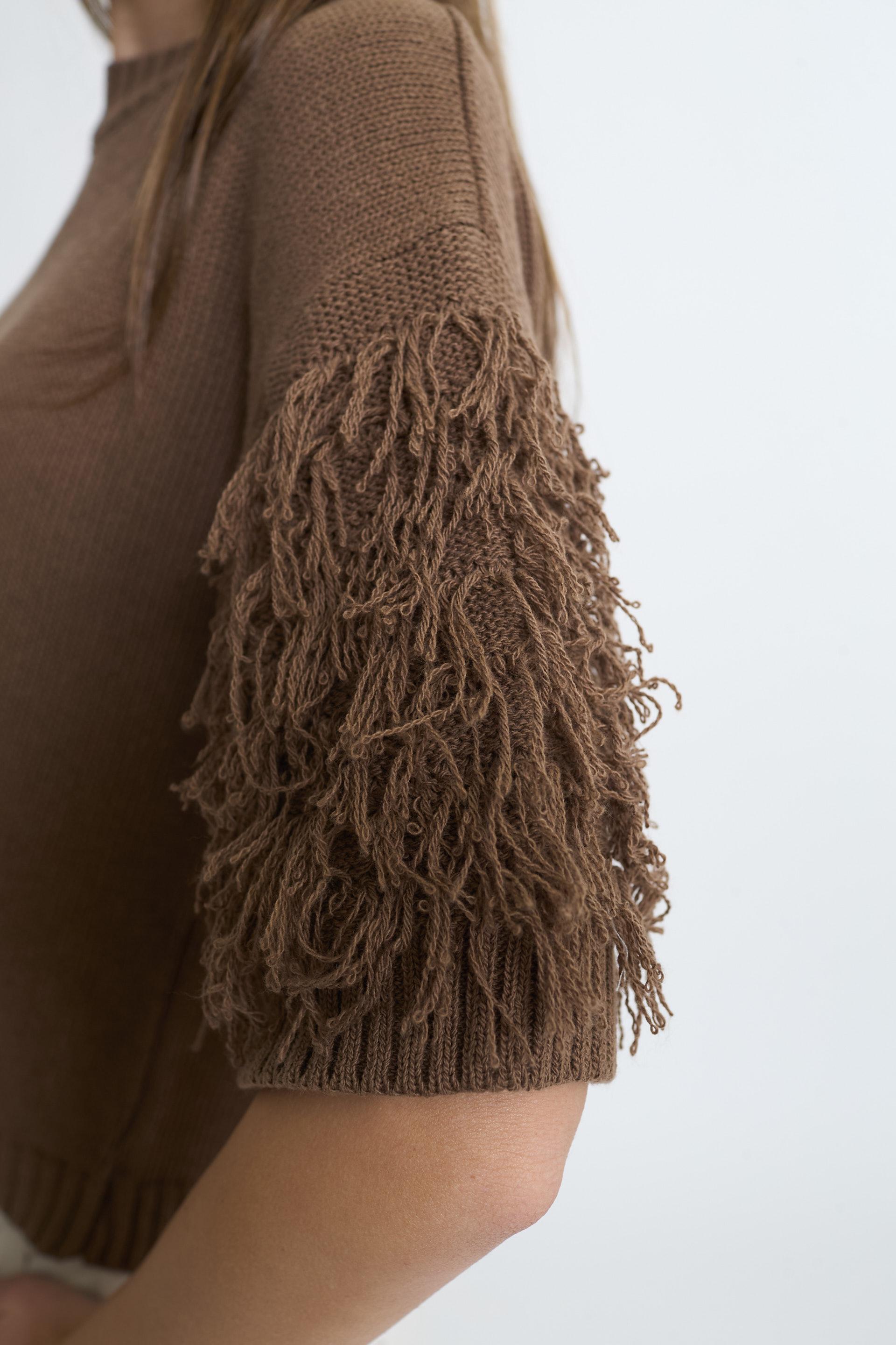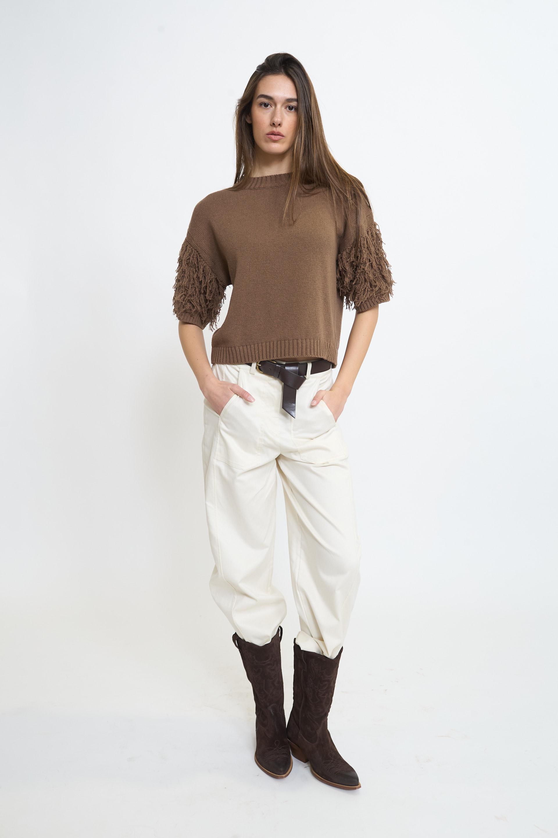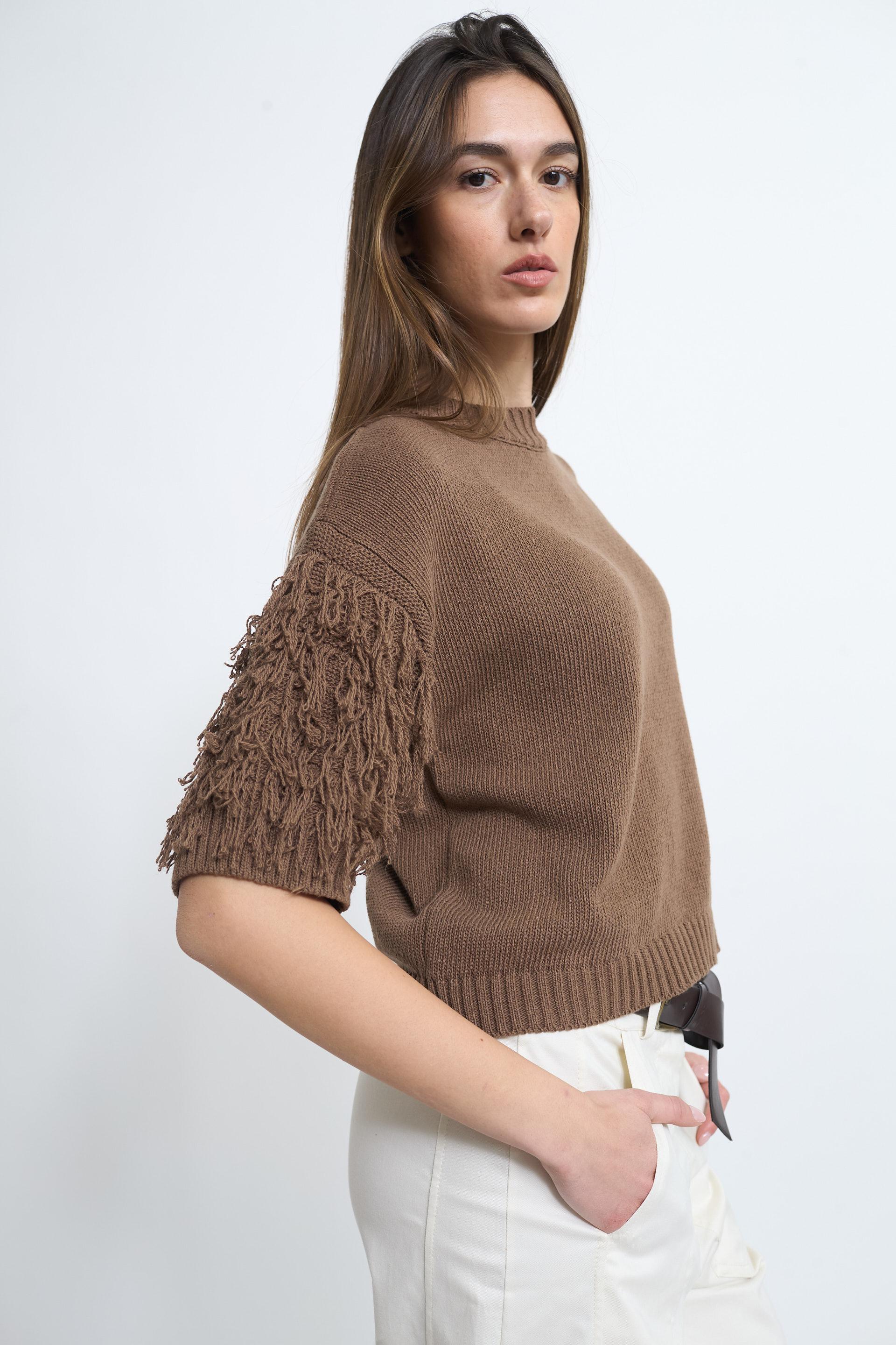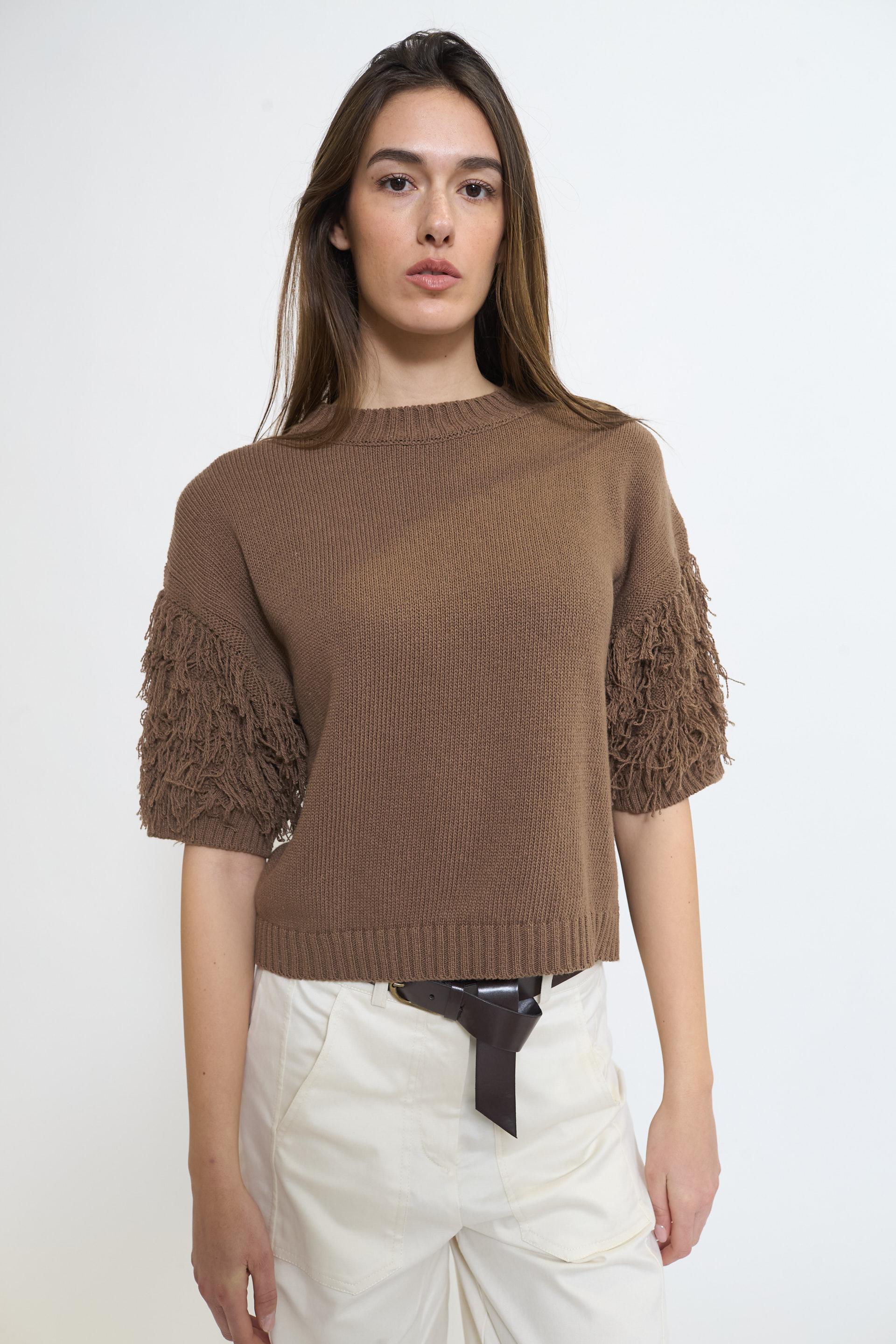 | Maglia girocollo a 1/2 manica con dettaglio di frange. Lavorazione a coste su scollo, fine manica e orlo, | ||