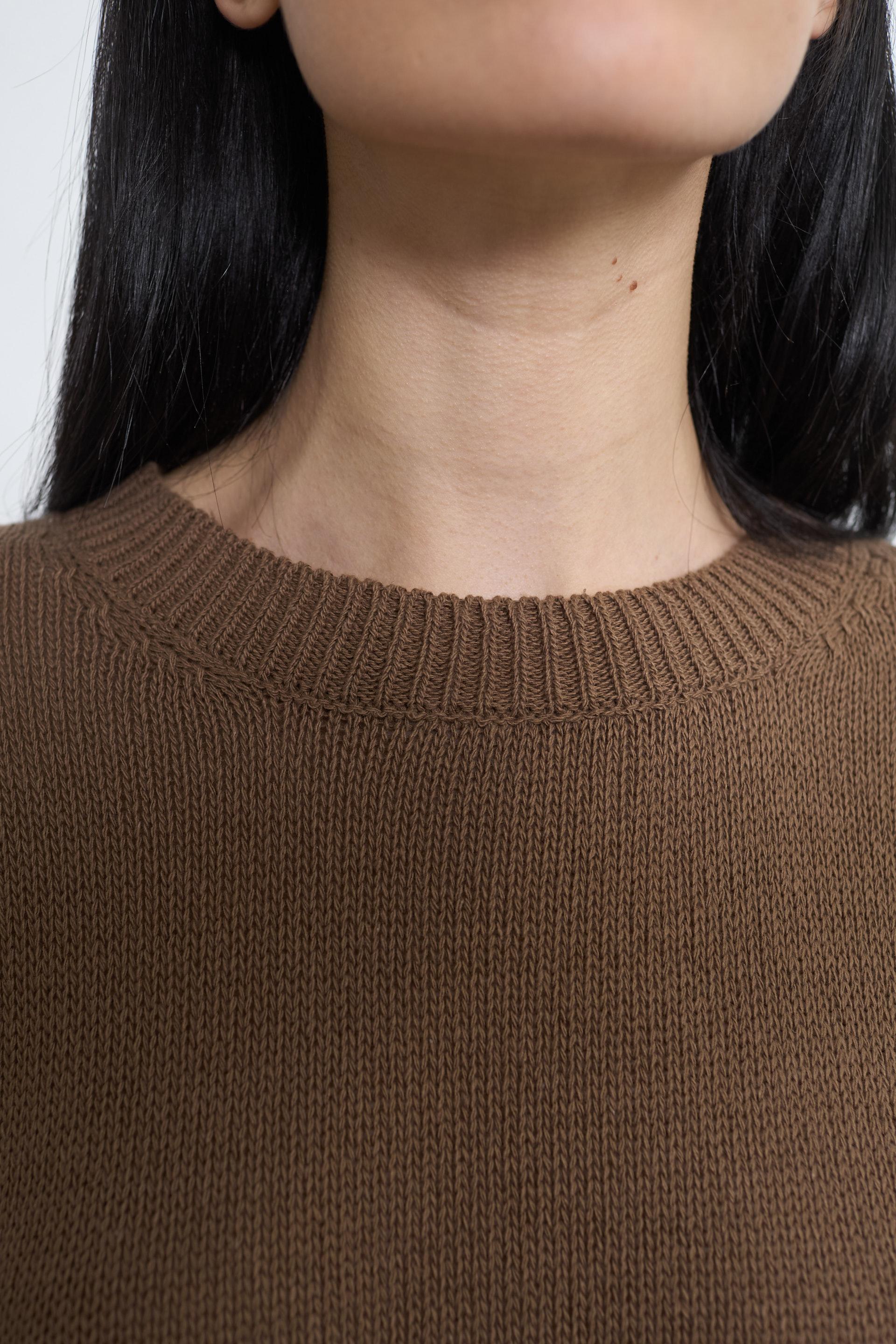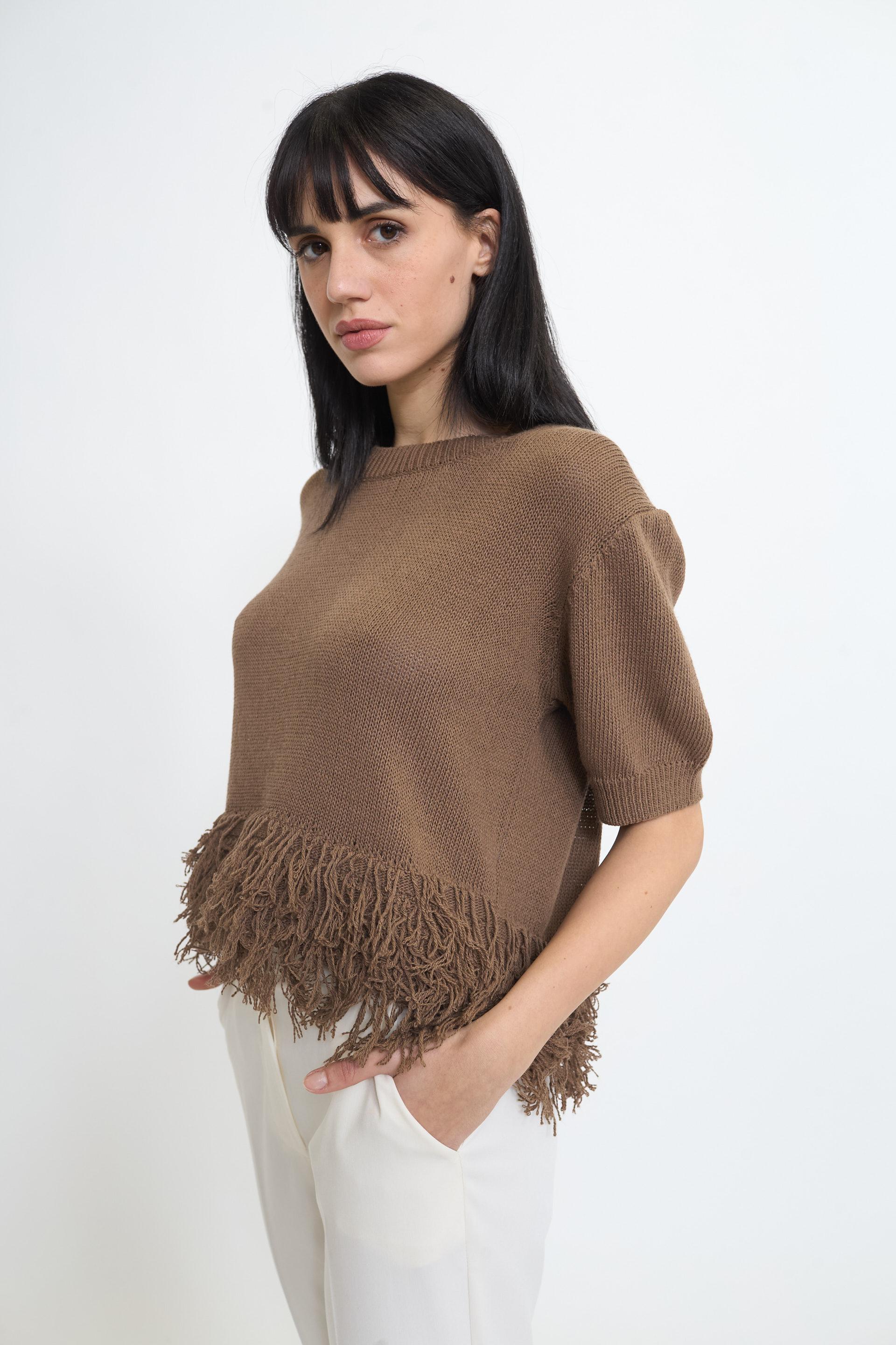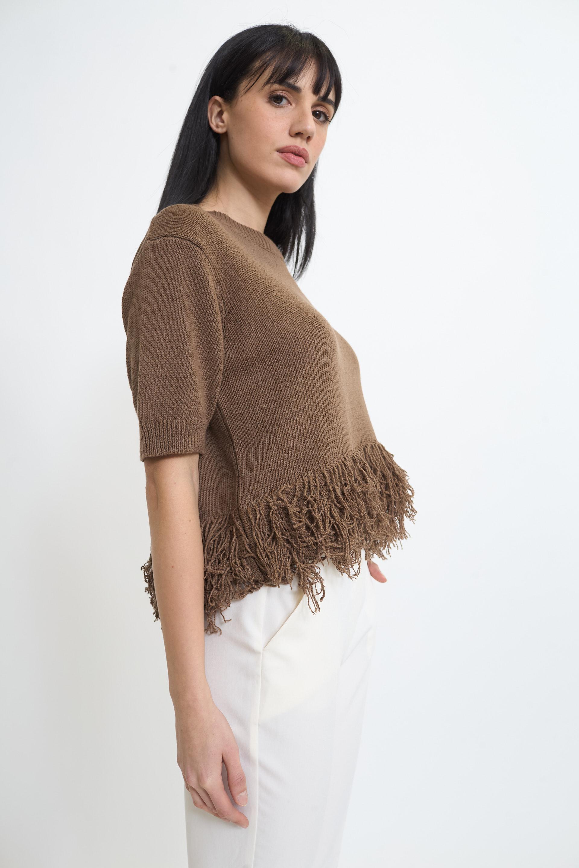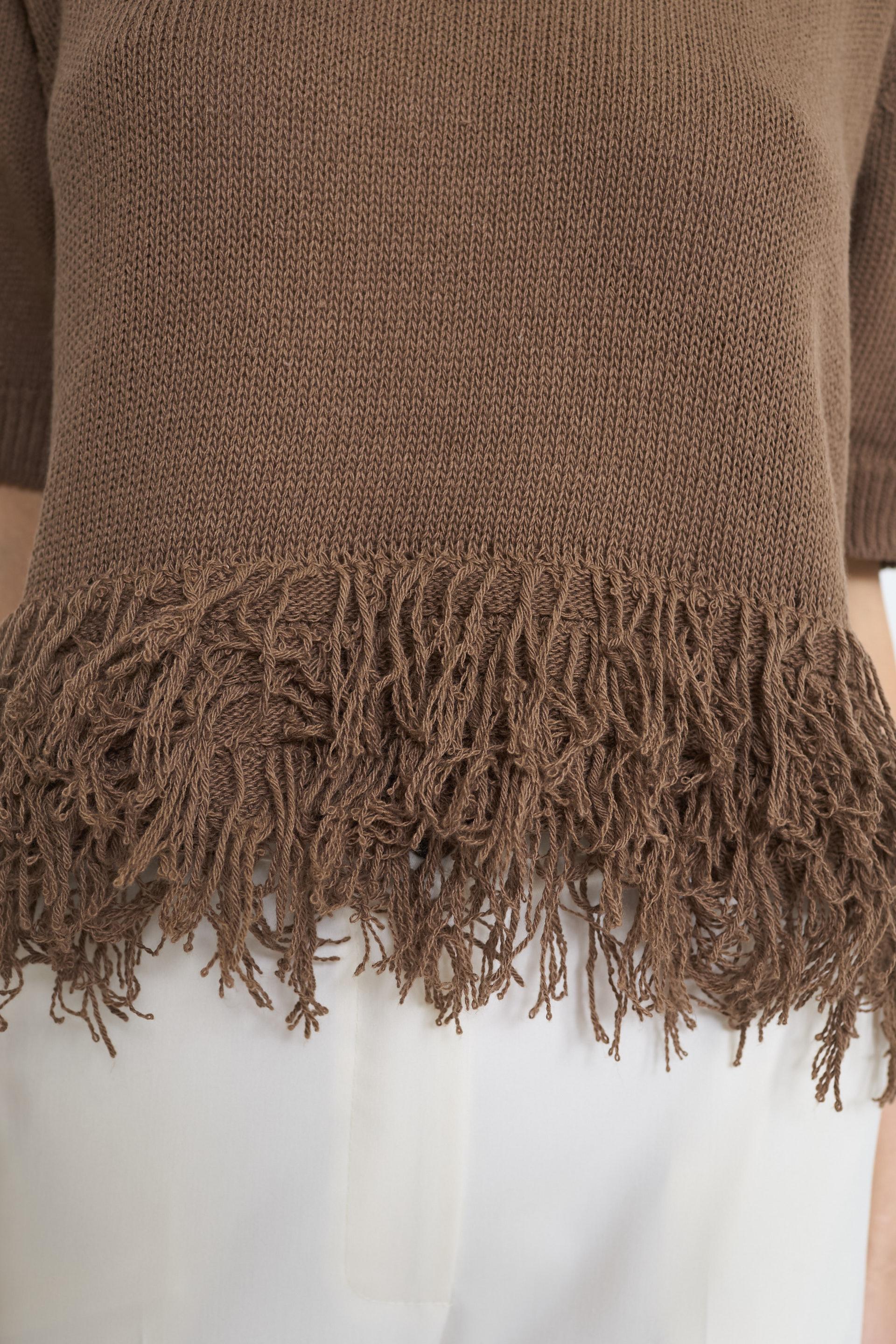 | Maglia girocollo 1/2 manica con dettaglio di frange in orlo. Lavorazione a coste su scollo e fine manica. | ||