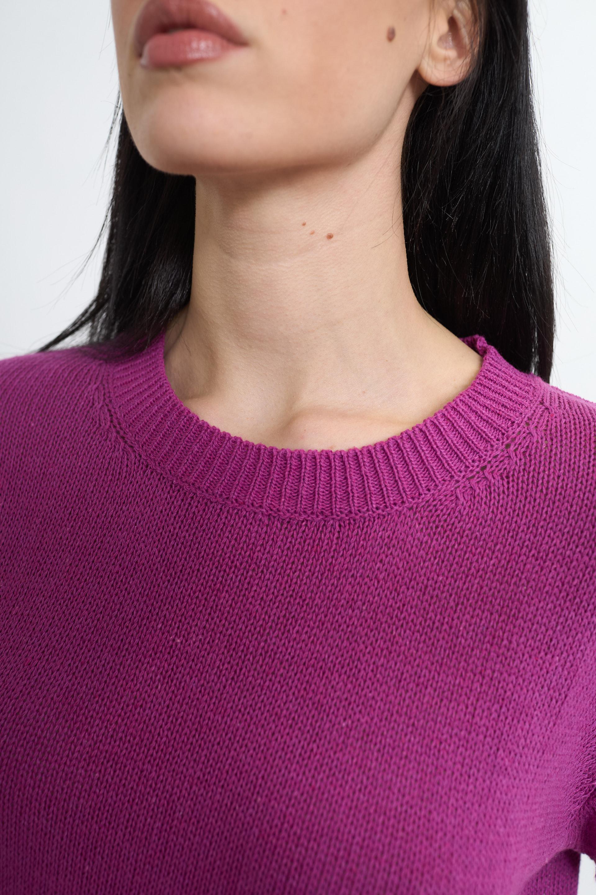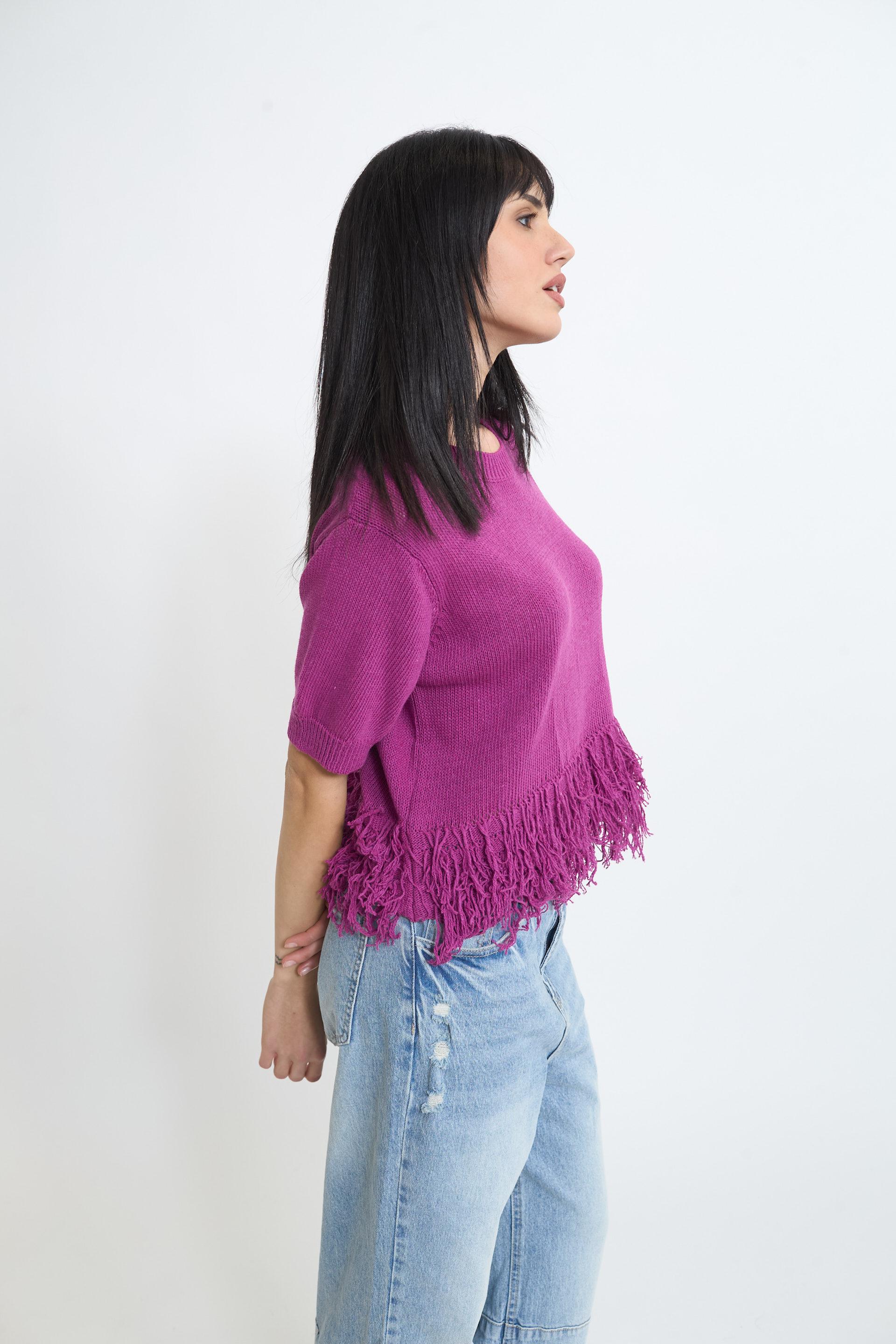 | Maglia girocollo 1/2 manica con dettaglio di frange in orlo. Lavorazione a coste su scollo e fine manica. | ||