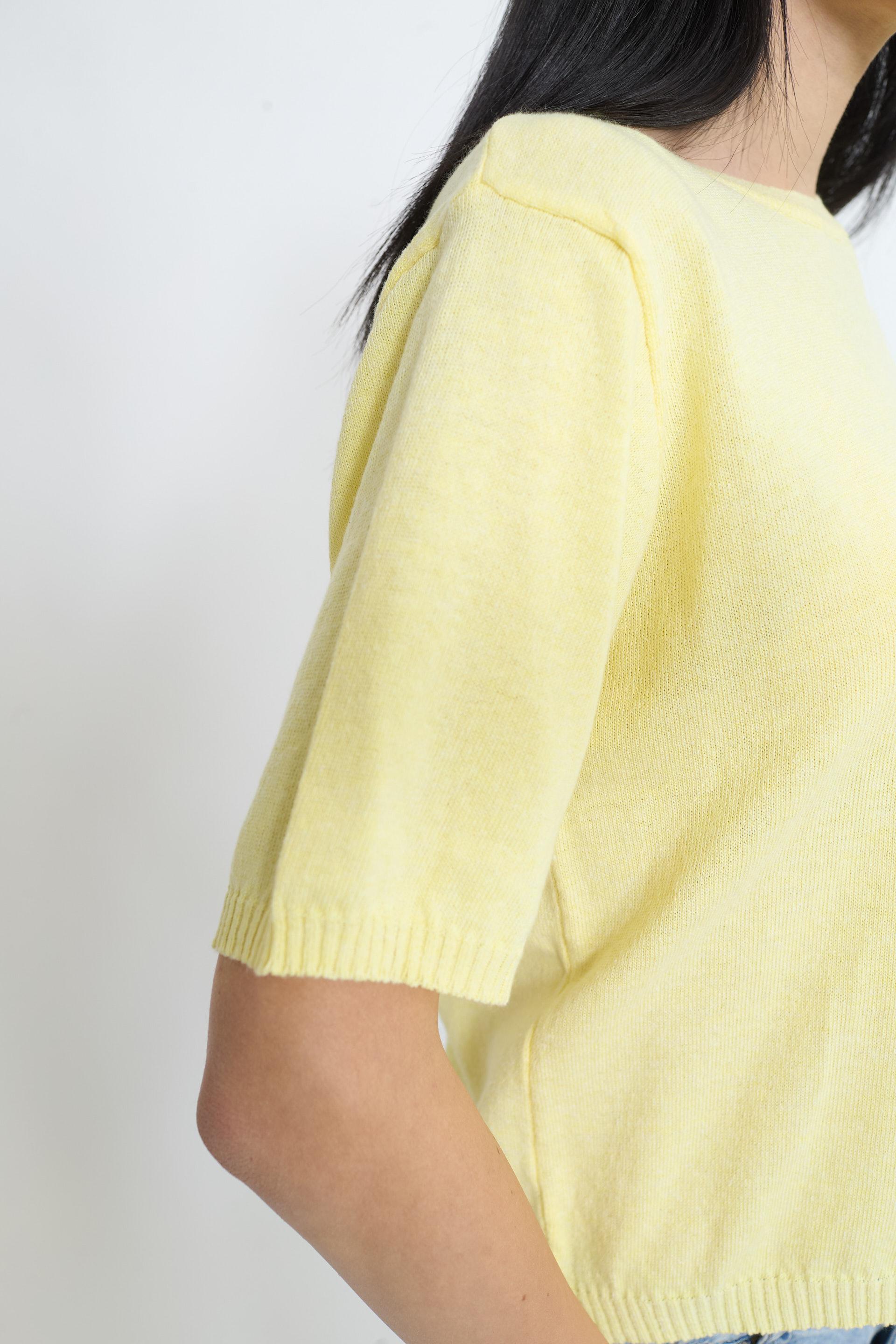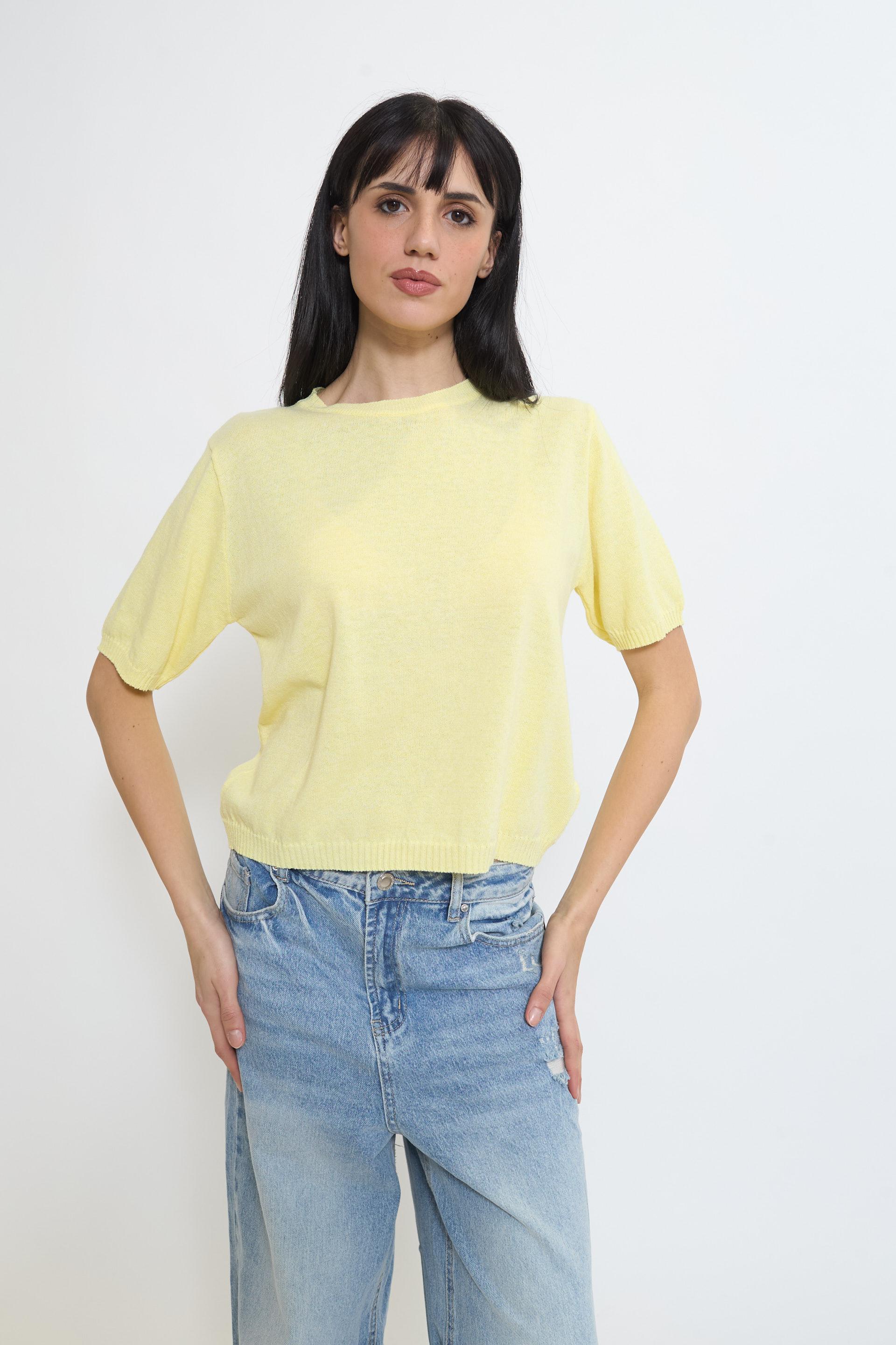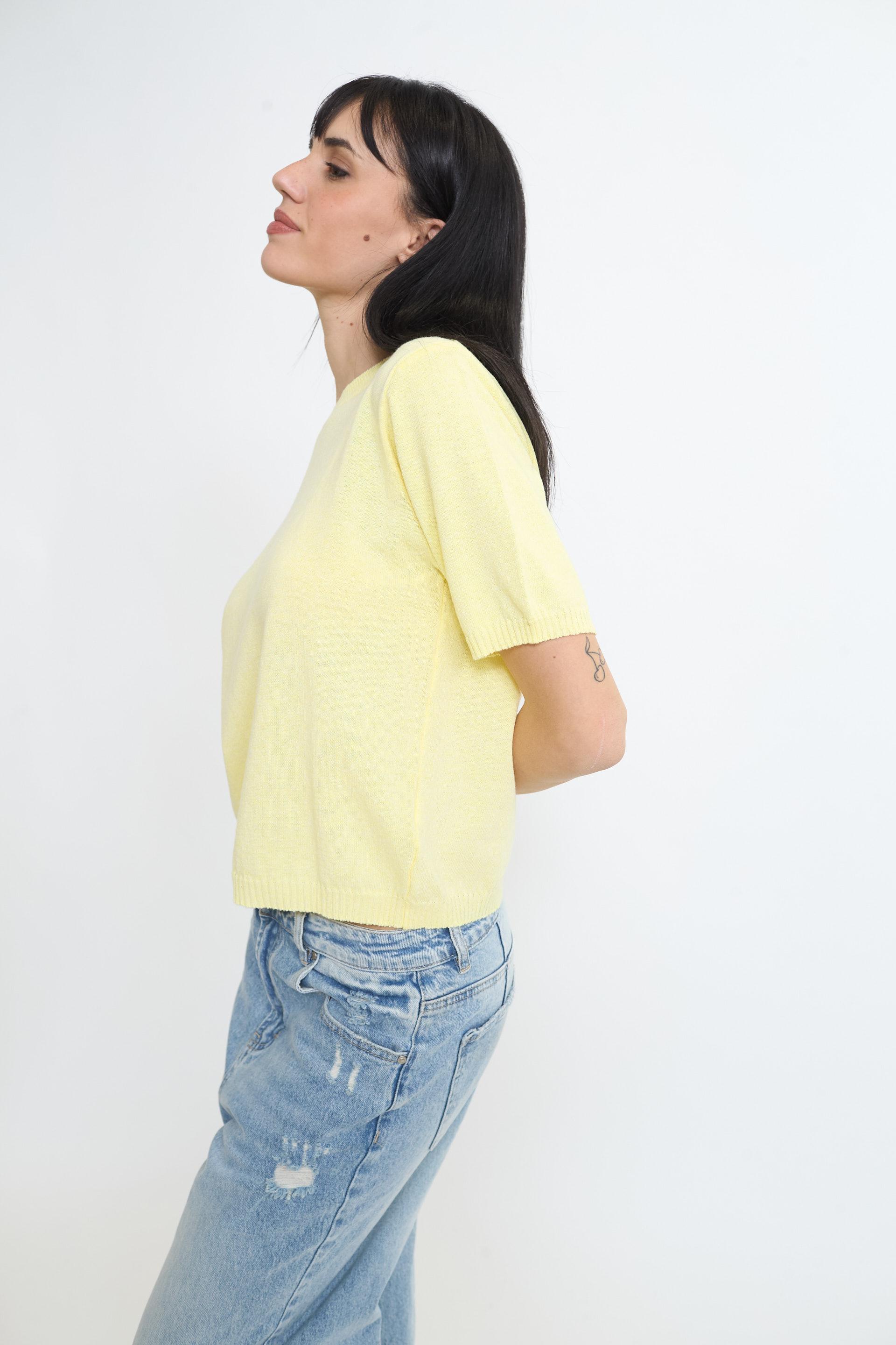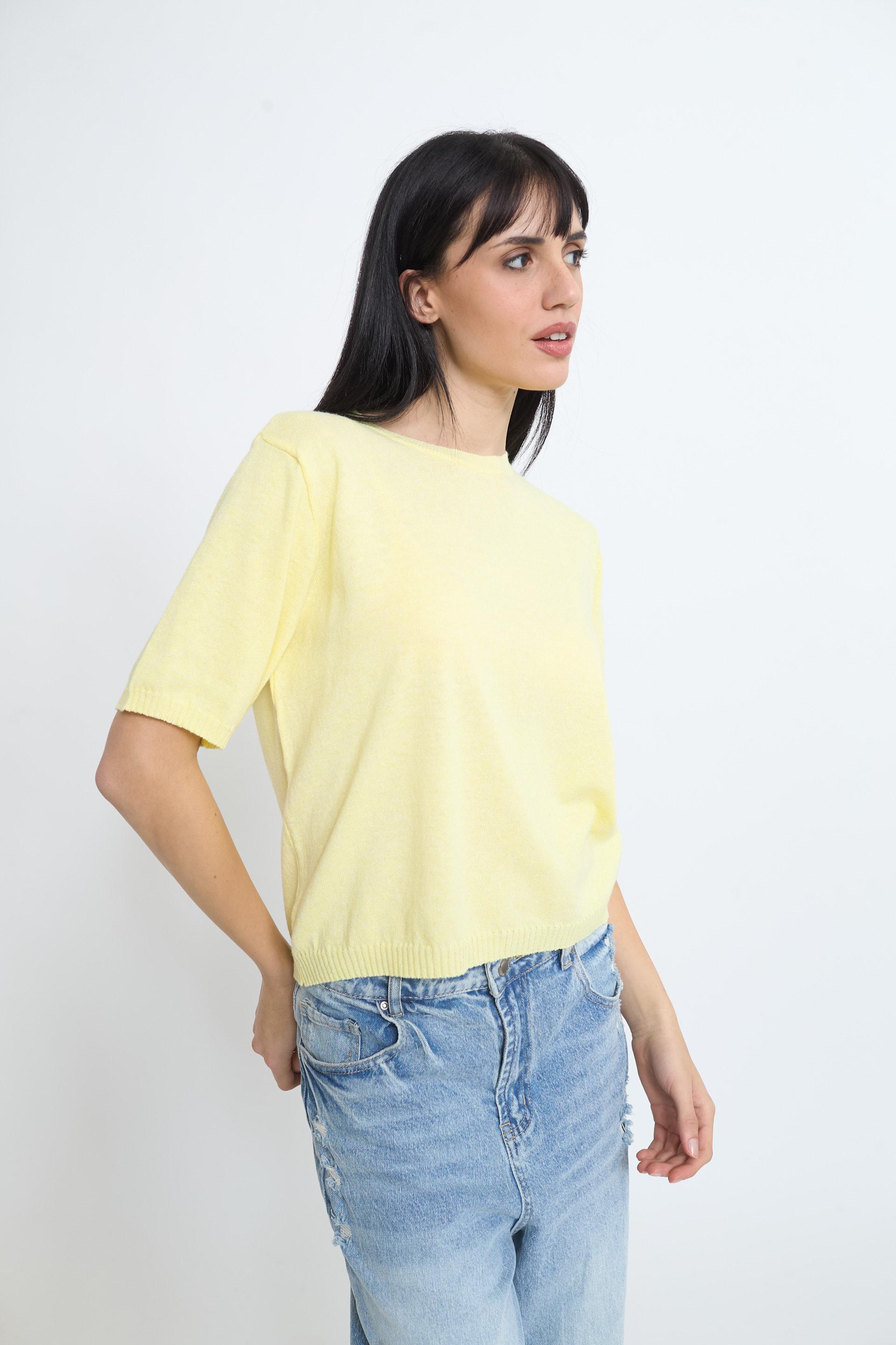 | Maglia girocollo a mezza manica. Lavorazione a coste su collo. fine manica e orlo. | ||