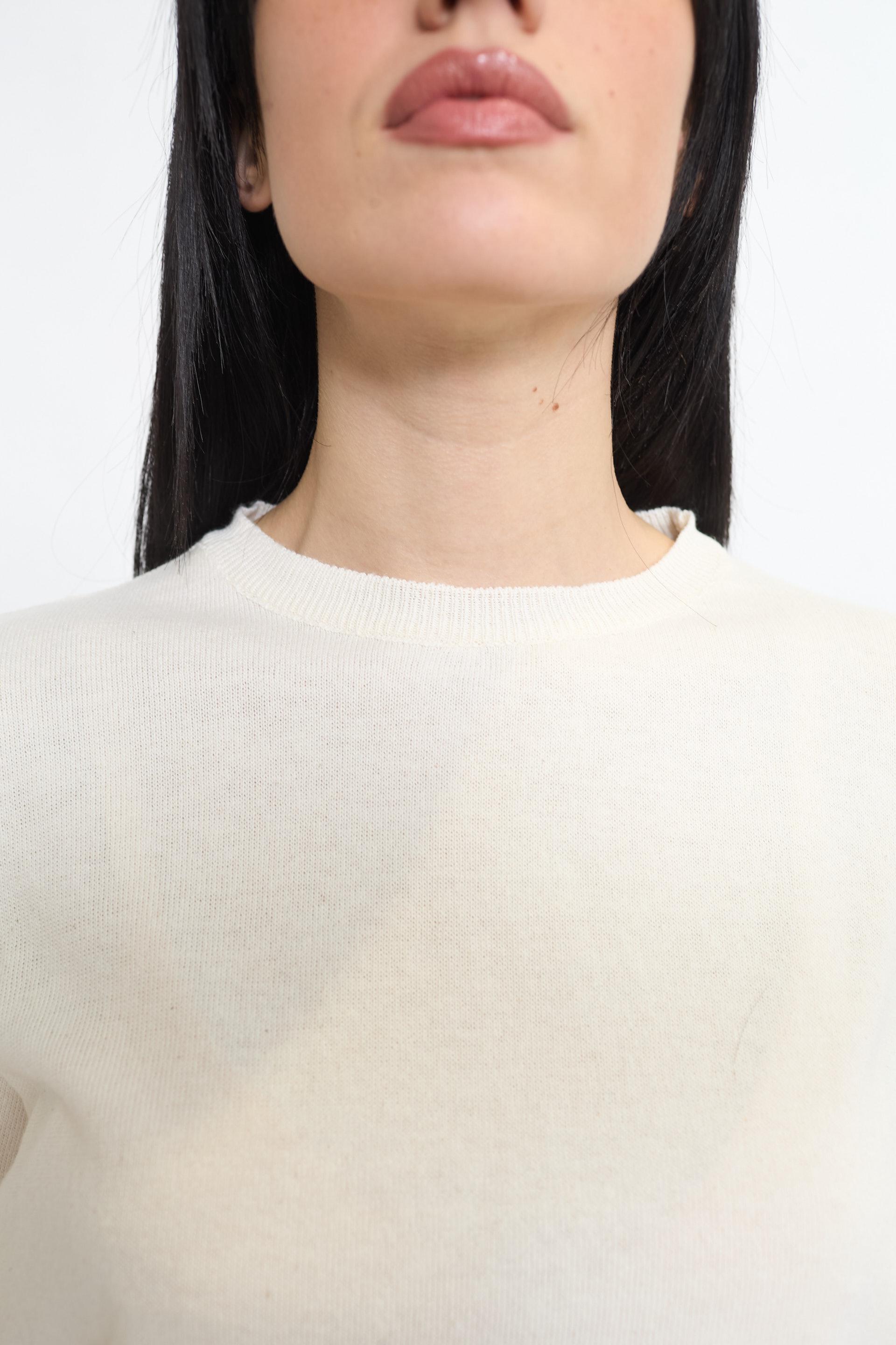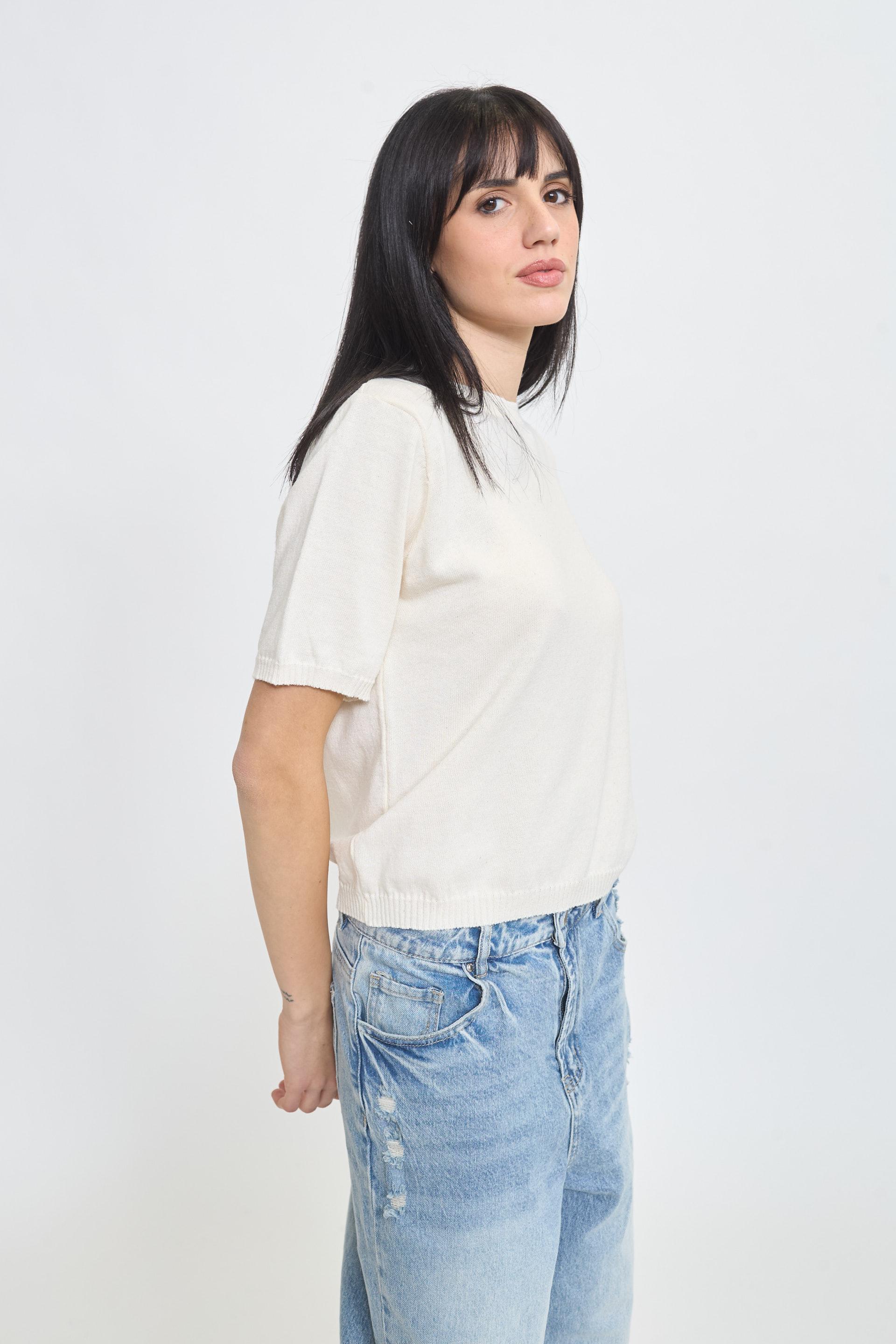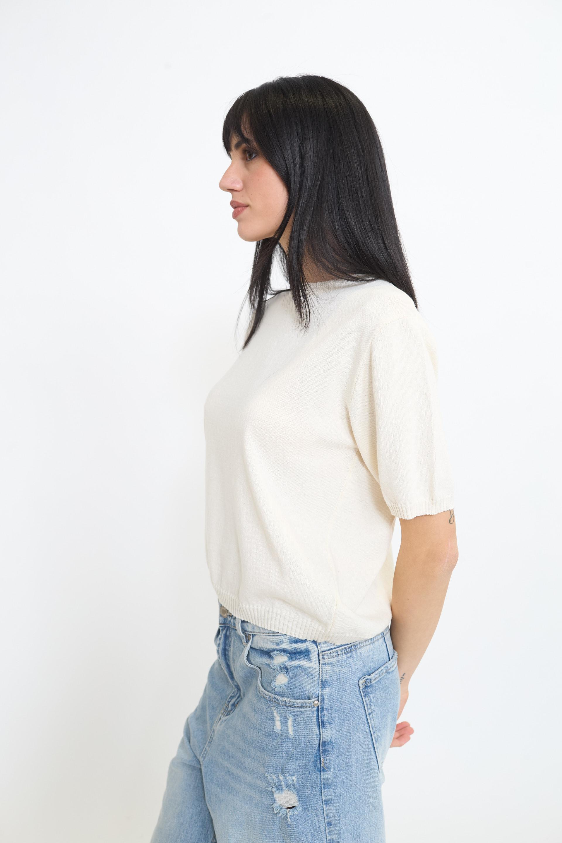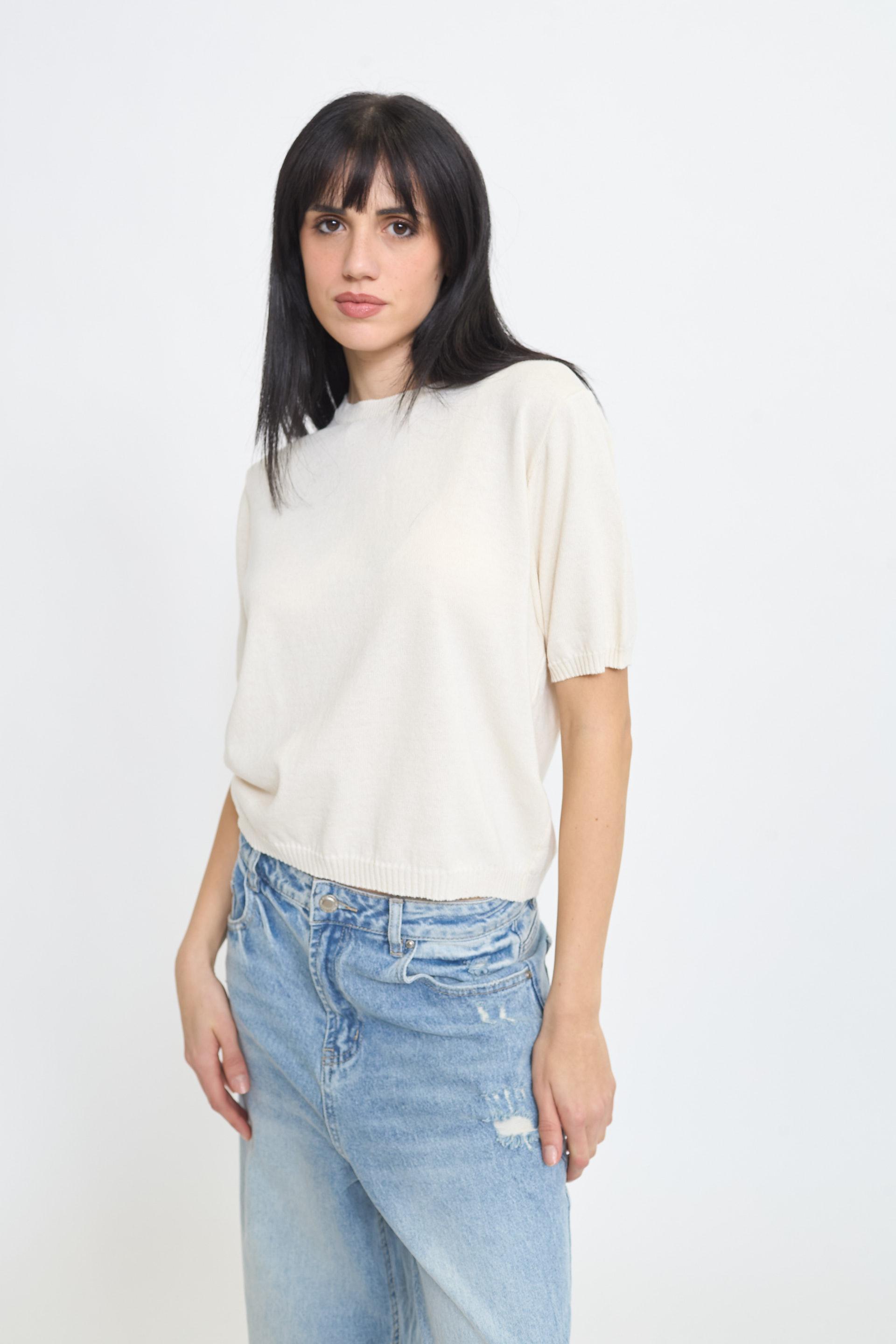 | Maglia girocollo a mezza manica. Lavorazione a coste su collo. fine manica e orlo. | ||