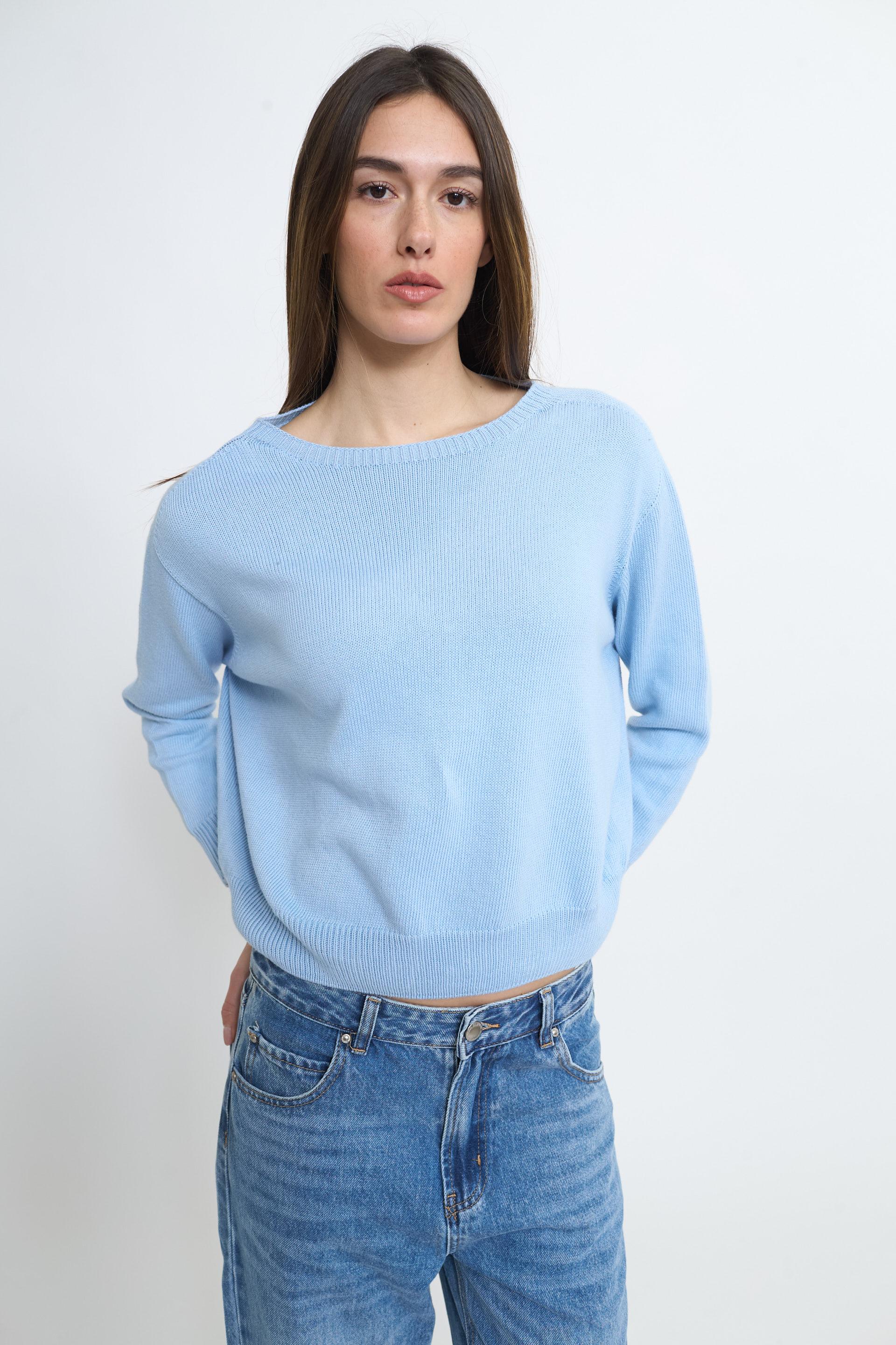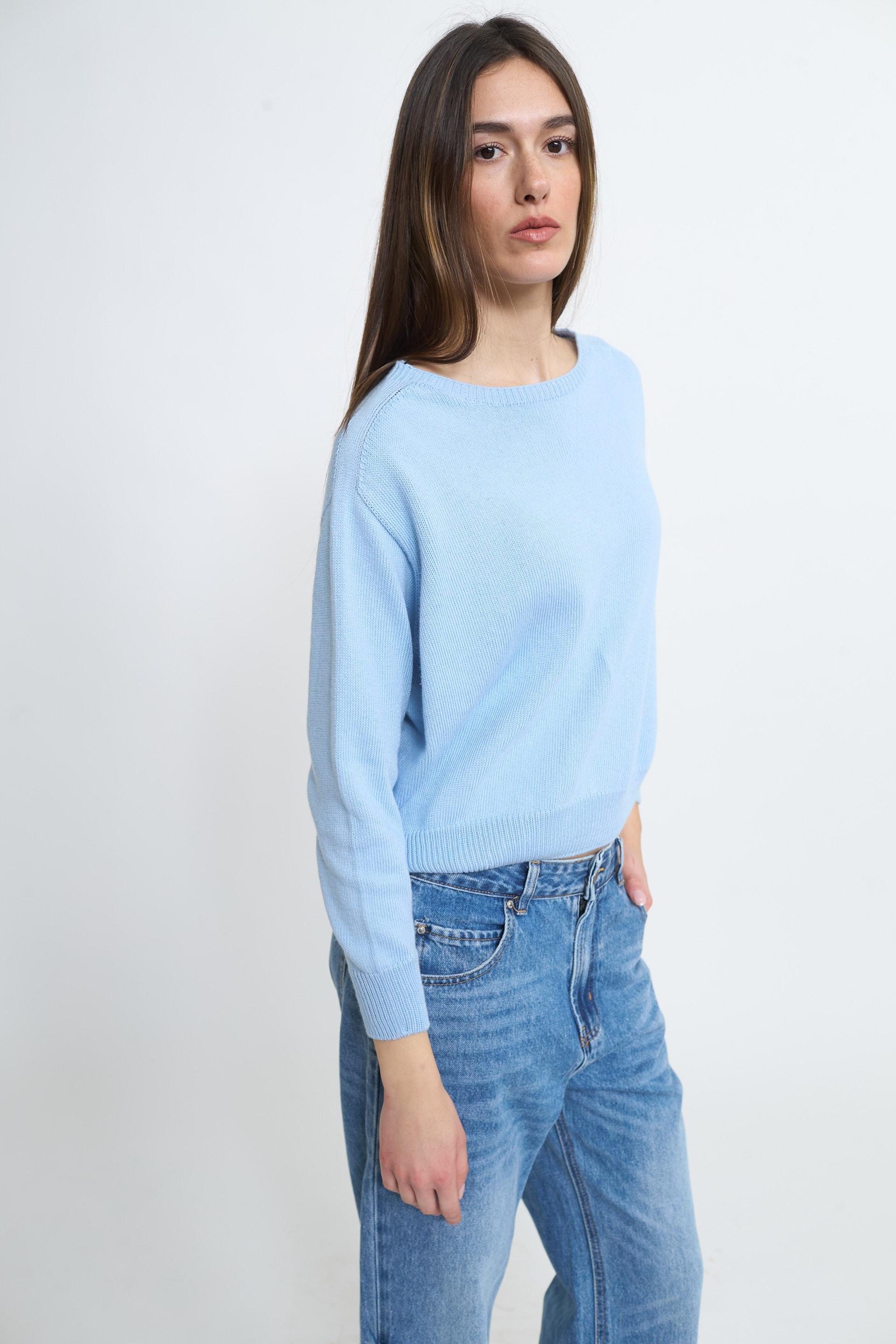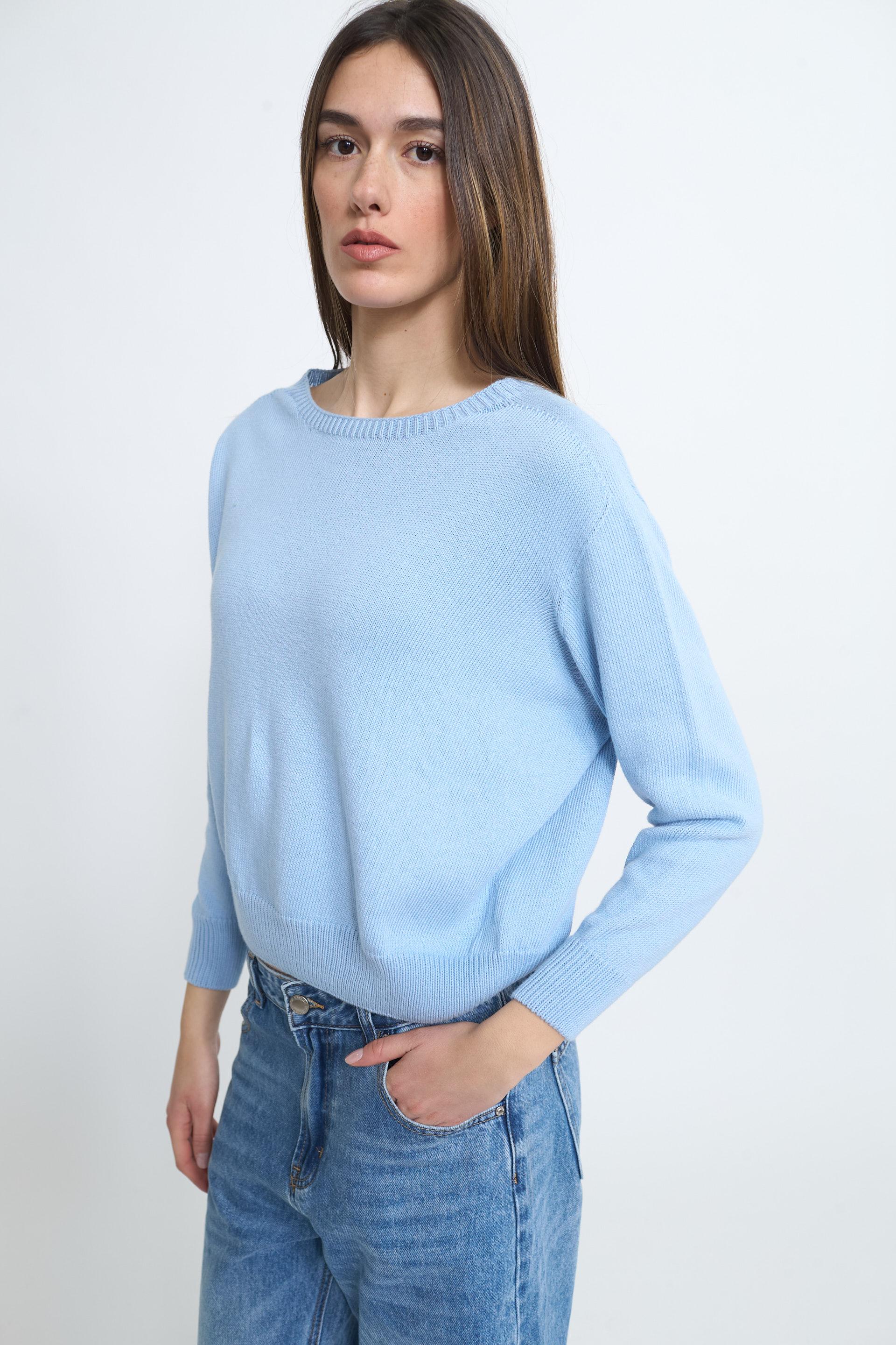 | Maglia paricollo in cotone modello scatoletta. Lavorazione a coste su scollo, polsini e orlo. | ||