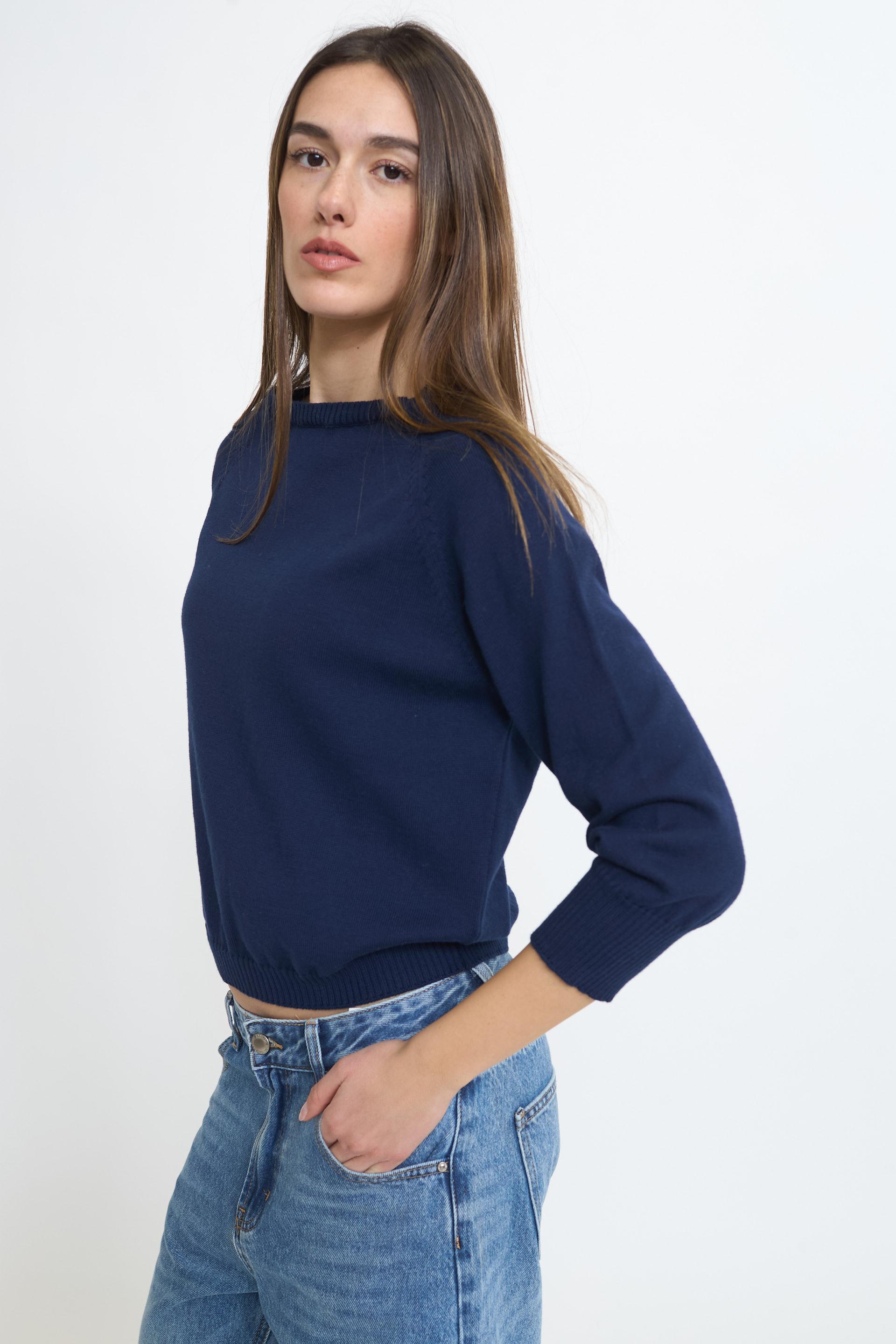 | Maglia paricollo in cotone con manica raglan. Lavorazione a costine su scollo, polsini e orlo. | ||