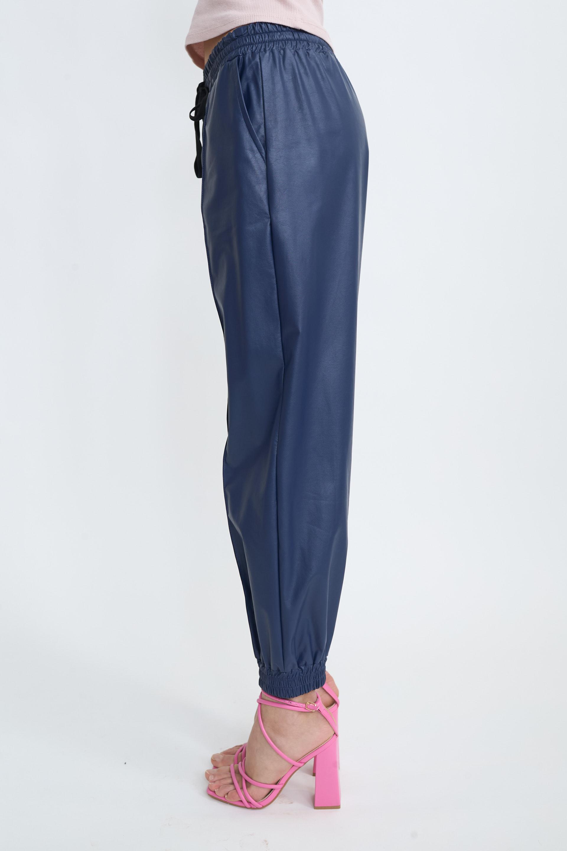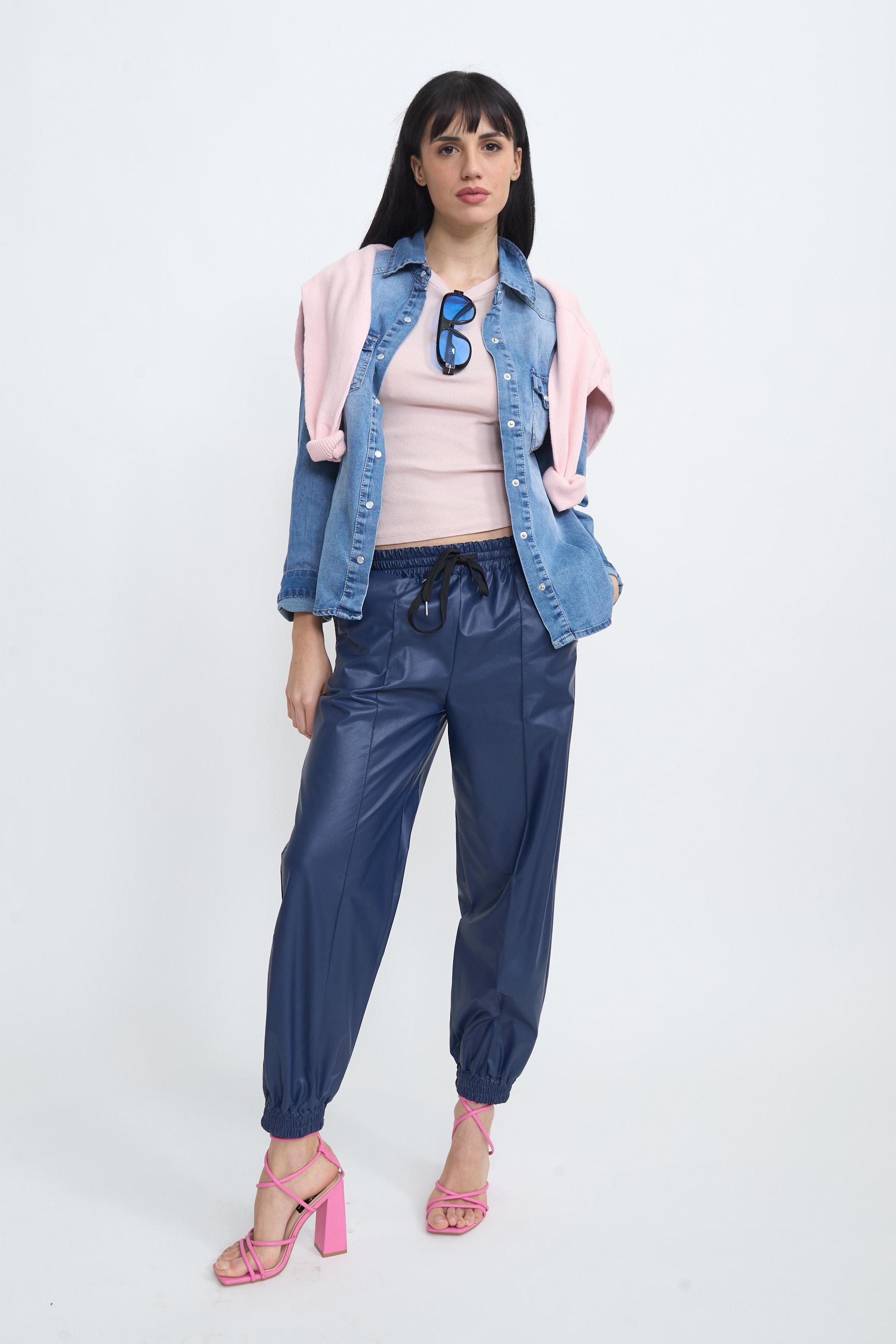 | Pantalone modello jogger effetto pelle con coulisse. Tasche laterali e piega lungo tutta la gamba. | ||