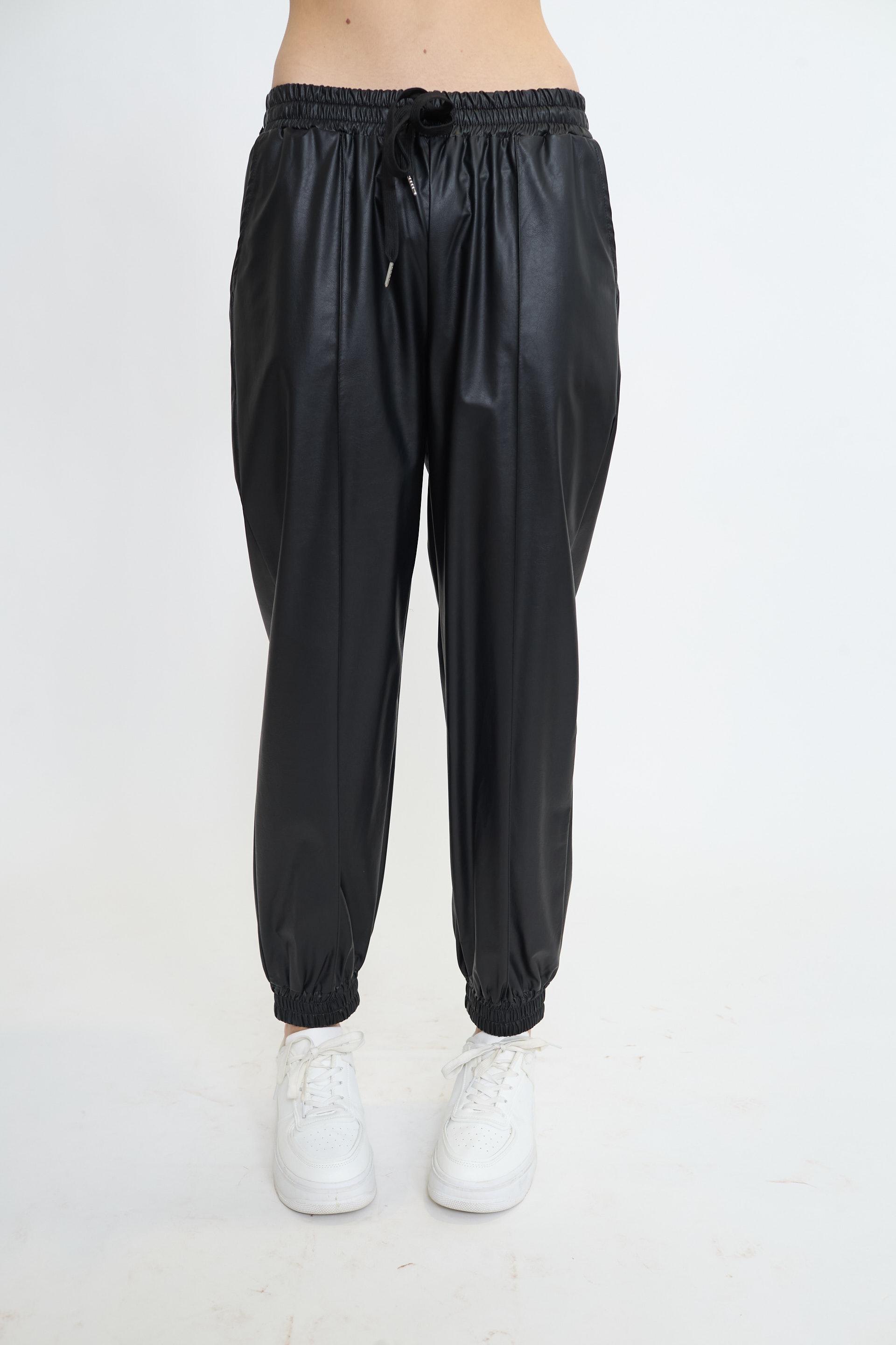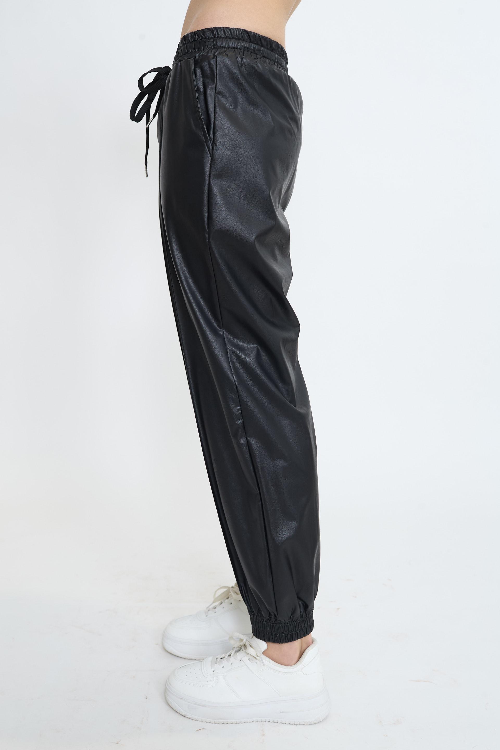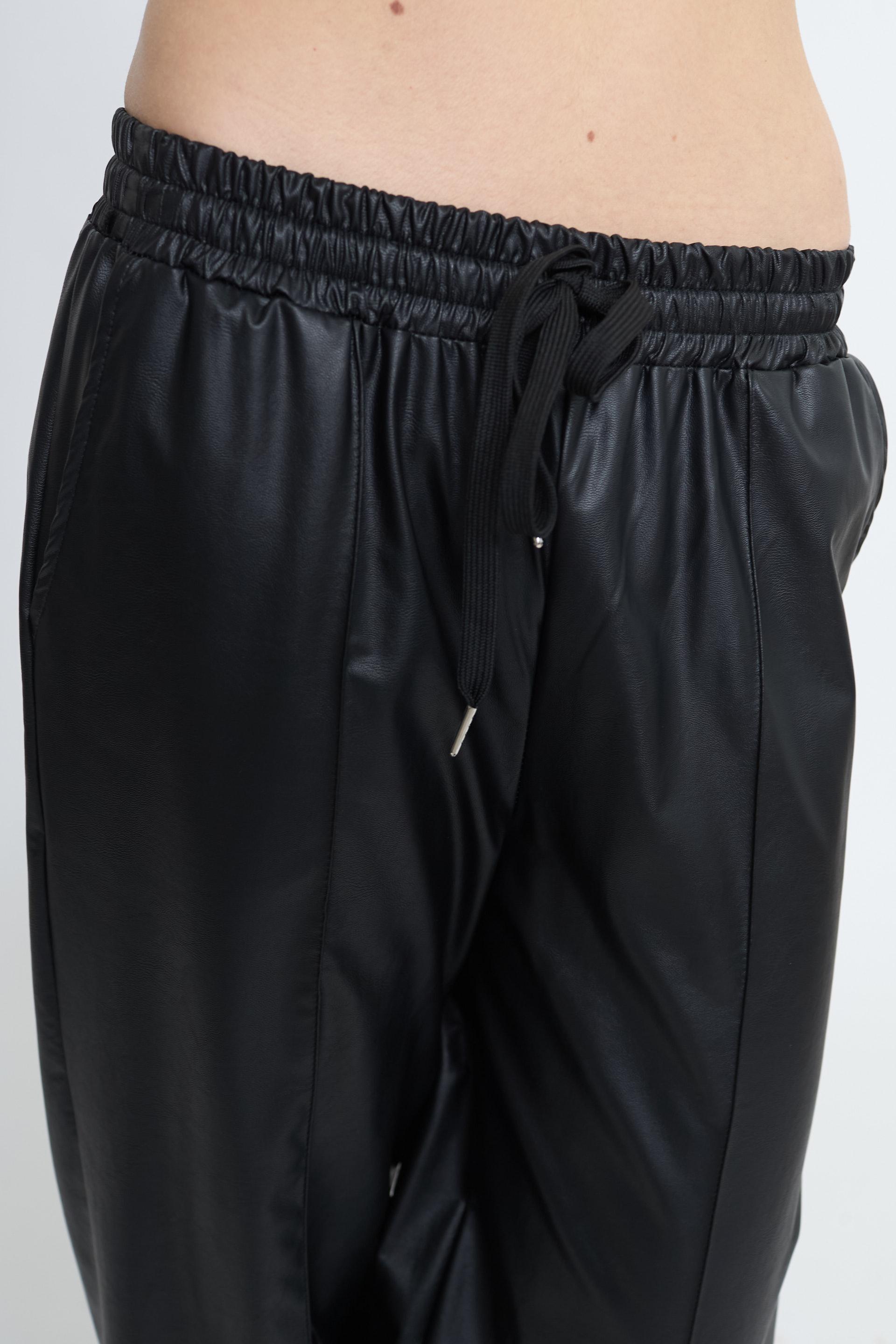 | Pantalone modello jogger effetto pelle con coulisse. Tasche laterali e piega lungo tutta la gamba. | ||