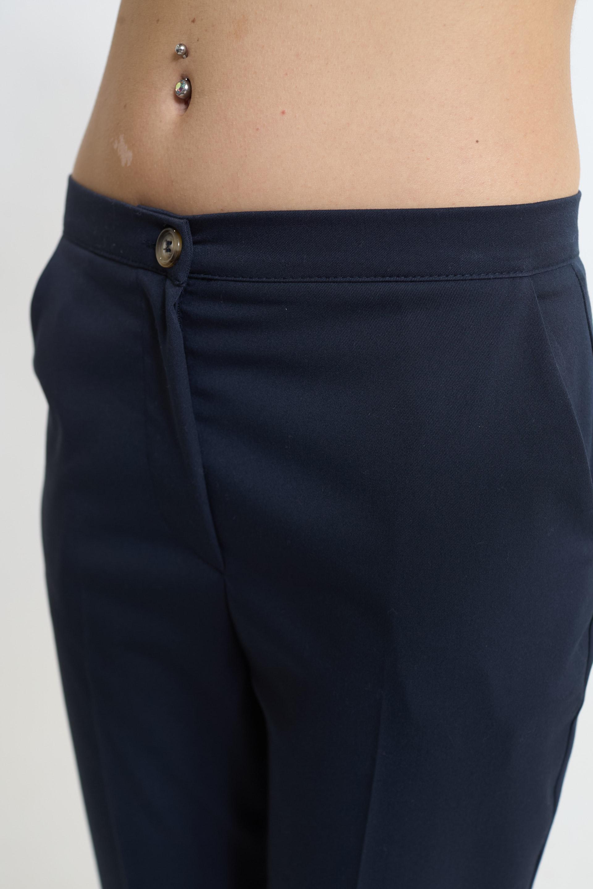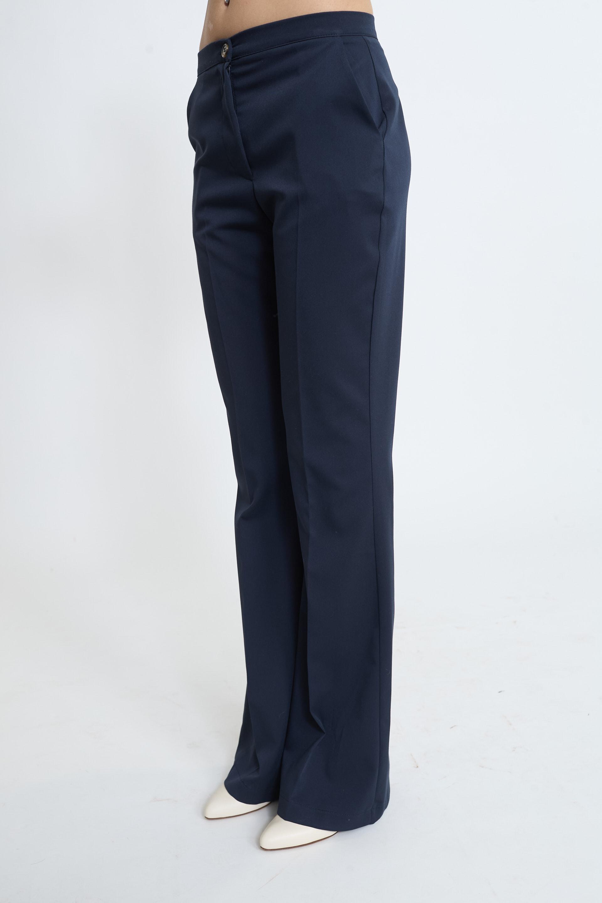 | Pantalone modello flare con tasche laterali e piega su tutta la gamba. Chiusura tramite bottone e cerniera. | ||