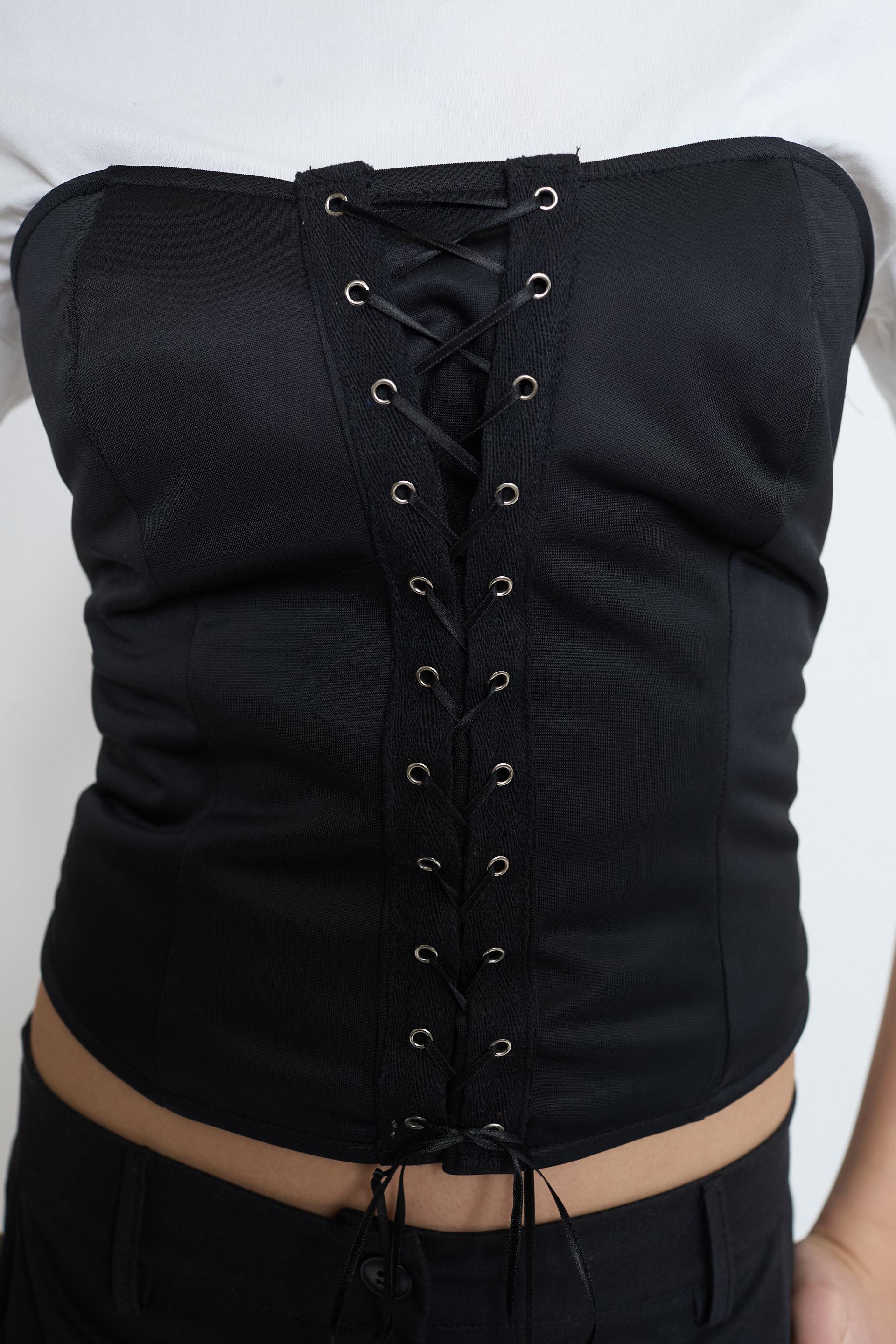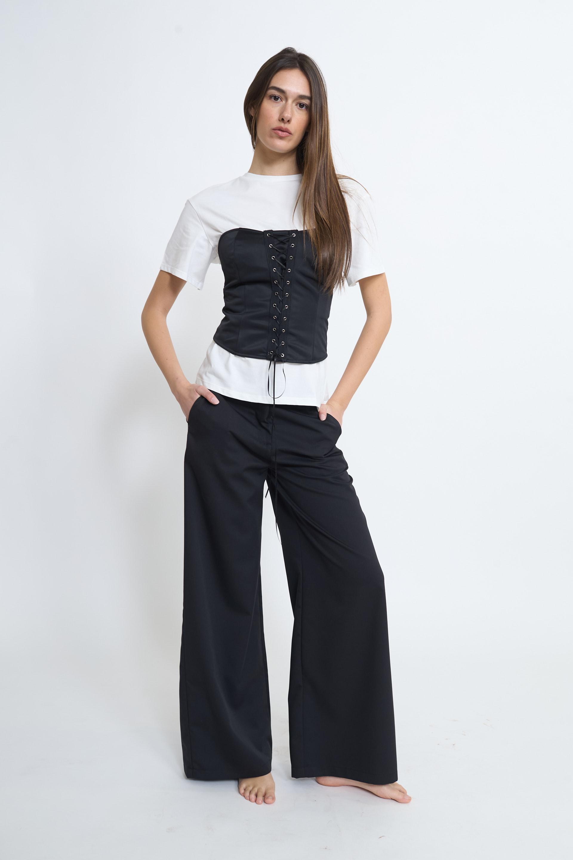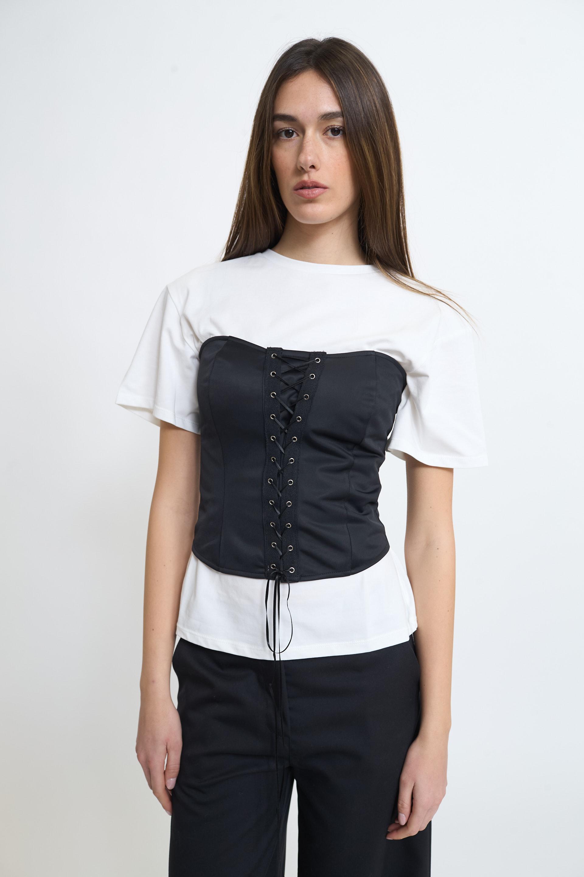 | T-shirt in cotone con bustino removibile in tessuto acetato con zip posteriore e stringhe anteriori. | ||